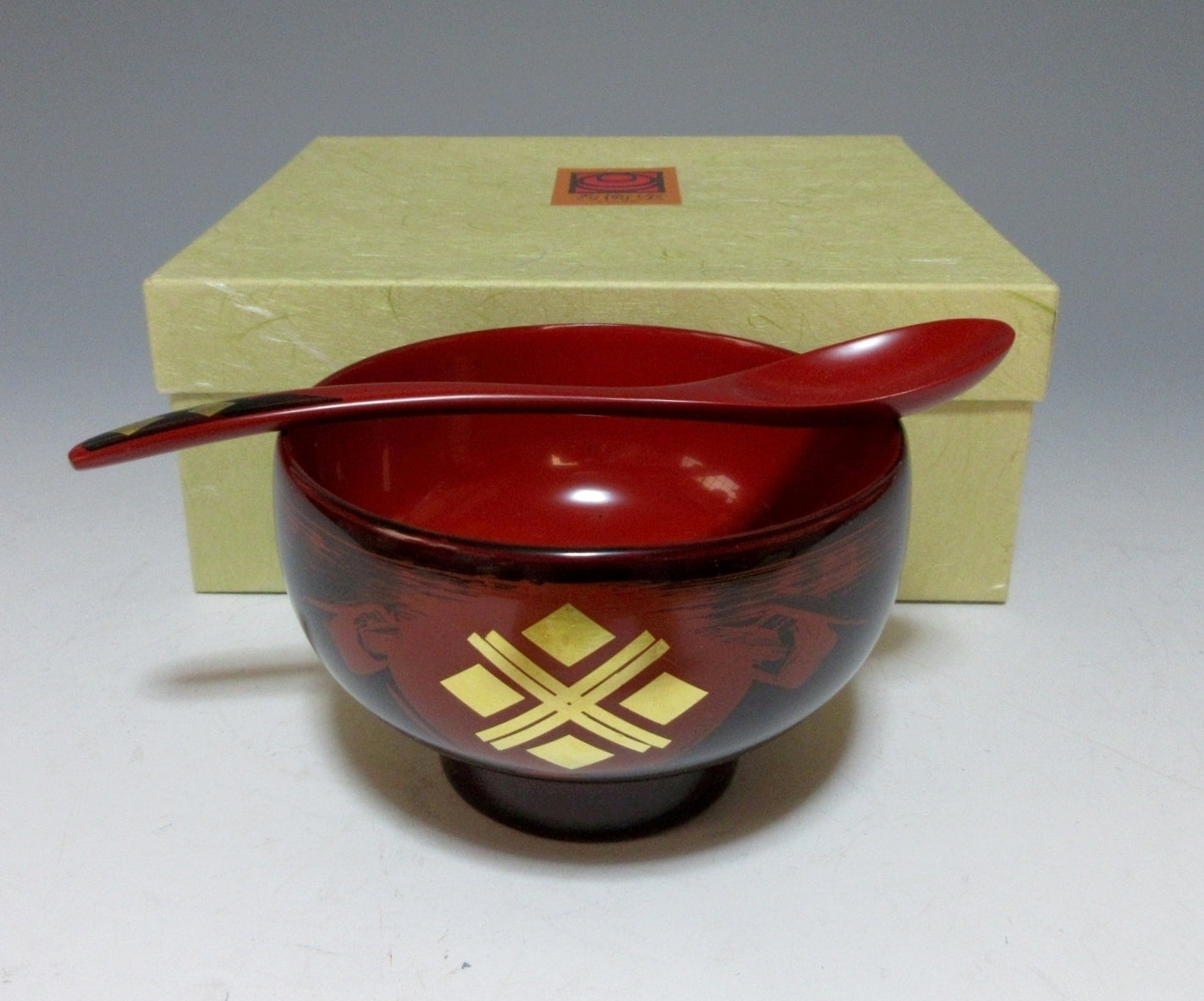 This listing is for a beautiful Hidehira nuri lacquerware bowl with matching spoon made around 20 years ago. They are made of wood and both pieces are decorated with a gold diamond pattern over a red and black lacquered background. They come with their original paper storage box, as well as a Japanese language profile paper about Hidehira lacquerware.