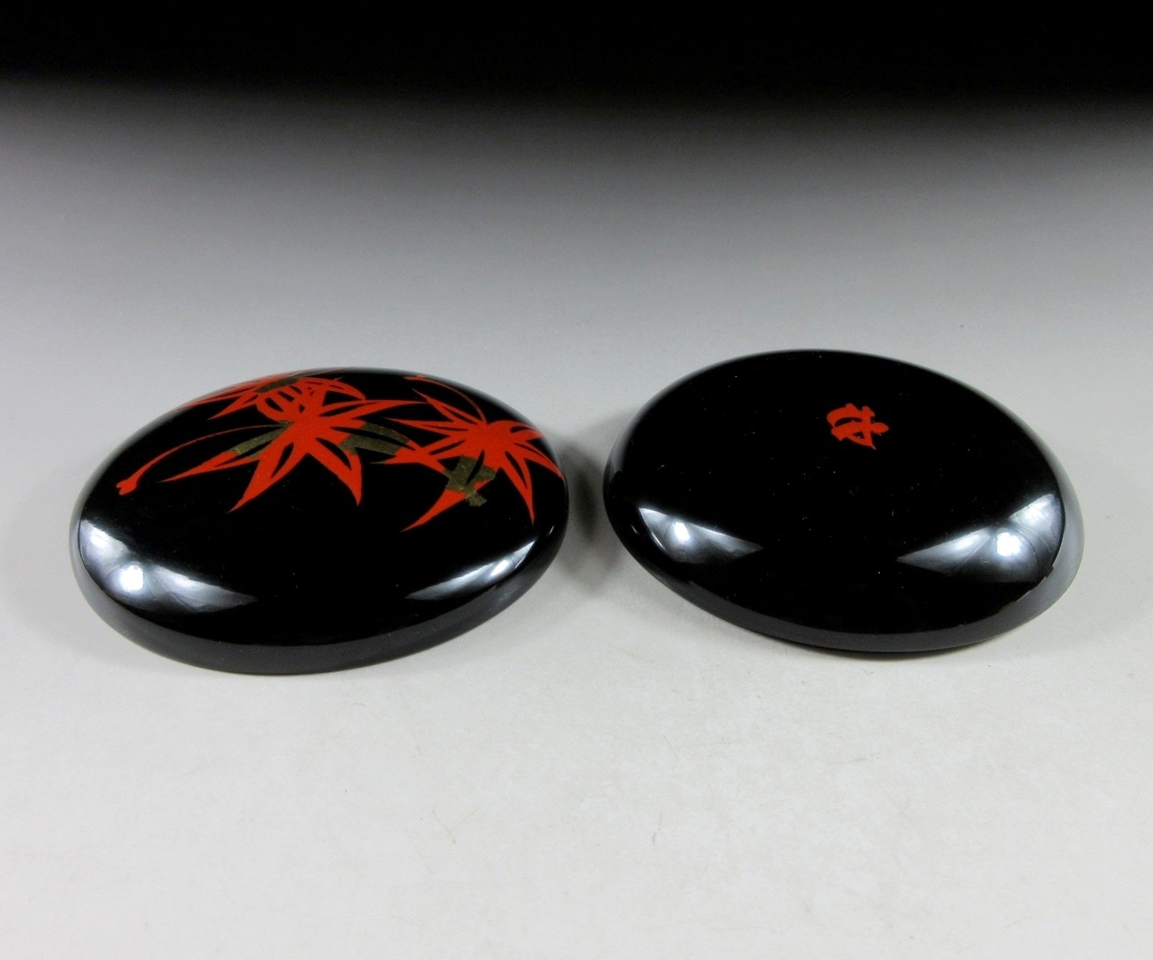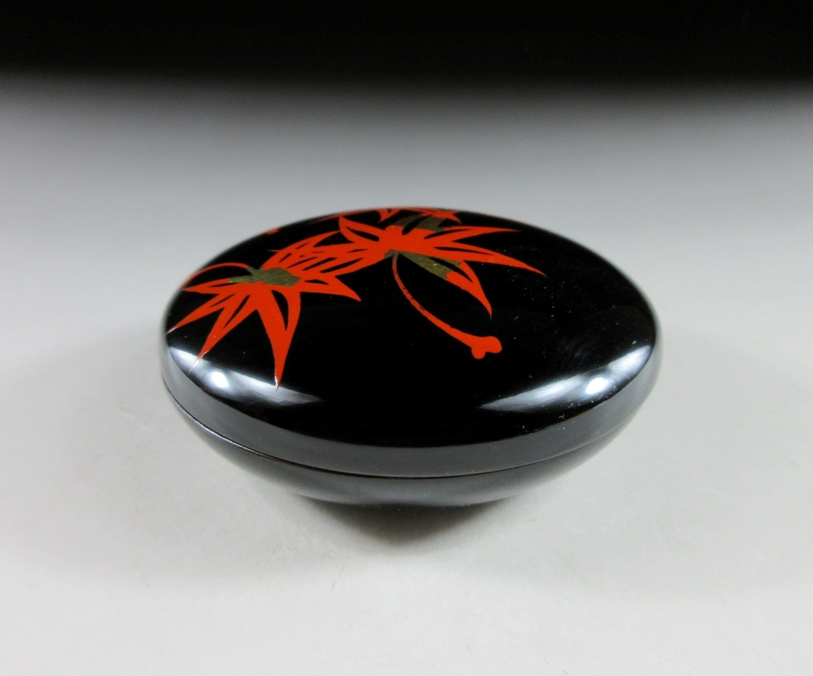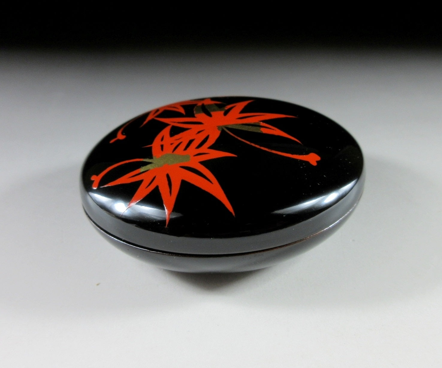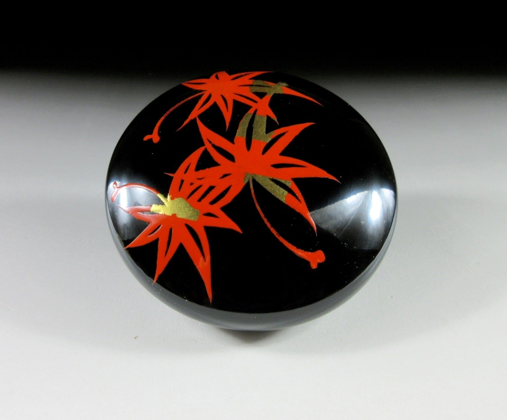 This listing is for a vintage Hidehira-nuri kogo made around 30-40 years ago. It is made of wood coated in glossy black lacquer, and the lid is decorated with red and gold momiji leaves. This particular kogo is thin and better suited to holding the woodchip type of incense. It comes with its original signed wooden storage box and a yellow wrapping cloth for when the item is not in use.