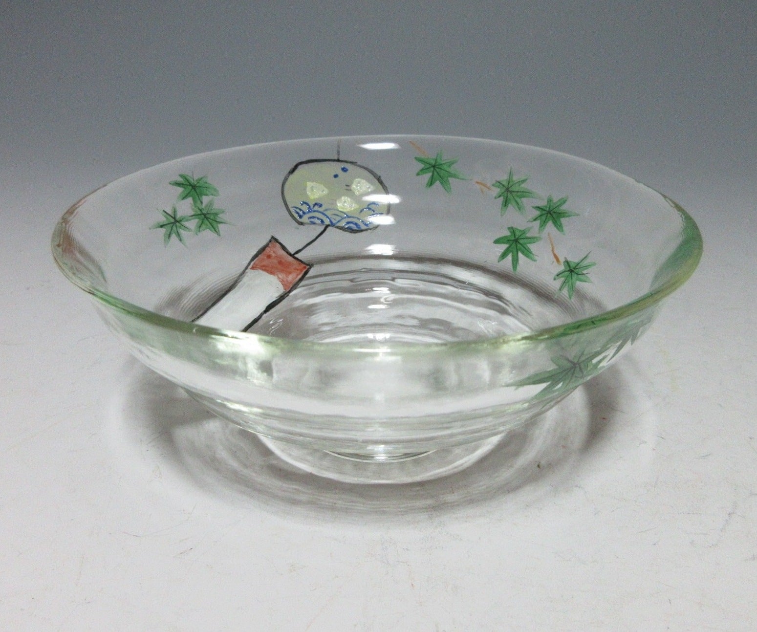 This listing is for a giyaman chawan made around 5 years ago by Hirohata Kunihiko. It is made of glass and is the flat hira type used during the summer season. Hira chawan are shallow bowls with low sides designed to cool tea down faster. The bowl in this listing is decorated with a glass ‘furin’ wind chime and green kaede leaves, and the wind chime is decorated with small plovers. It comes with its original paper storage box.