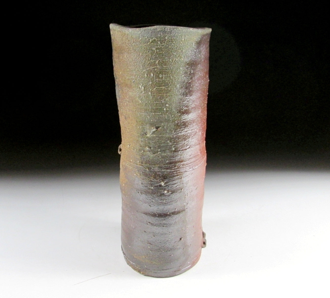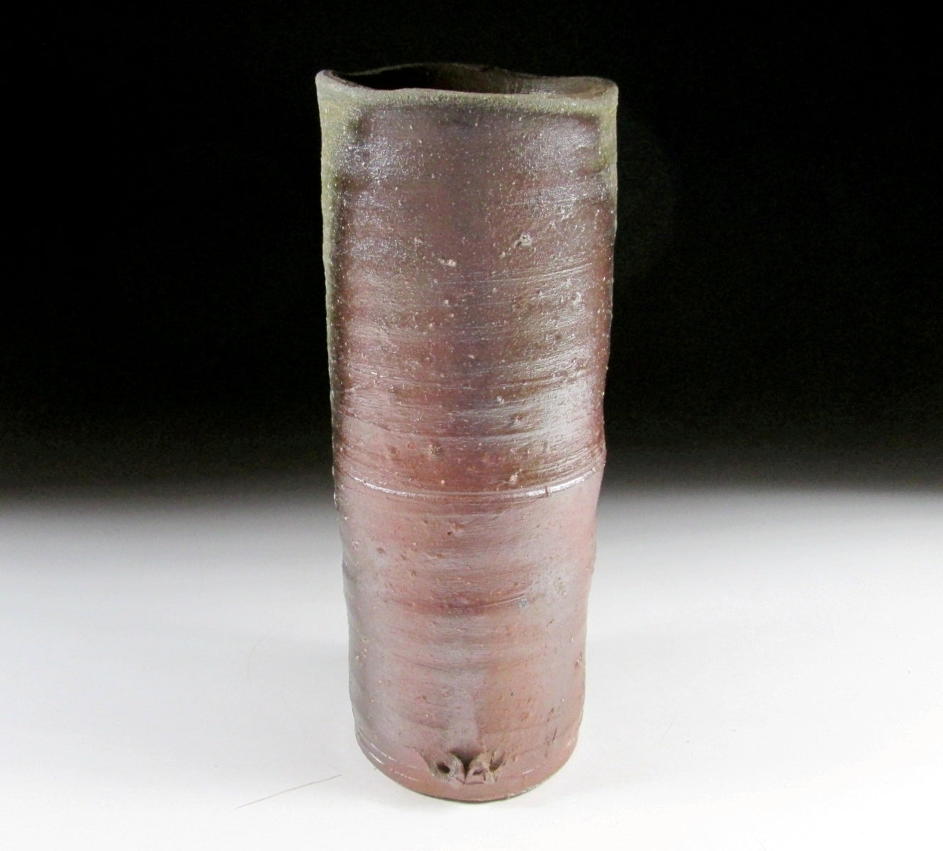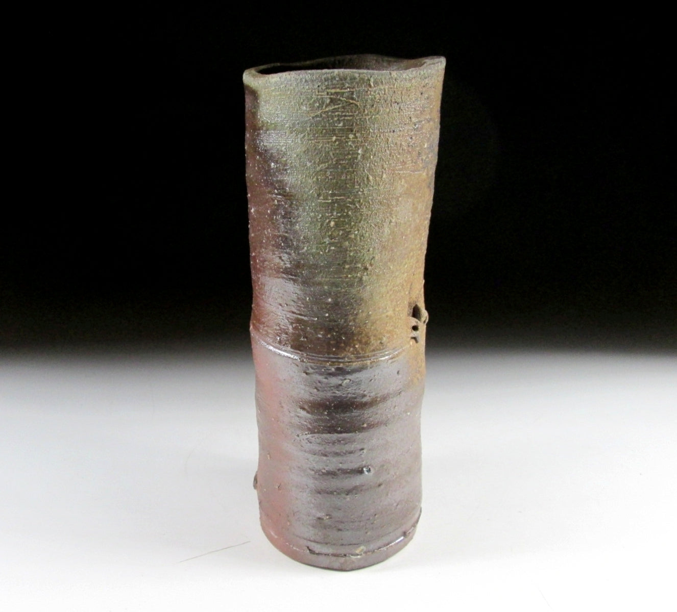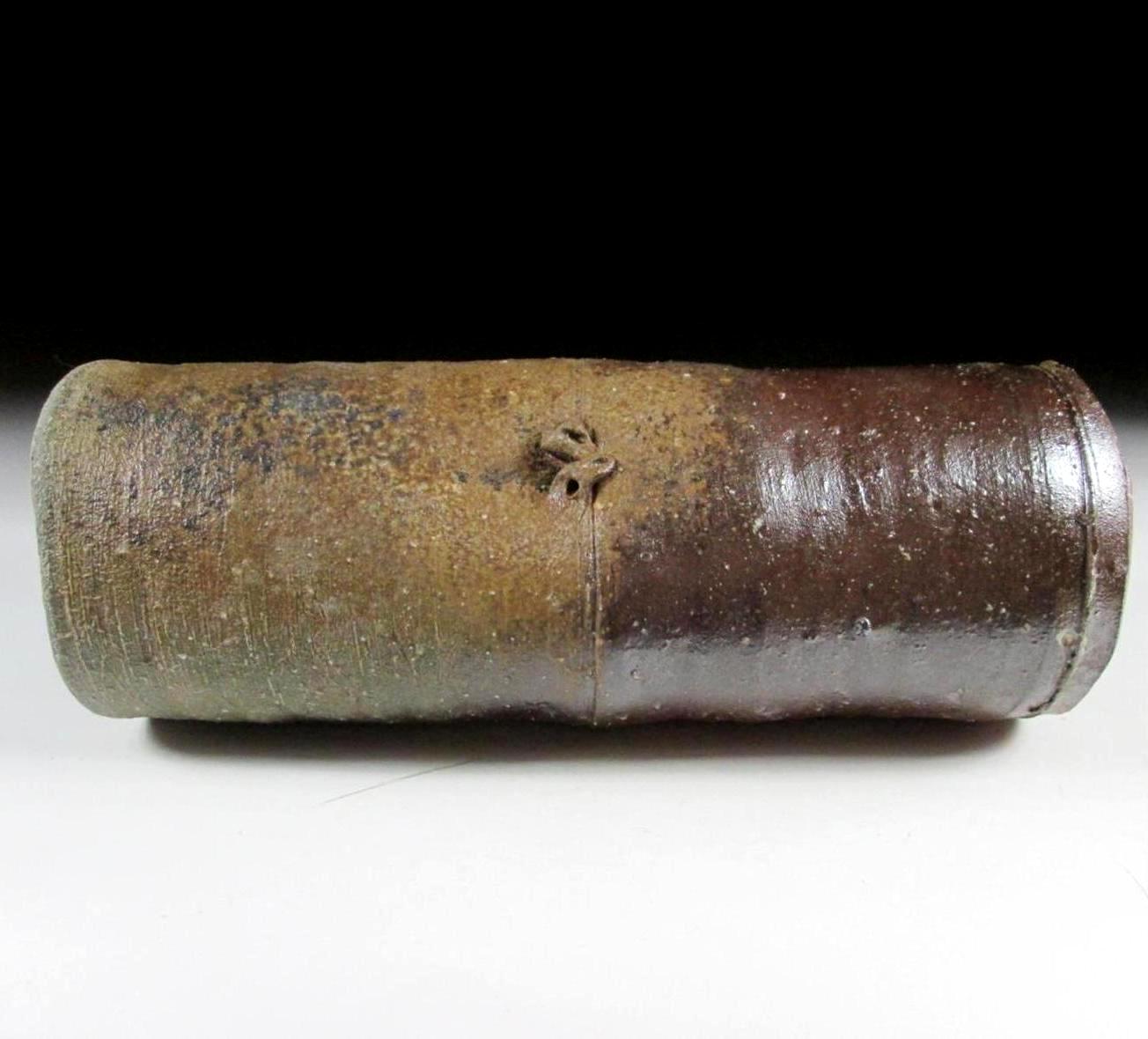 This listing is for a wood-fired Bizen-ware vase made around 20 years ago by Hisamoto Koichi. It is wheel-thrown and fired in a noborigama chamber kiln. This particular type of Bizen-ware is known as the ‘goma’ sesame type, because of the light brown colour on the surface resembling sesame seed paste. This colouring is the result of red pine ash melting on the piece’s surface during the firing process. Also the uneven shape of the vase is meant to resemble bamboo complete with small notches and a joint around the middle. The signature of the potter can be found on the bottom, and it comes with a Japanese language profile paper.