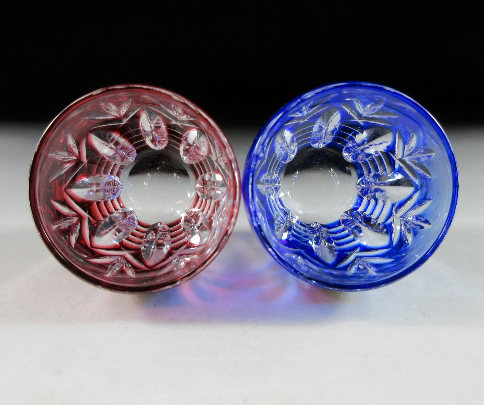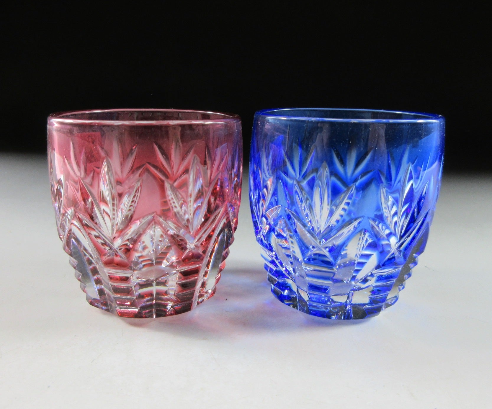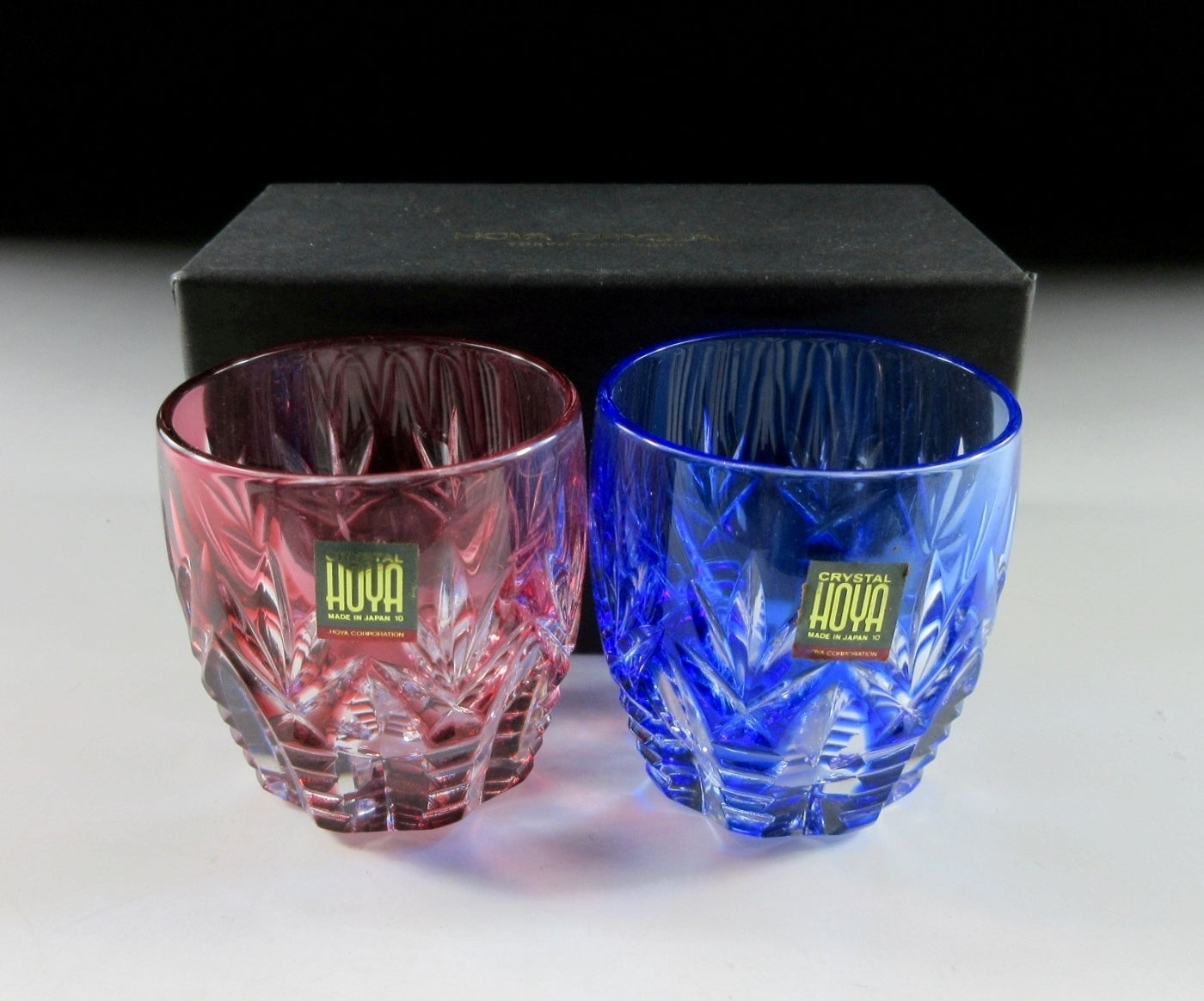 This listing is for a pair of Kiriko faceted glass sake cups made around 20-30 years ago. They feature a sasa-no-ha pattern, a pattern imitating bamboo leaves. One glass is slightly taller than the other, but both have the same shape and pattern. Kiriko glass if cared for properly will last for many, many years. They come with their original paper storage box.