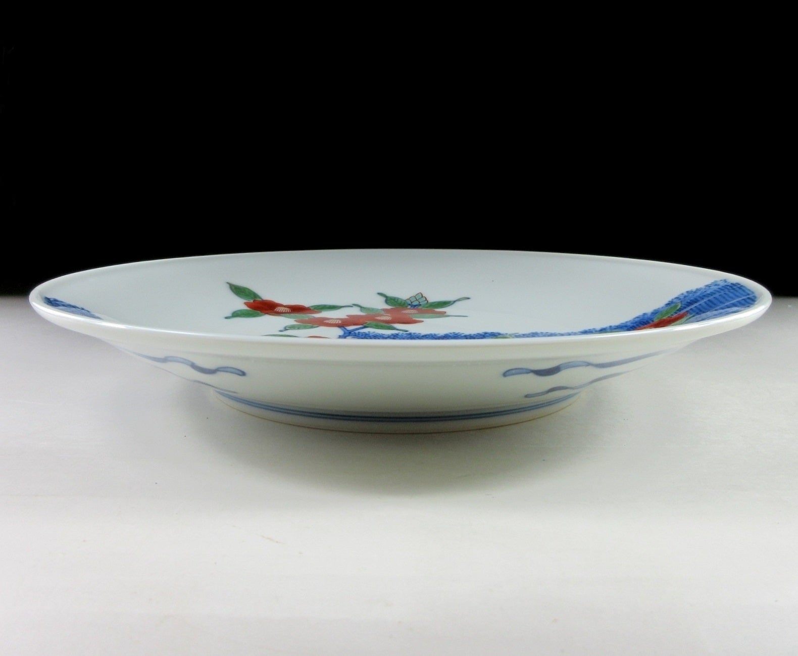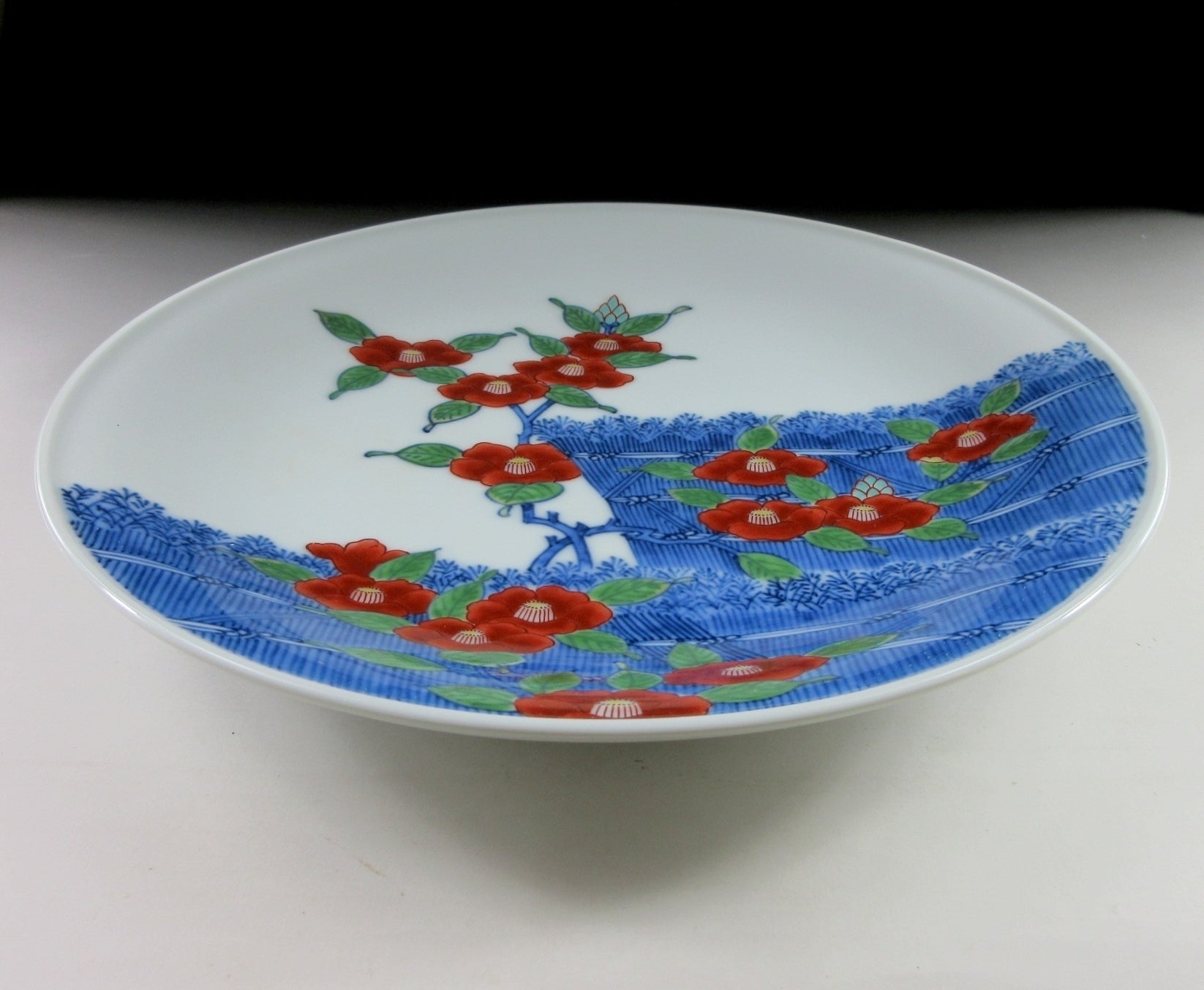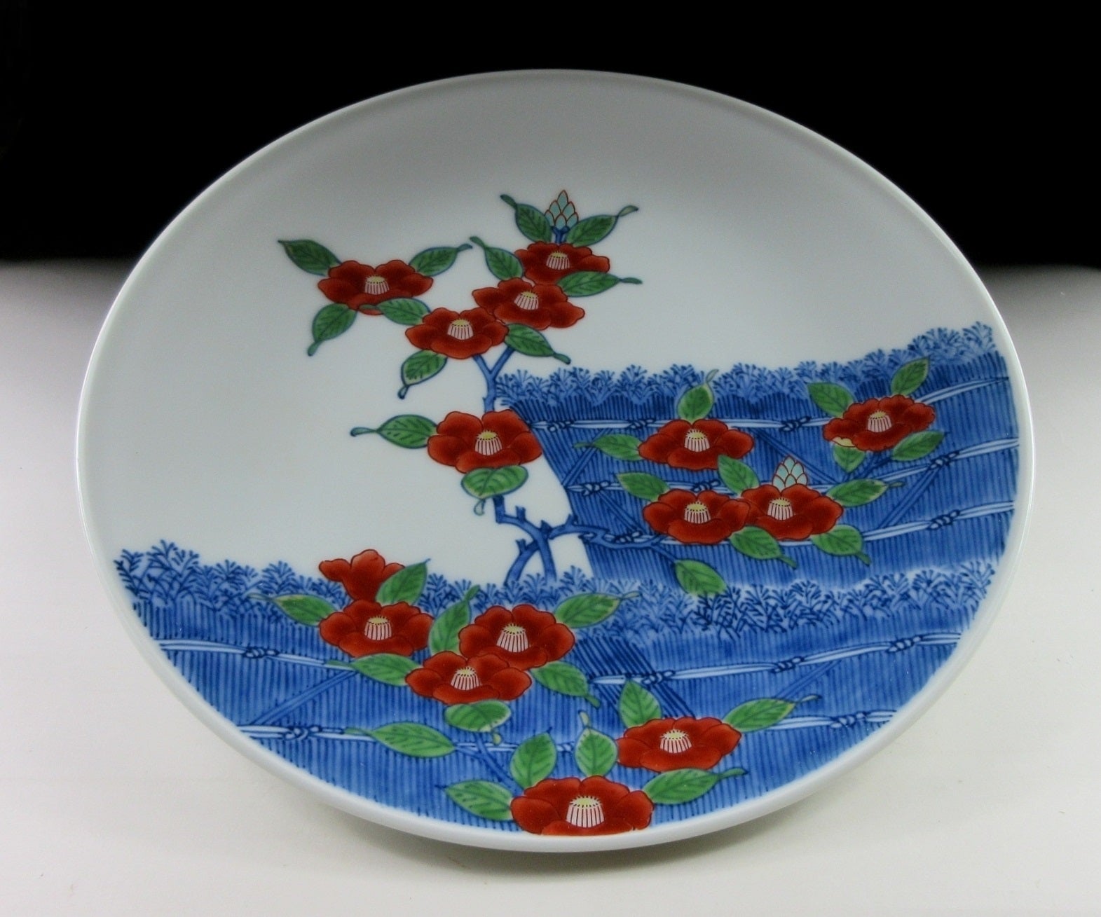 This listing is for a beautiful Iro-Nabeshima decorative plate made around 50-60 years ago by Imaizumi Imaemon XII. It is made of porcelain and decorated with hand-painted camellias over a white porcelain base. Red camellias are powerful in symbolism and they were popular with nobles during the Edo period. They symbolised a noble death among samurai and they admired for their ability to withstand the harsh cold of winter. The signature of the potter can be found on the bottom, and it comes with its original signed wooden storage box. It also comes with a lacquered wooden plate stand.