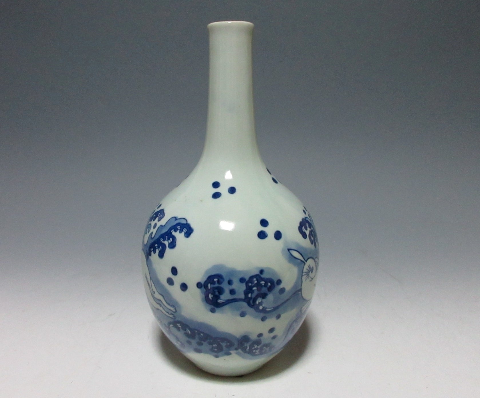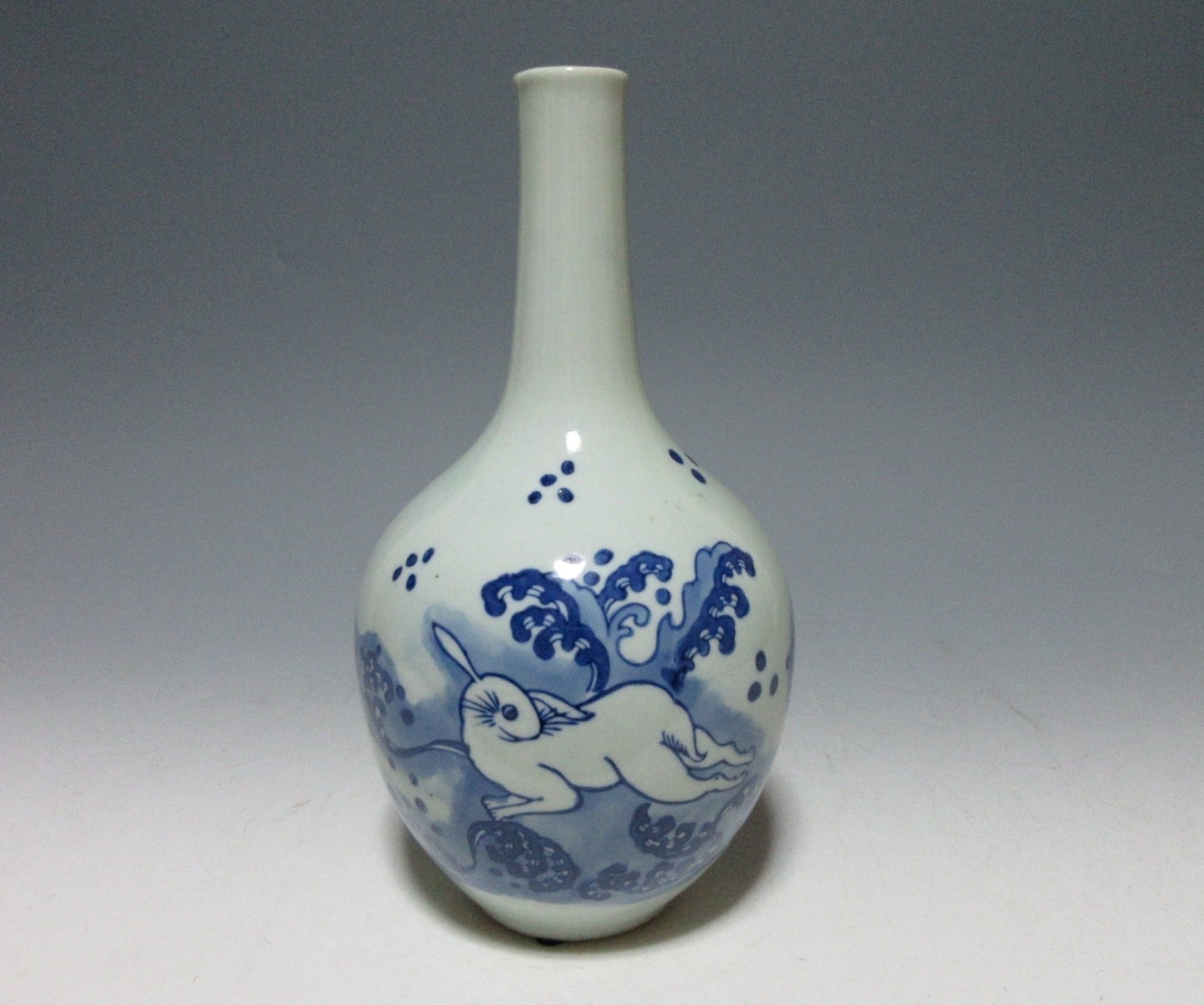 This listing is for a rather solid Imari-ware sake bottle made around 30-40 years ago. It is made of porcelain and the front is decorated with a scene from the story about the rabbit that crossed the sea. According to an old legend, there once was a white rabbit who wished to reach Inaba from the island where he lived. He could not accomplish this on his own, so he decided to trick the sharks into helping him. He spotted a shark just out to sea and called out to it, “I bet there are more of us rabbits than there are sharks. Why don’t you have all the sharks line up and I’ll count them!” The thought of losing to a rabbit was more than the shark could tolerate, so he had everyone line up all the way over to Inaba. The white rabbit put his plan into action and began to hop along the backs of the sharks. Just as he was about to reach land he quipped, “I tricked you all into lining up for me just so I could get to Inaba, what fools you are!” The last shark, infuriated by the actions of the devious rabbit, grabbed the rabbit and ripped off a large strip of fur. The rabbit’s wound was touched by sea water, and the salty breeze caused the rabbit’s skin to crack and bleed. A boy named Okununishi encountered the rabbit lying in the grass wailing in pain. He asked the white rabbit what had happened, and the rabbit truthfully explained. The boy promised to help the rabbit if he promised not to fool anyone again. The rabbit agreed, so the boy took the rabbit down to the river and washed him. He laid out some cattails and gently rolled the rabbit over them, making sure that the wound absorbed the cattail’s medicine. The rabbit’s pain stopped and the wound made a speedy recovery, but more importantly, the white rabbit that crossed the sea never fooled anybody ever again. This item would be nice to decorate with pampas grass on the night of the harvest moon, or a nice gift for somebody born in the Year of the Rabbit.