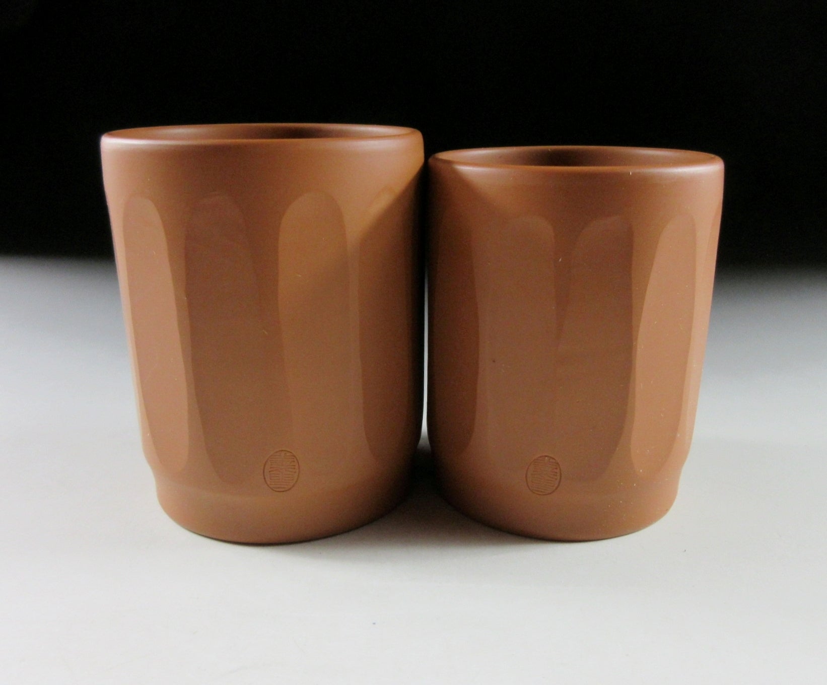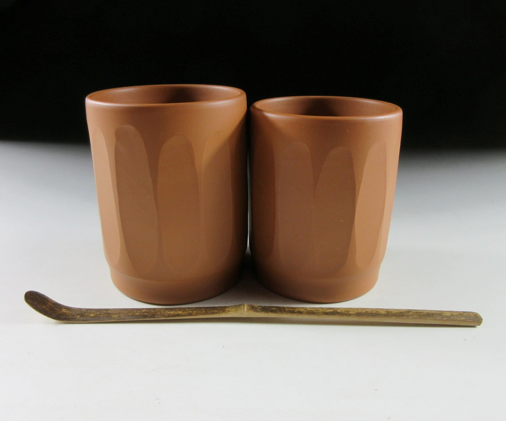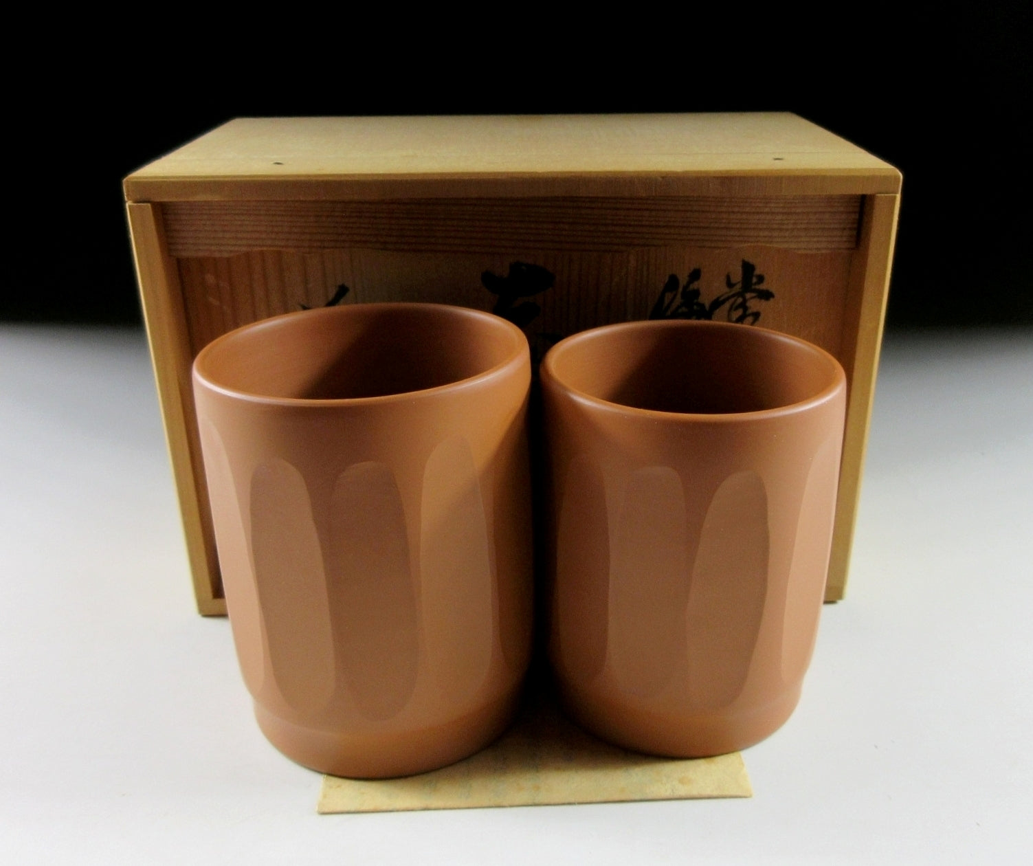 This listing is for a pair of Tokoname-ware yunomi made around 40 years ago by noted potter Inoue Gisou. They are wheel-thrown and made of smooth, orange-red ‘shudei’ clay. The exterior features a simple pattern made with a potter’s knife, and the stamp of the potter can be found near the base. They come with their original signed wooden storage box, and a Japanese language profile paper about Tokoname-ware. *PLEASE NOTE THAT THE BAMBOO TEA SCOOP IS NOT INCLUDED.