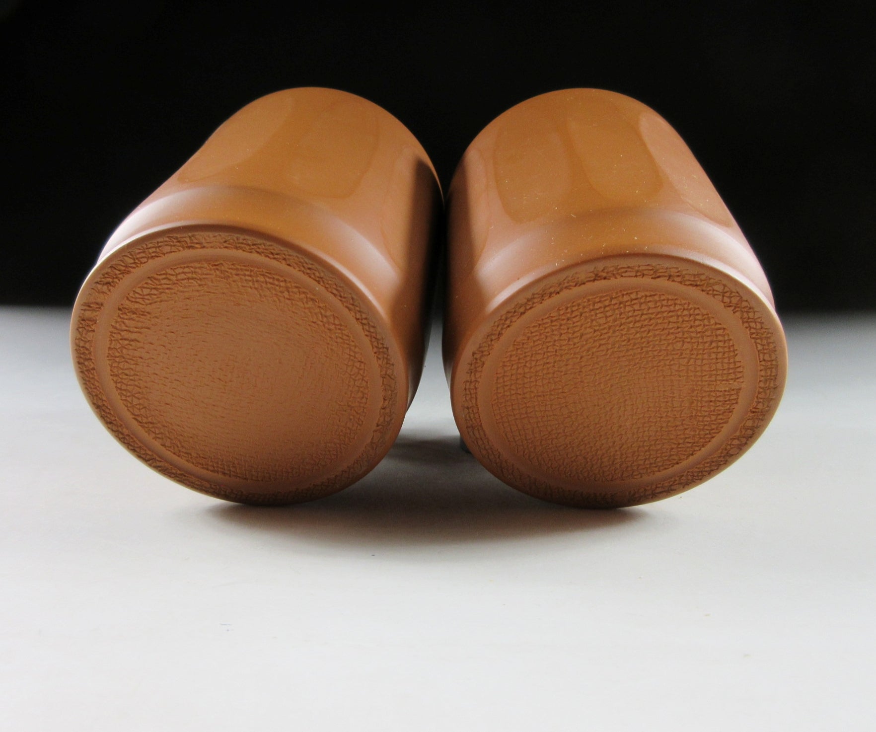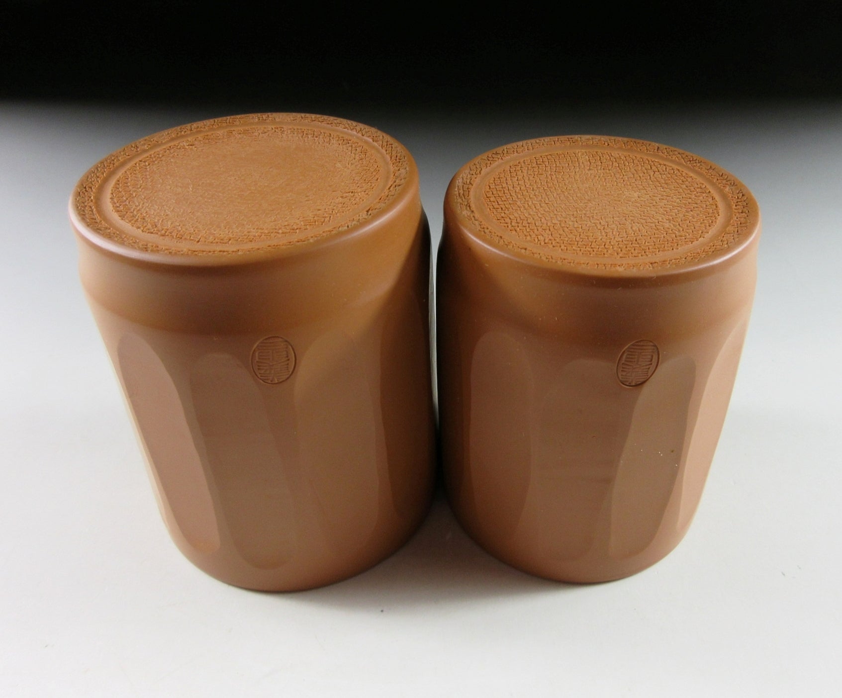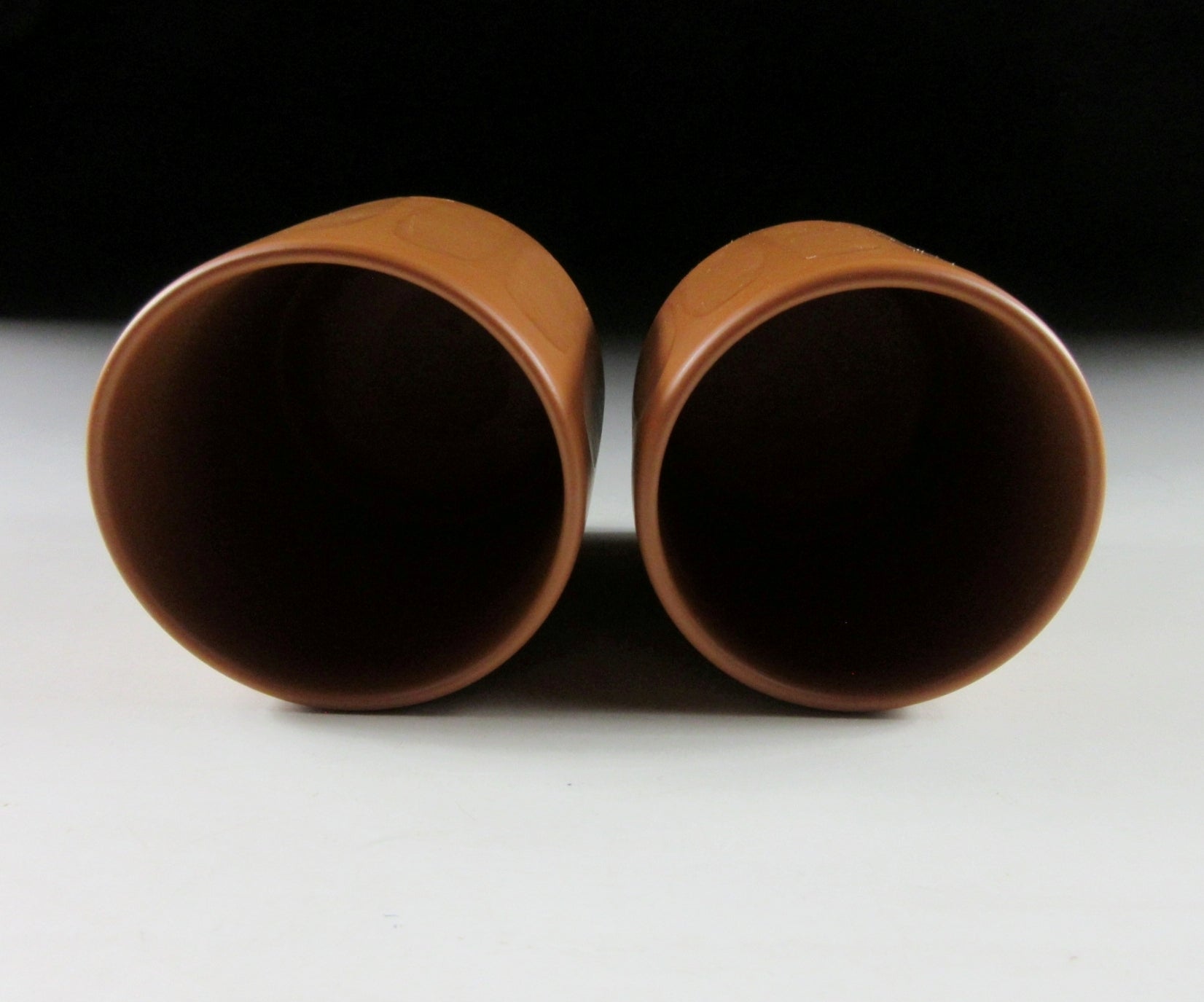 This listing is for a pair of Tokoname-ware yunomi made around 40 years ago by noted potter Inoue Gisou. They are wheel-thrown and made of smooth, orange-red ‘shudei’ clay. The exterior features a simple pattern made with a potter’s knife, and the stamp of the potter can be found near the base. They come with their original signed wooden storage box, and a Japanese language profile paper about Tokoname-ware. *PLEASE NOTE THAT THE BAMBOO TEA SCOOP IS NOT INCLUDED.