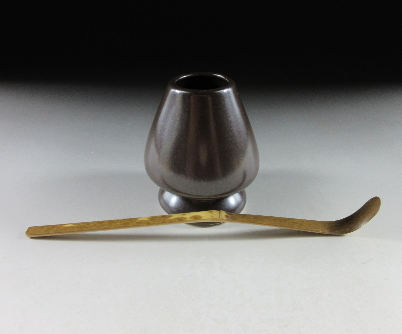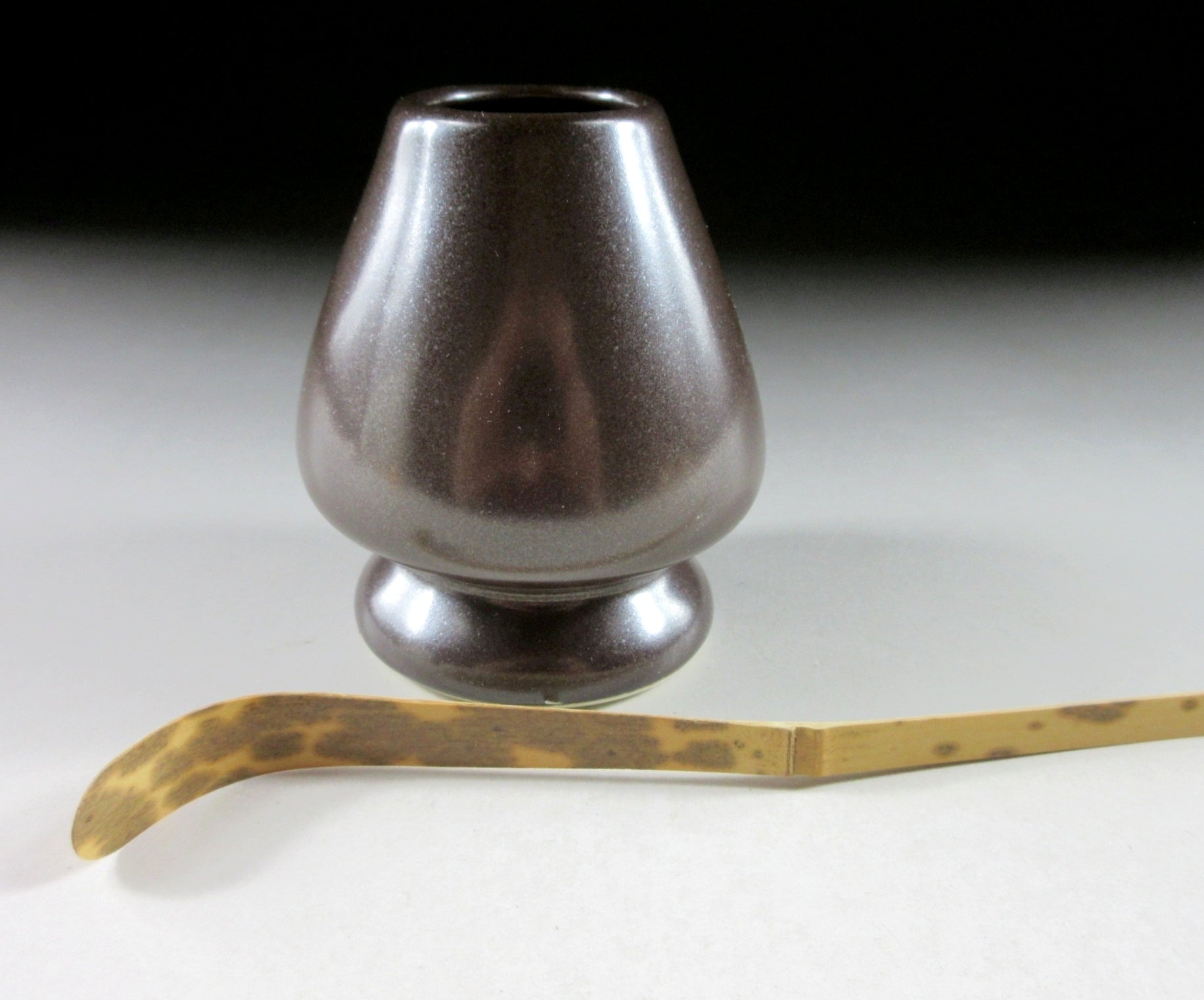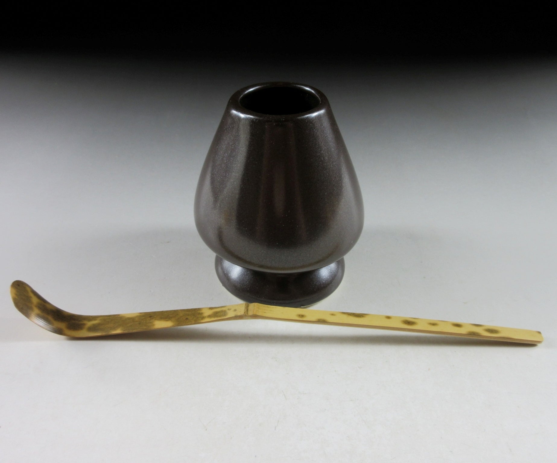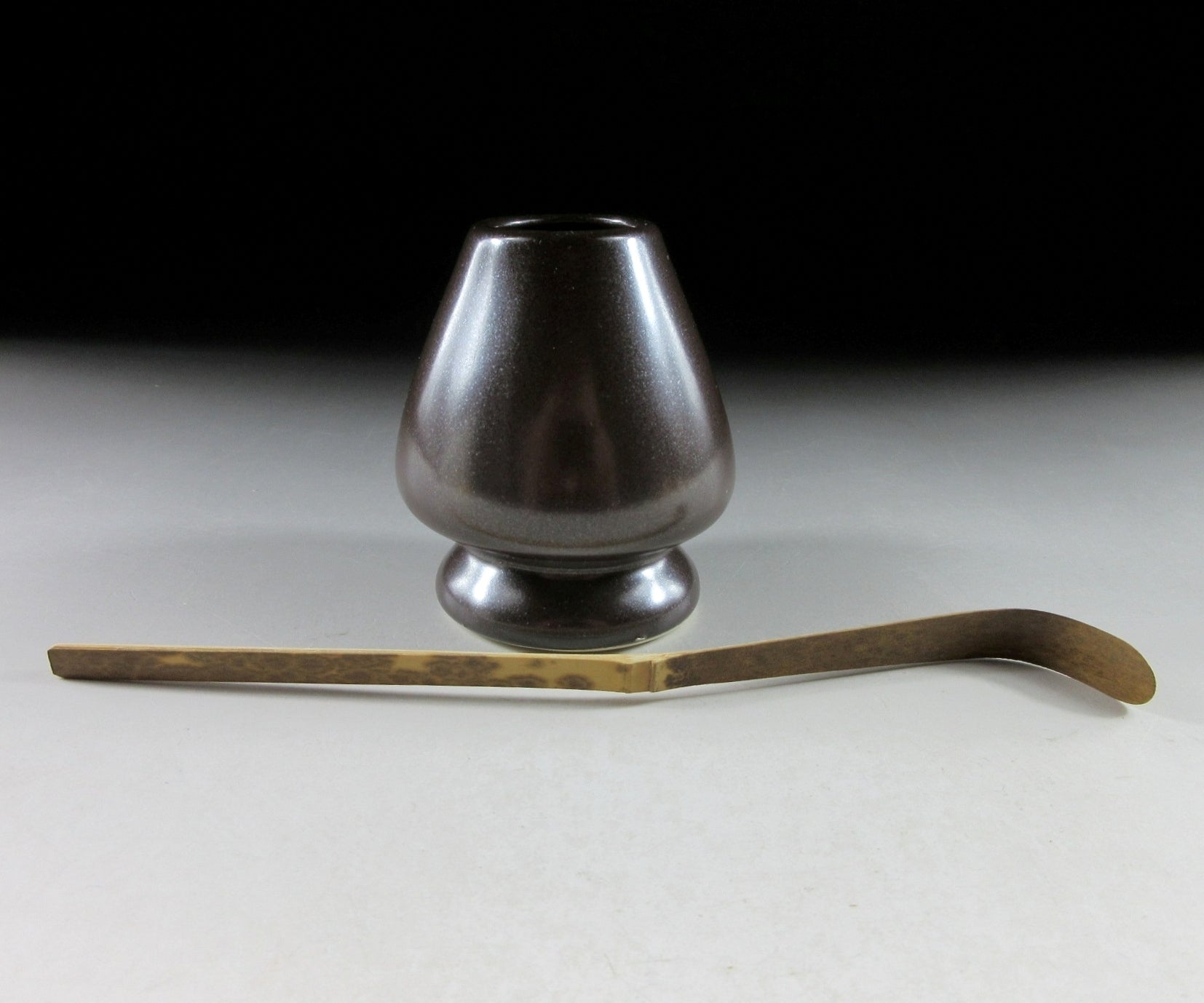 This listing is for a Banko-ware iron glaze kusenaoshi and a ‘shimitake’ chashaku from Nara. The shaper’s job is to help your chasen maintain its shape whilst drying. After the tea whisk is dried it should be stored in a chasen zutsu. Care should be taken when placing your chasen on the shaper. Not placing the tines properly may result in broken ends. The tea whisk is the shimitake type, which means stained bamboo. It was crafted in Takayama and features dark patches of colour. **The shading and pattern of the spots will vary depending on the product.