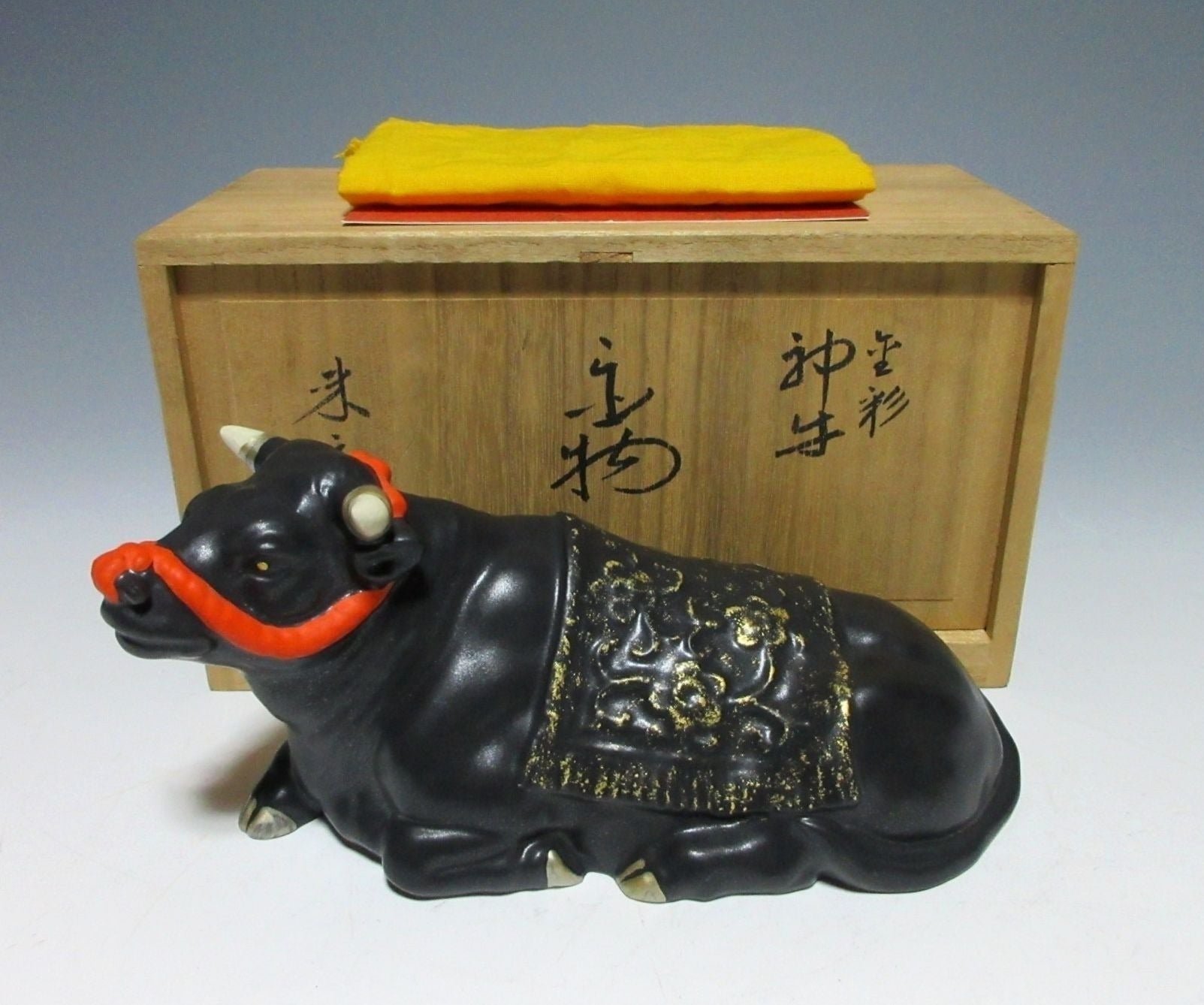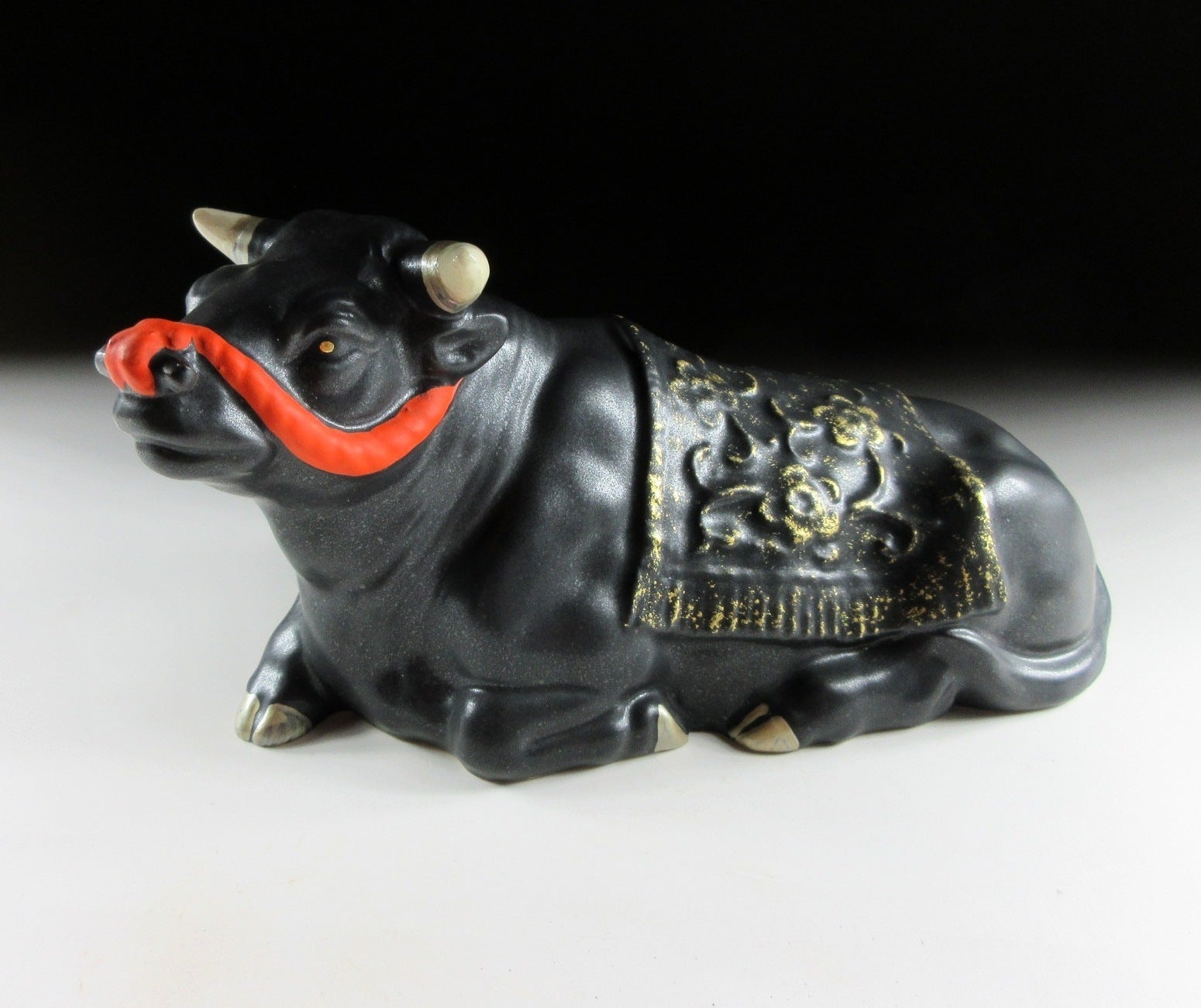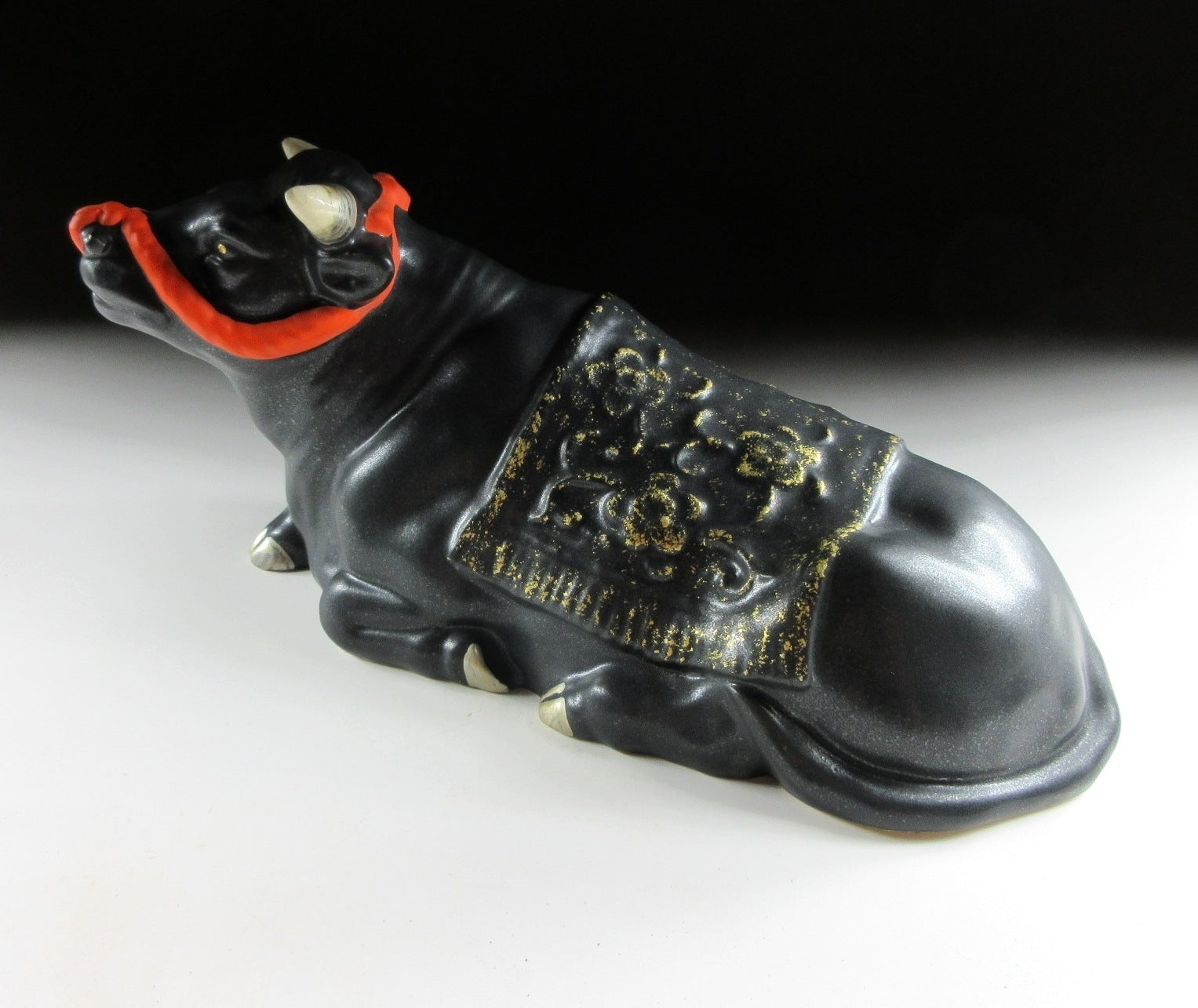 This listing is for a Kyo-ware okimono made by noted potter, Ishida Rainosuke. It was made from a slip mould and moulded to resemble a resting ox. The exterior features matte black glaze with gold trim. The ox has a blanket draped over its back and the blanket is decorated with plum blossoms, one of the three friends of winter. This piece was most likely made to commemorate the Year of the Ox in either 1973 or 1985. The signature of the potter can be found on the bottom, and it comes with its original signed wooden storage box. It also comes with a turmeric coloured wrapping cloth for when the item is not in use, as well as a Japanese language profile paper about the potter.
