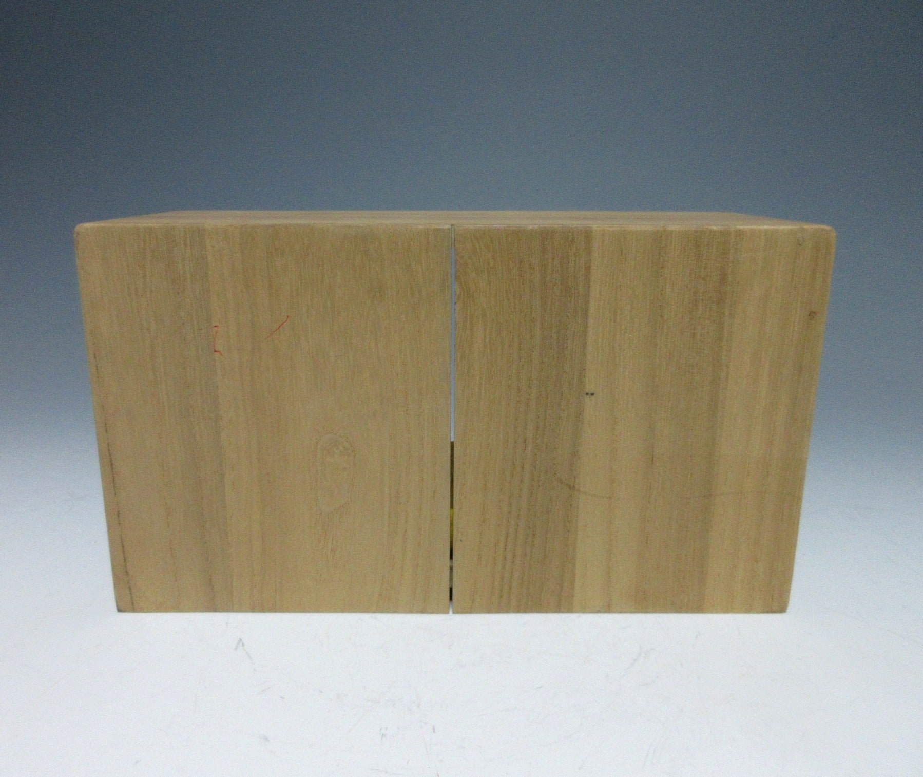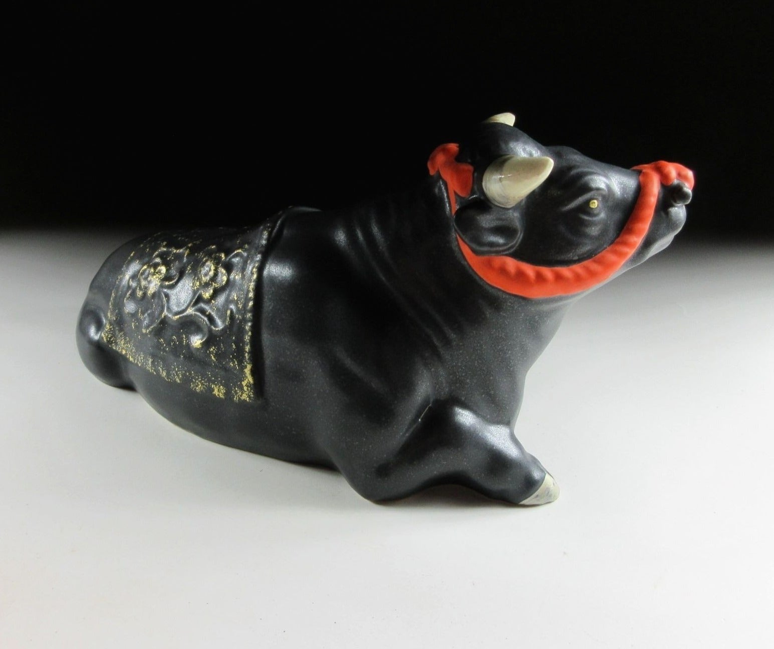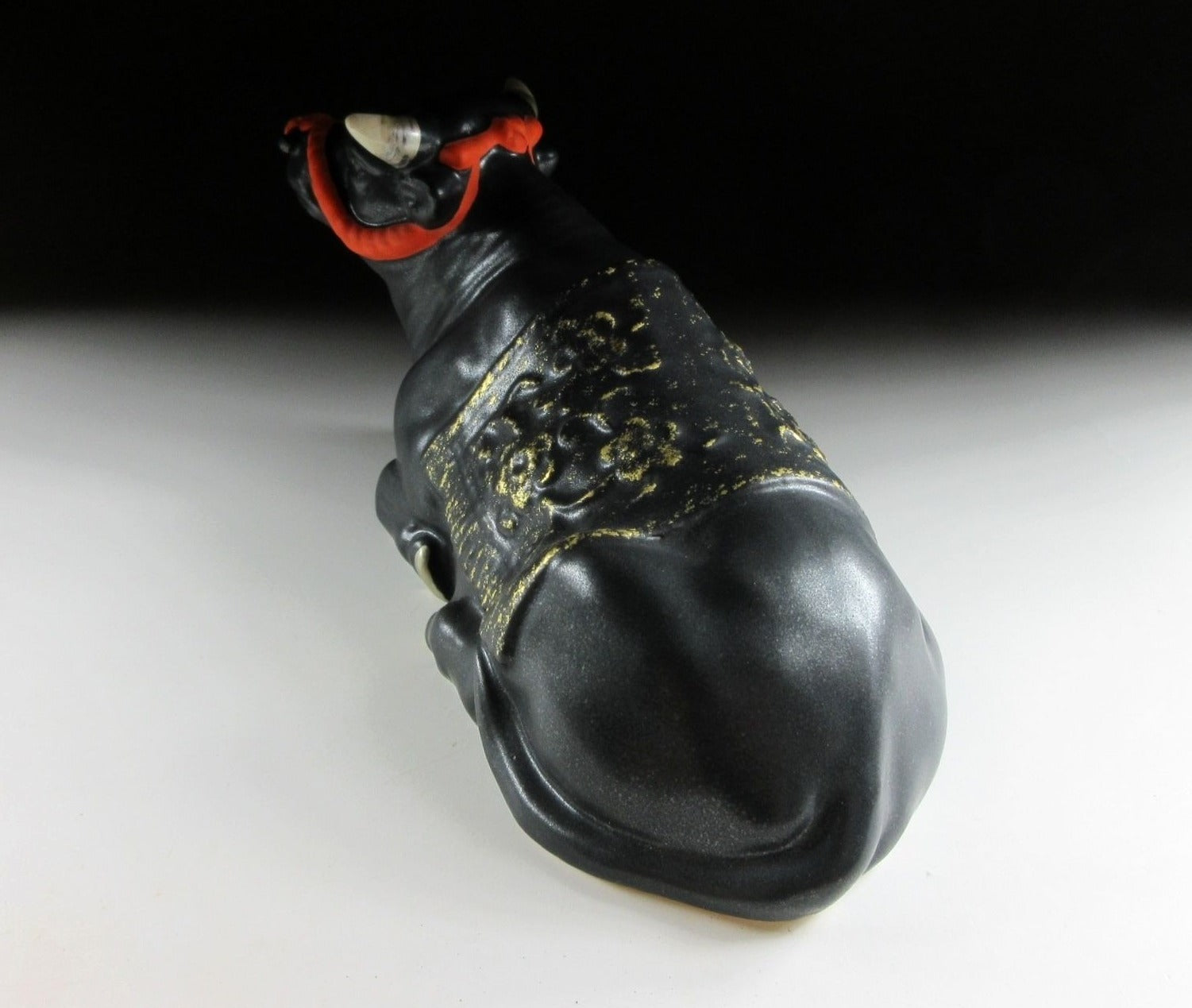 This listing is for a Kyo-ware okimono made by noted potter, Ishida Rainosuke. It was made from a slip mould and moulded to resemble a resting ox. The exterior features matte black glaze with gold trim. The ox has a blanket draped over its back and the blanket is decorated with plum blossoms, one of the three friends of winter. This piece was most likely made to commemorate the Year of the Ox in either 1973 or 1985. The signature of the potter can be found on the bottom, and it comes with its original signed wooden storage box. It also comes with a turmeric coloured wrapping cloth for when the item is not in use, as well as a Japanese language profile paper about the potter.