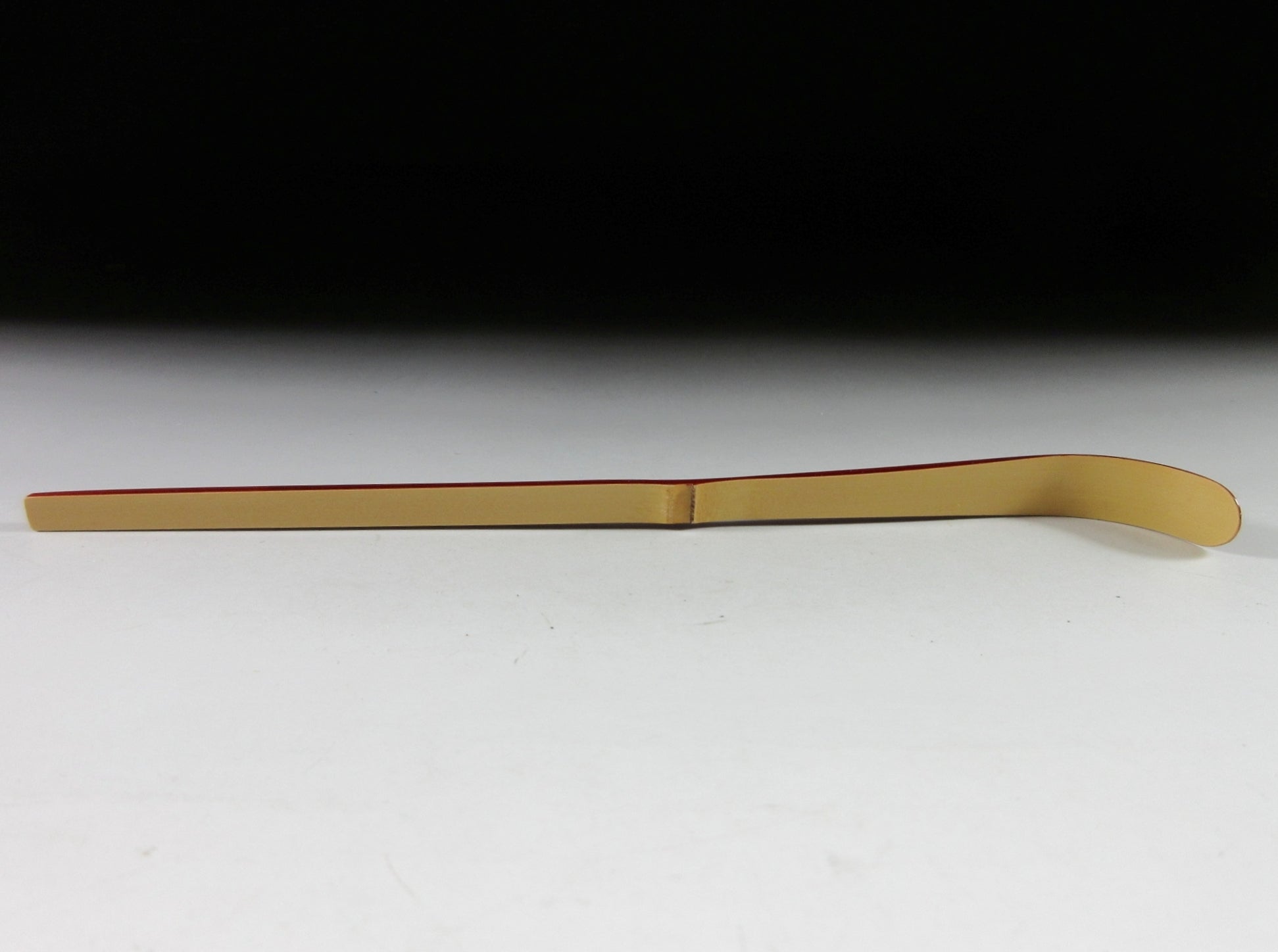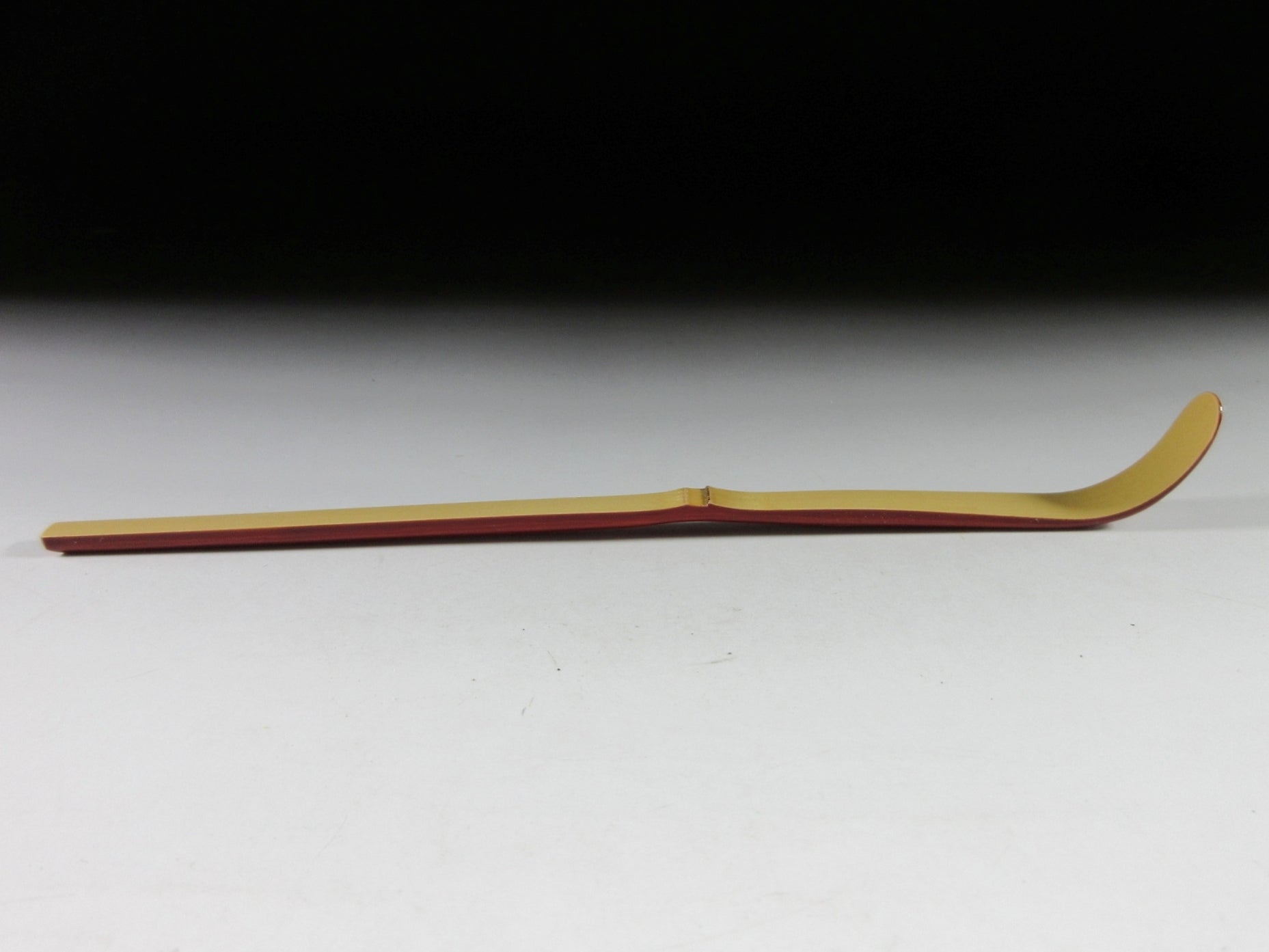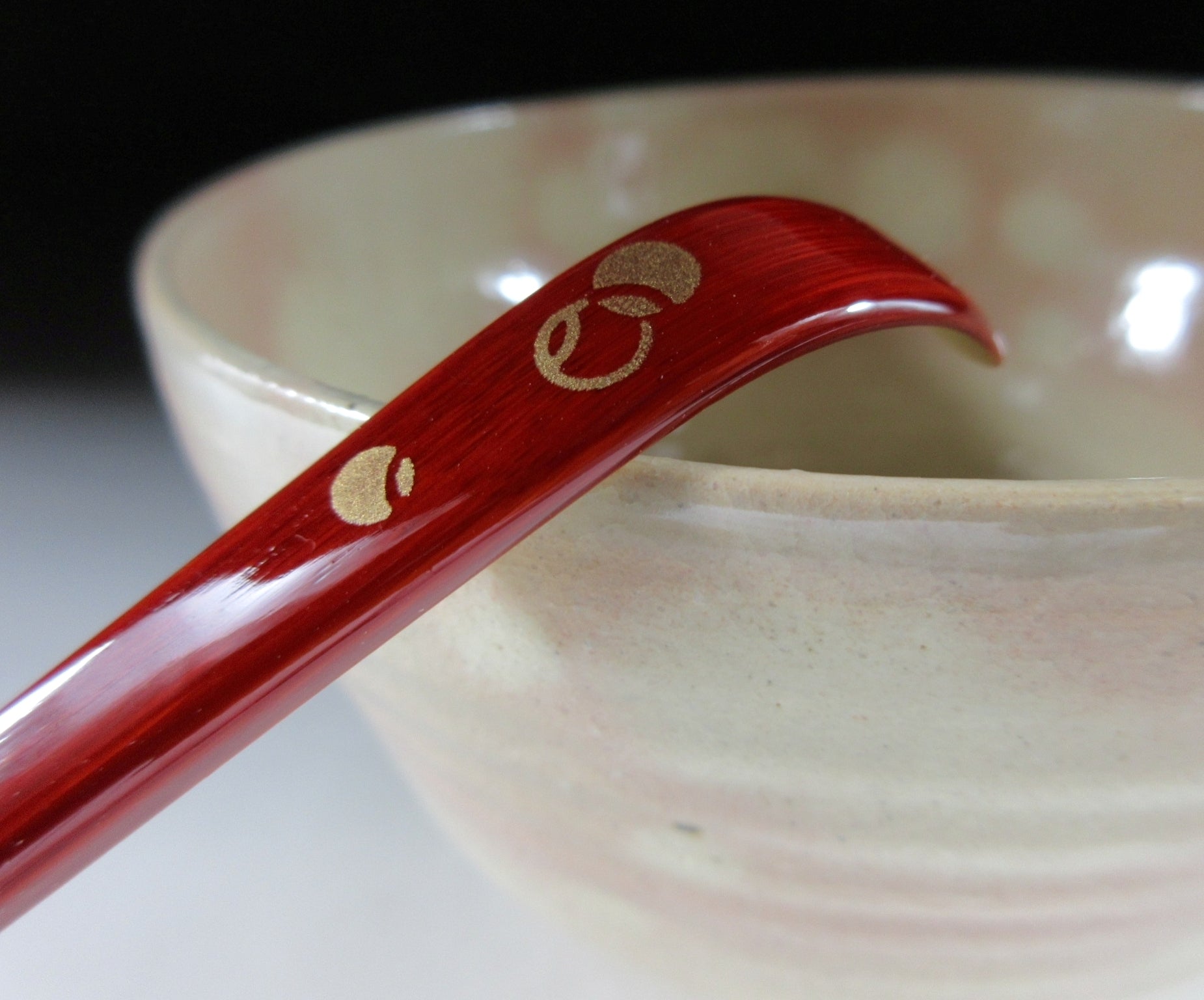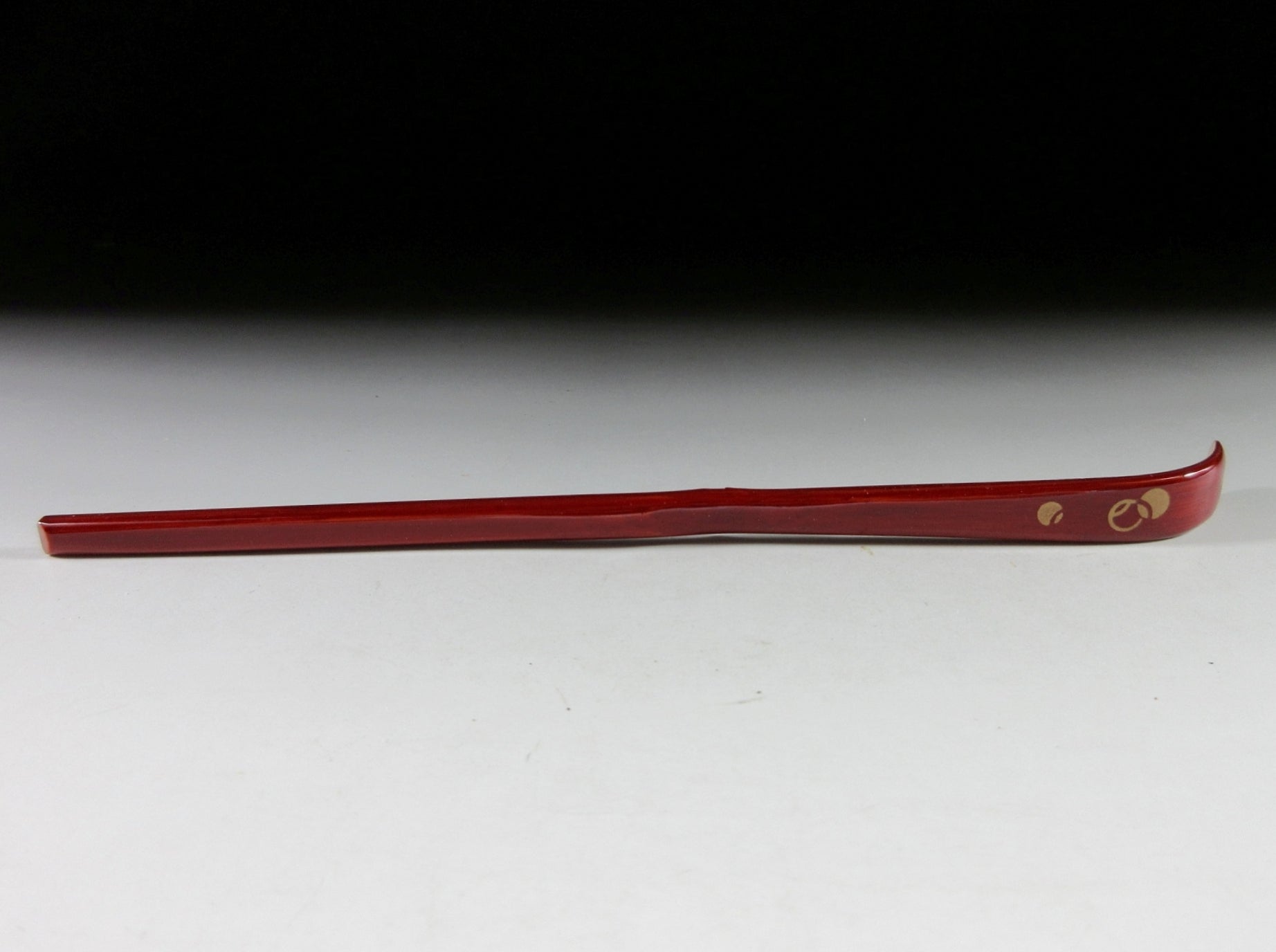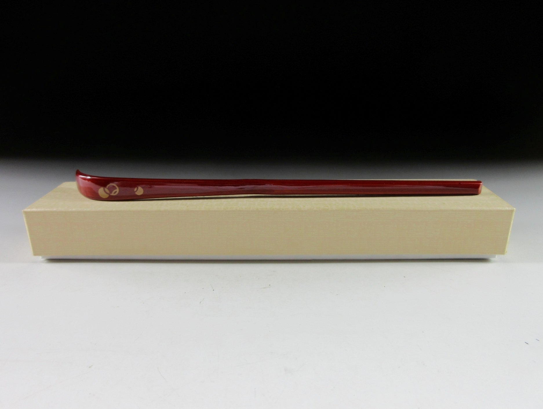 This listing is for a high grade lacquered bamboo chashaku made by Ishikawa Takenomise in Kyoto. Chashaku are an essential item for traditional Japanese tea ceremony, they are used for the measuring and preparation of matcha tea. The back of the spoon is coated in dark coloured urushi lacquer and features a makie 'tsubo-tsubo' Urasenke pattern, and the front is unlacquered with a natural finish. It comes with a paper box. **PLEASE NOTE THAT THE CHAWAN IS NOT INCLUDED.