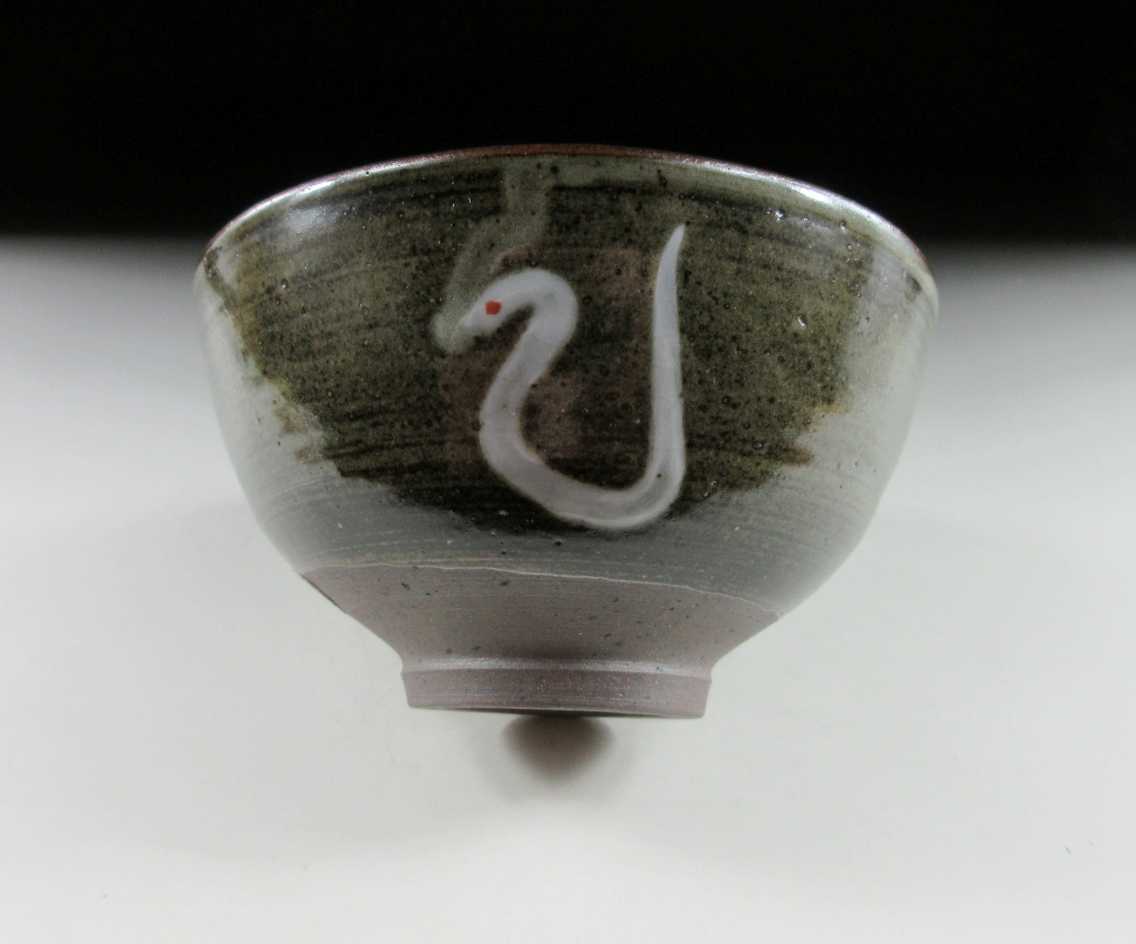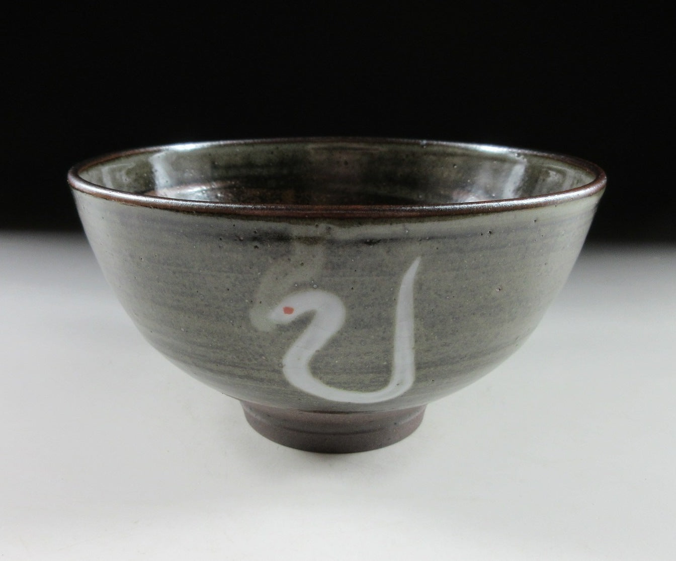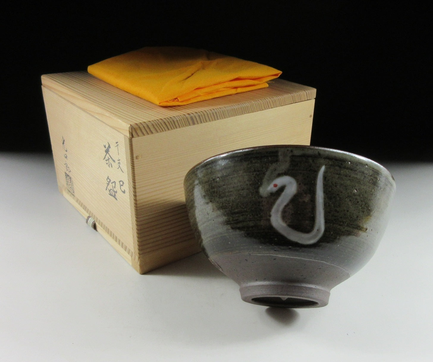 This listing is for a vintage chawan made around 12 years ago by Ishizaki Koshiro. It is made of high-fired stoneware and the front is decorated with a hand-painted depiction of a white snake. White snakes are considered to be good luck in Japan, and are a symbol for Benten, the Japanese goddess of wealth. The piece is thin walled and the rim is trimmed with an iron-based glaze, there’s also a much thicker line brushed onto the interior of the bowl. It was most likely made to commemorate the Year of the Snake back in 2013. The stamp of the potter can be found on the bottom, and it comes with its original signed wooden storage box. It also comes with a turmeric wrapping cloth for when the item is not in use.