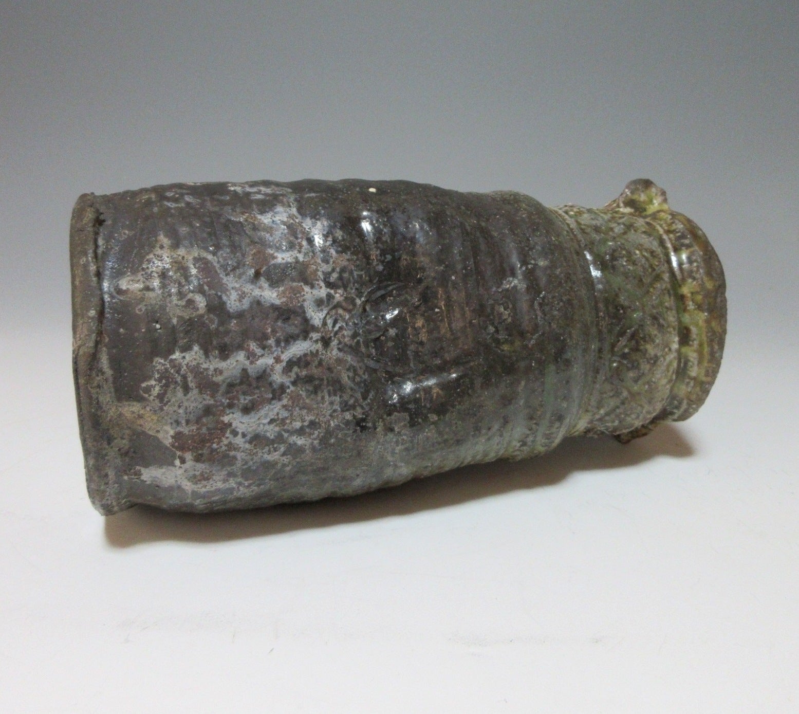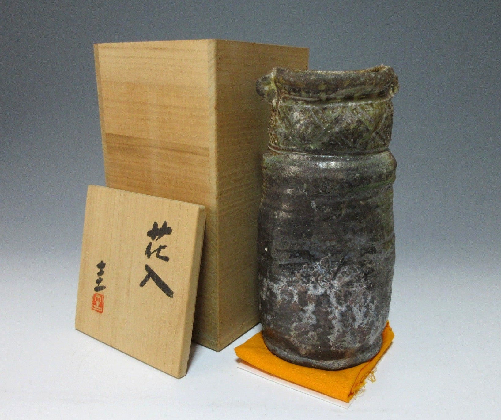This listing is for a splendid Shigaraki-ware vase made around 30 years ago by Ito Kei. It is made of high-fired stoneware and wood-fired in an anagama tunnel kiln. It has a wonderfully organic shape and a Muromachi style cross pattern just below the rim. This piece also has two small ‘mimi’ handles, as well as a generous amount of natural ash deposits on the front. The signature of the kiln can be found on the bottom, and it comes with its original signed wooden storage box. It also comes with a turmeric coloured wrapping cloth for when the vase is not in use, and a Japanese language profile paper about the potter.
