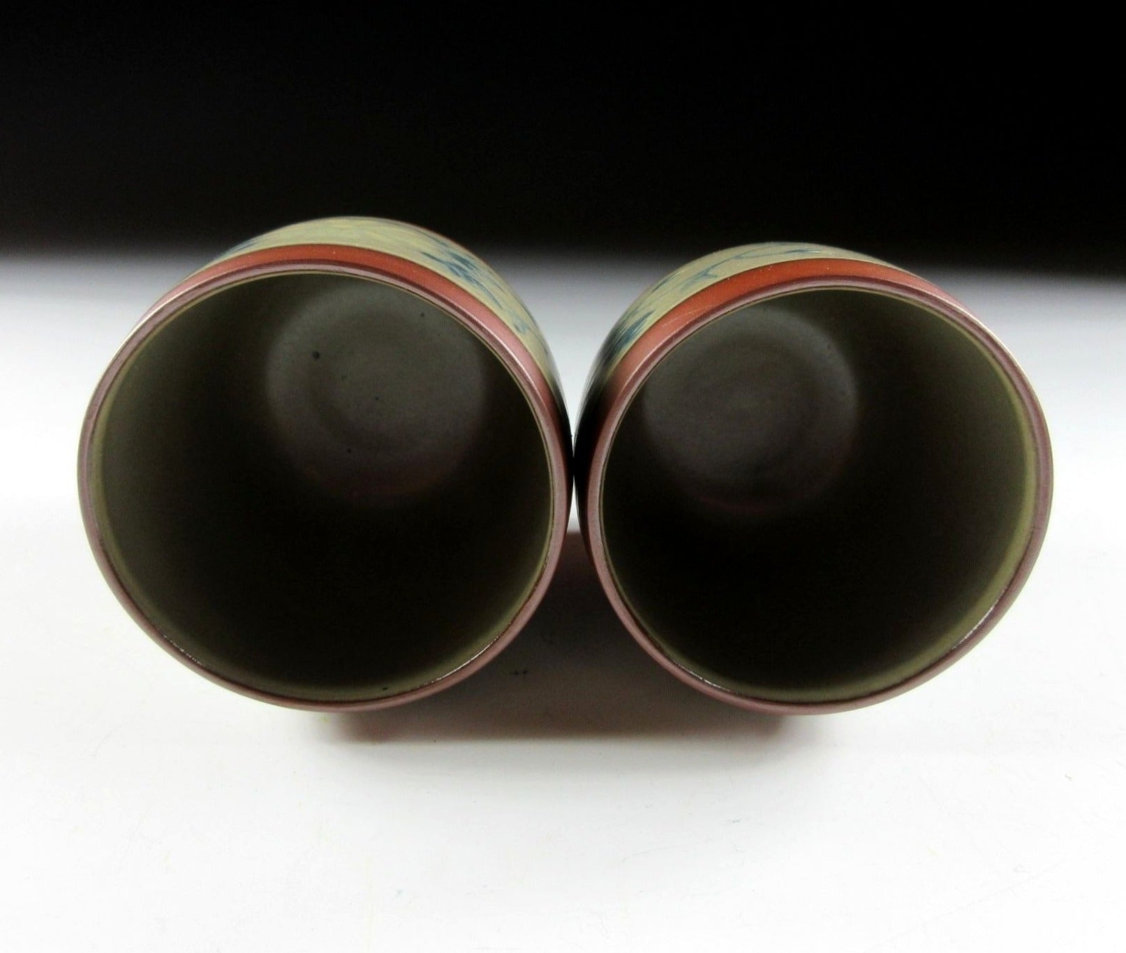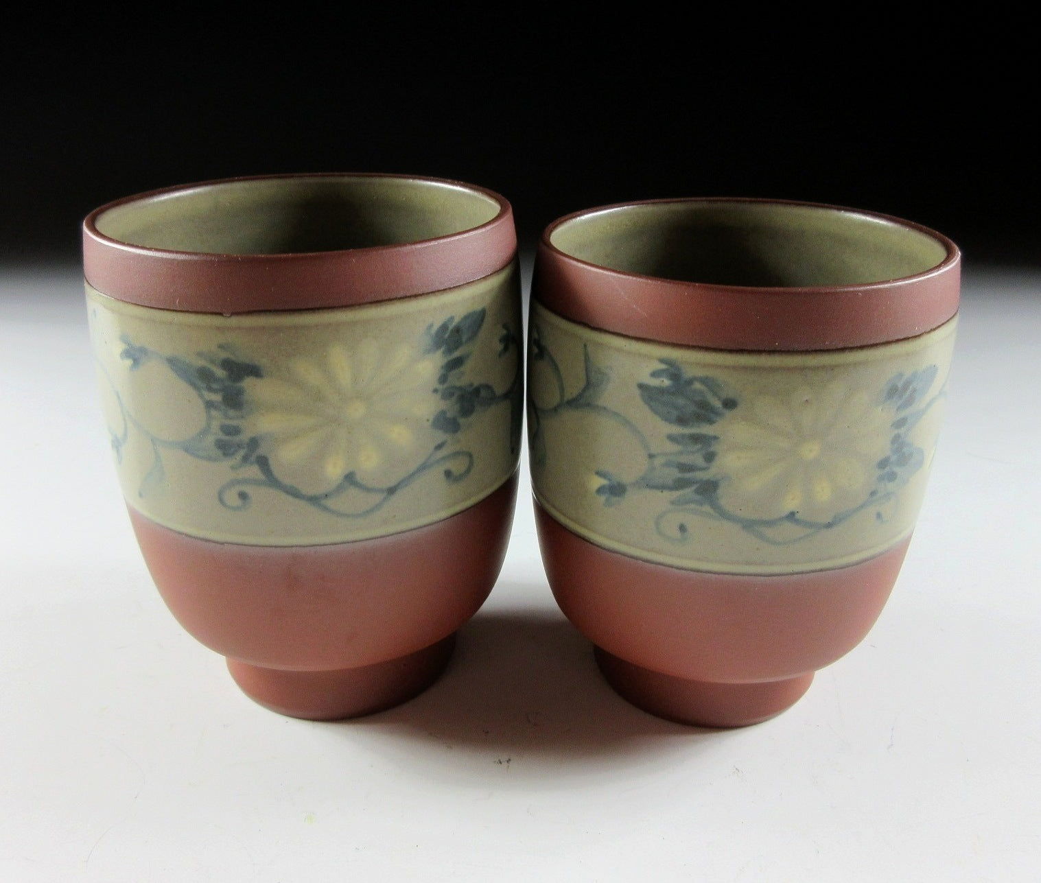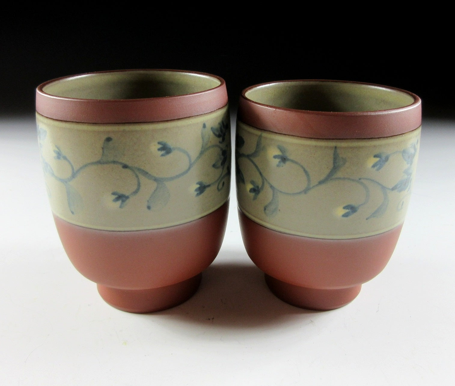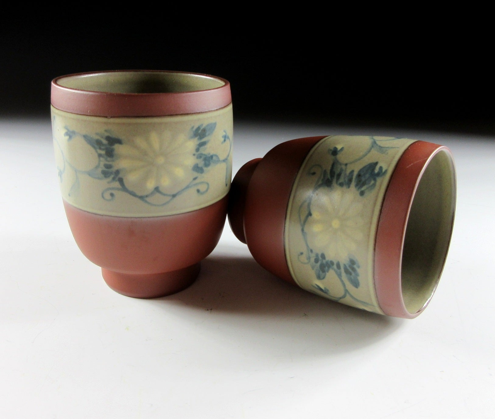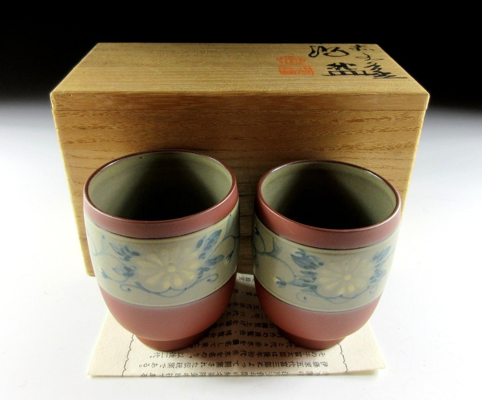 This listing is for a pair of Mumyoi-ware yunomi made by Living National Treasure, Ito Sekisui V. They are wheel-thrown and decorated with hand-painted flowers over a tan coloured background base. This particular set is what we call meoto style, meaning they are two different sizes and often referred to as a husband and wife pair. The stamp of the potter can be found on the bottom of each piece, and they come with their original signed wooden storage box. They also come with a Japanese language profile paper about the potter.