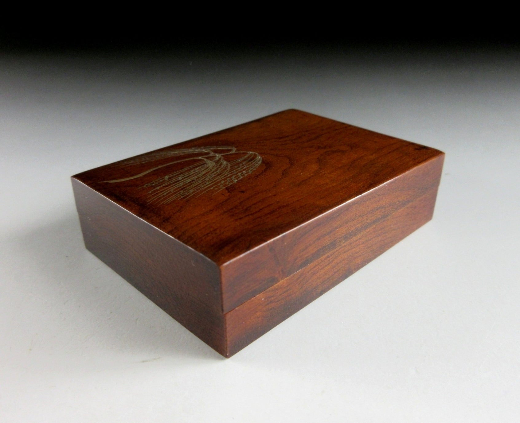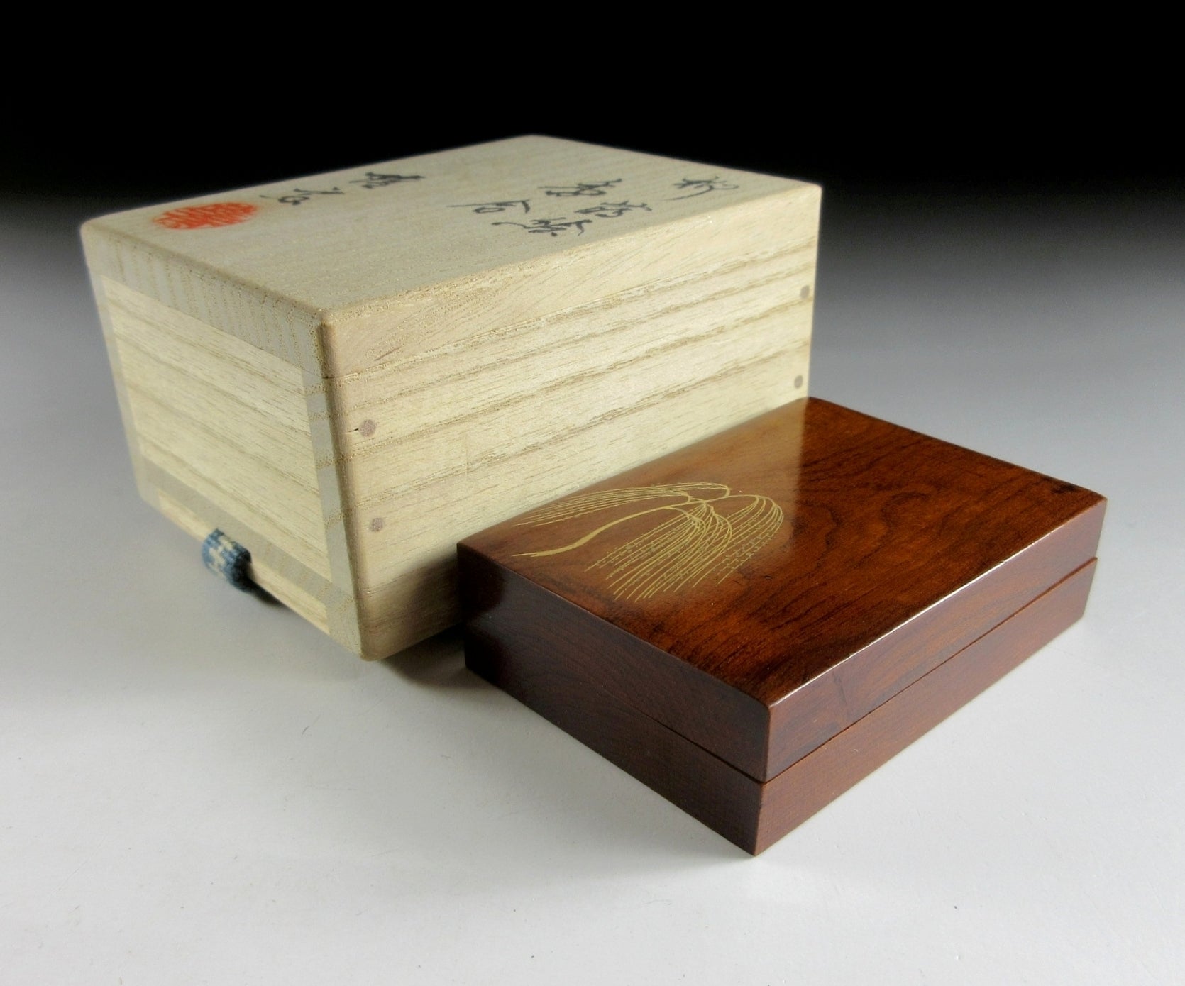 This listing is for a makie kogo made around 20 years ago by lacquerware artisan, Iwakura Ryusai. It is made of wood and the lid is decorated with a makie depiction of weeping willow. Weeping willow, or yanagi in Japanese, is often seen gently swaying in the summer breeze along rivers in streams in places like Kyoto. It is also admired for its strength as its branches do not break under the weight of snow. This piece is for holding woodchip incense and is ideally suited for use during the summer months. It comes with its original signed wooden storage box, as well as a yellow wrapping cloth for when the item is not in use.