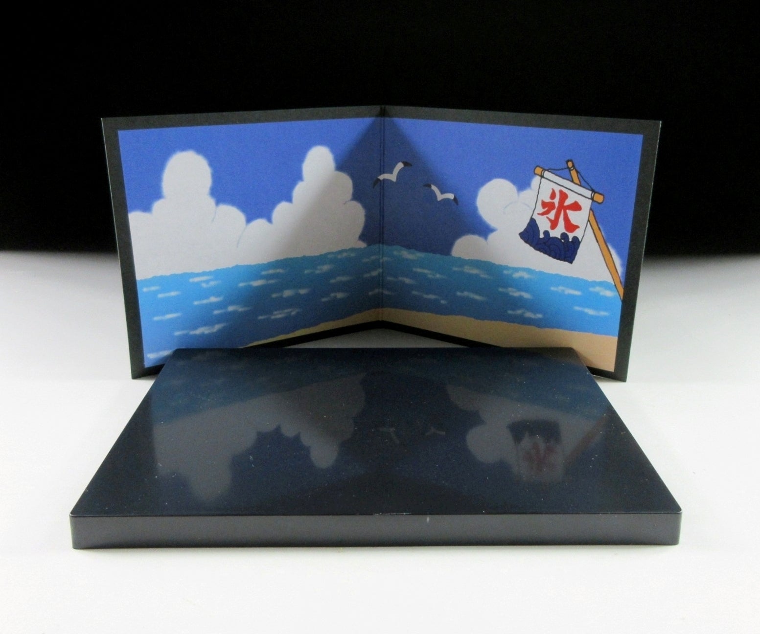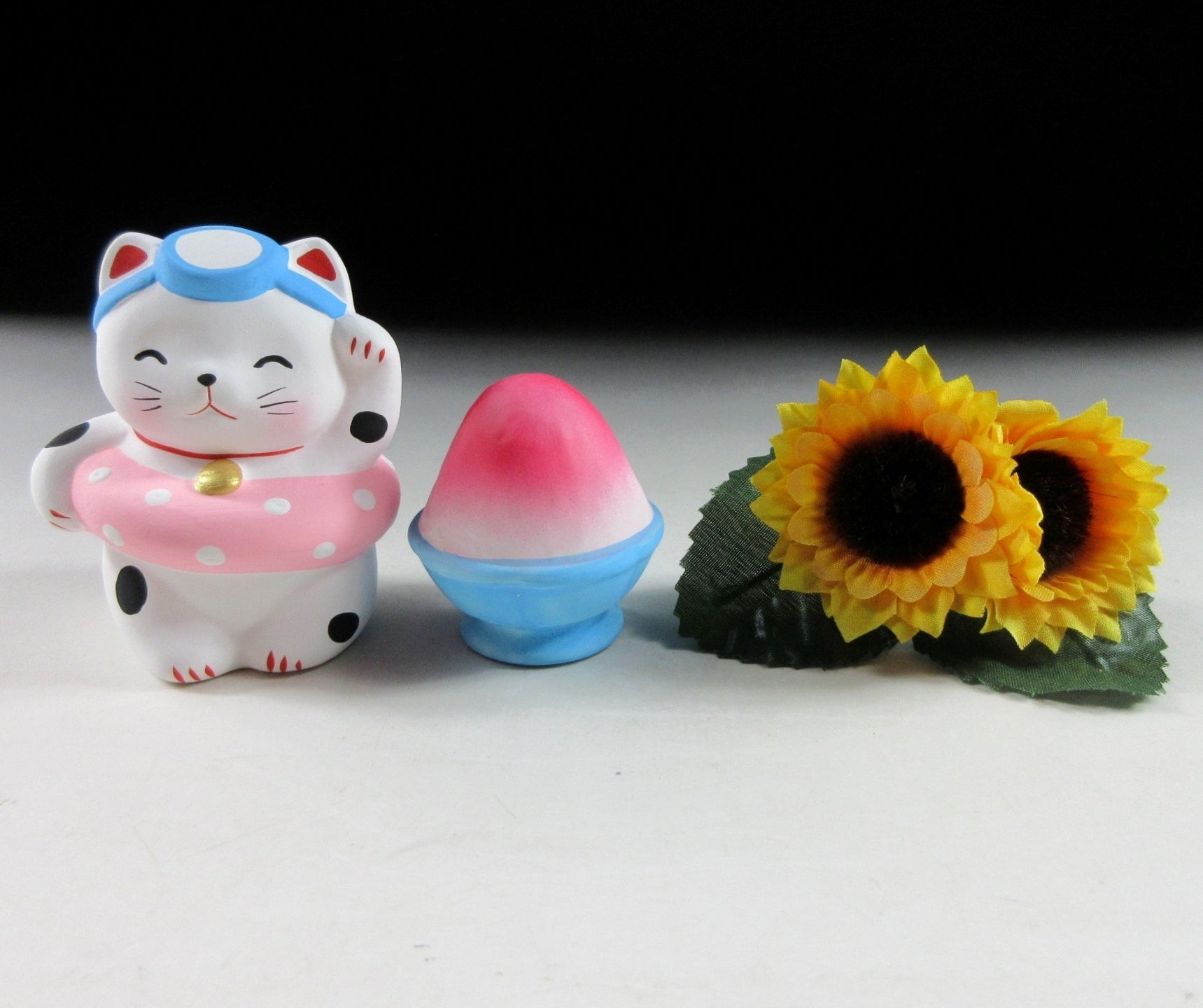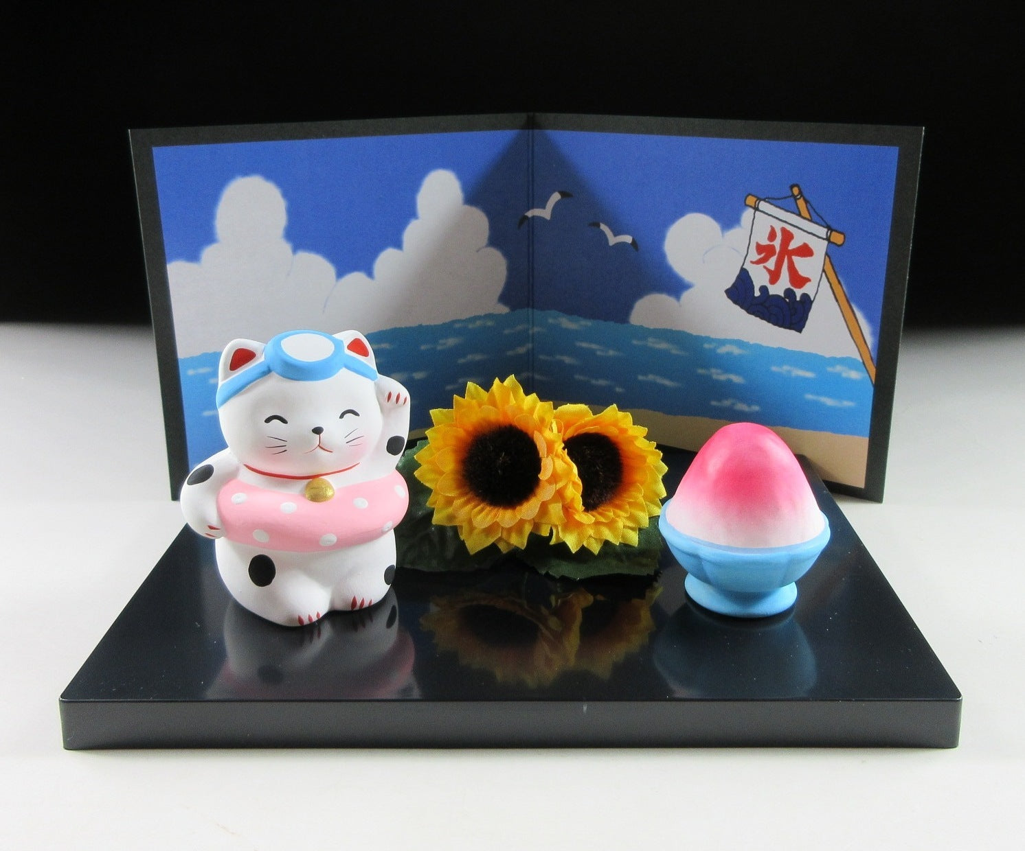 This listing is for a small maneki neko display to celebrate the month of July. It comes from the ’12 Months Series of Events in Japan’ and depicts a maneki neko enjoying a day at the beach. Mid-July marks the end of school in Japan and families often visit the beach during the 3-day weekend set aside to observe ‘Marine Day’. The set includes the small paper screen decorated with the seaside and a ‘kakigori’ shaved ice banner, a small earthenware kakigori shaved ice ornament, sunflowers, and a plastic display board. This set also comes with its original paper storage box.
