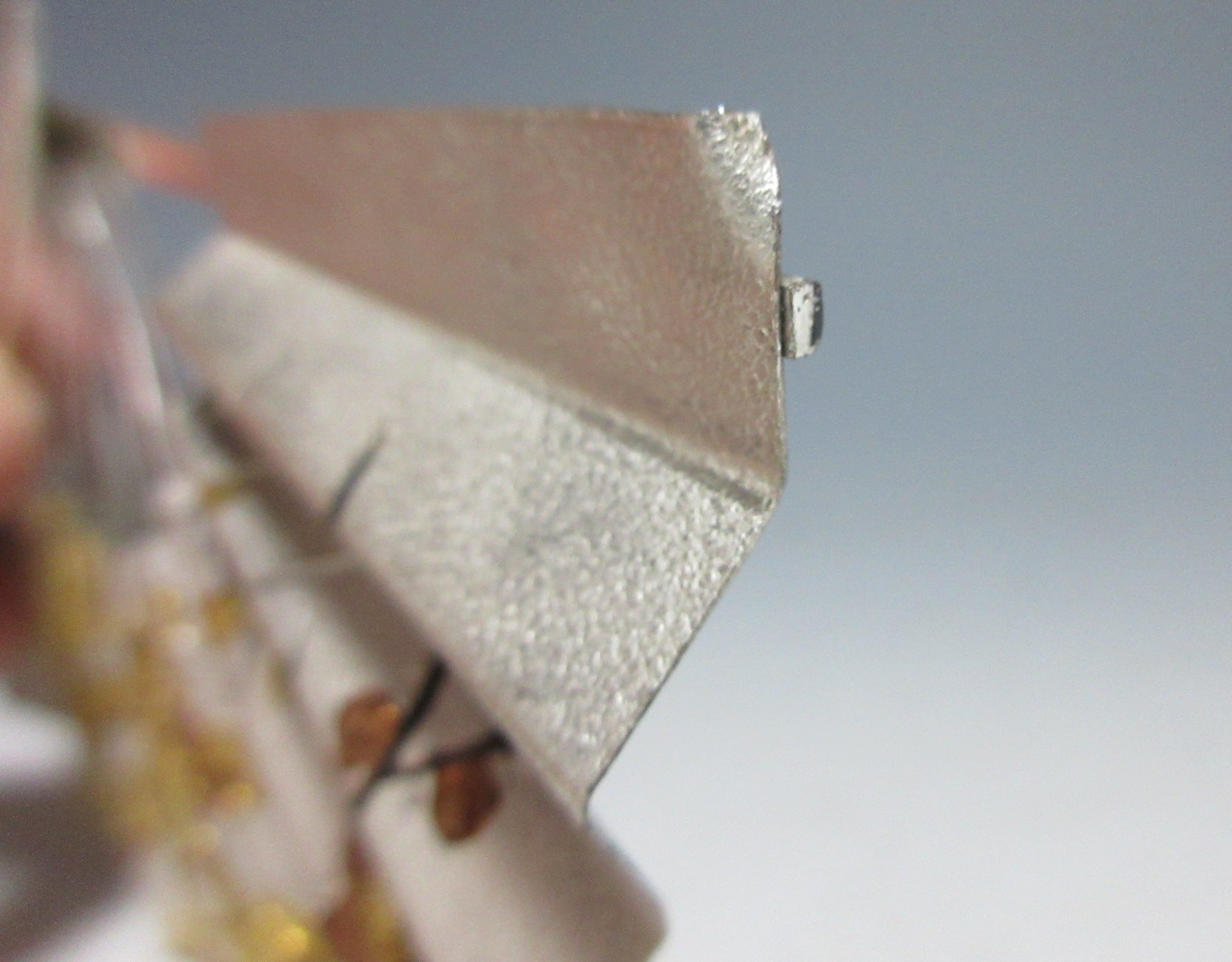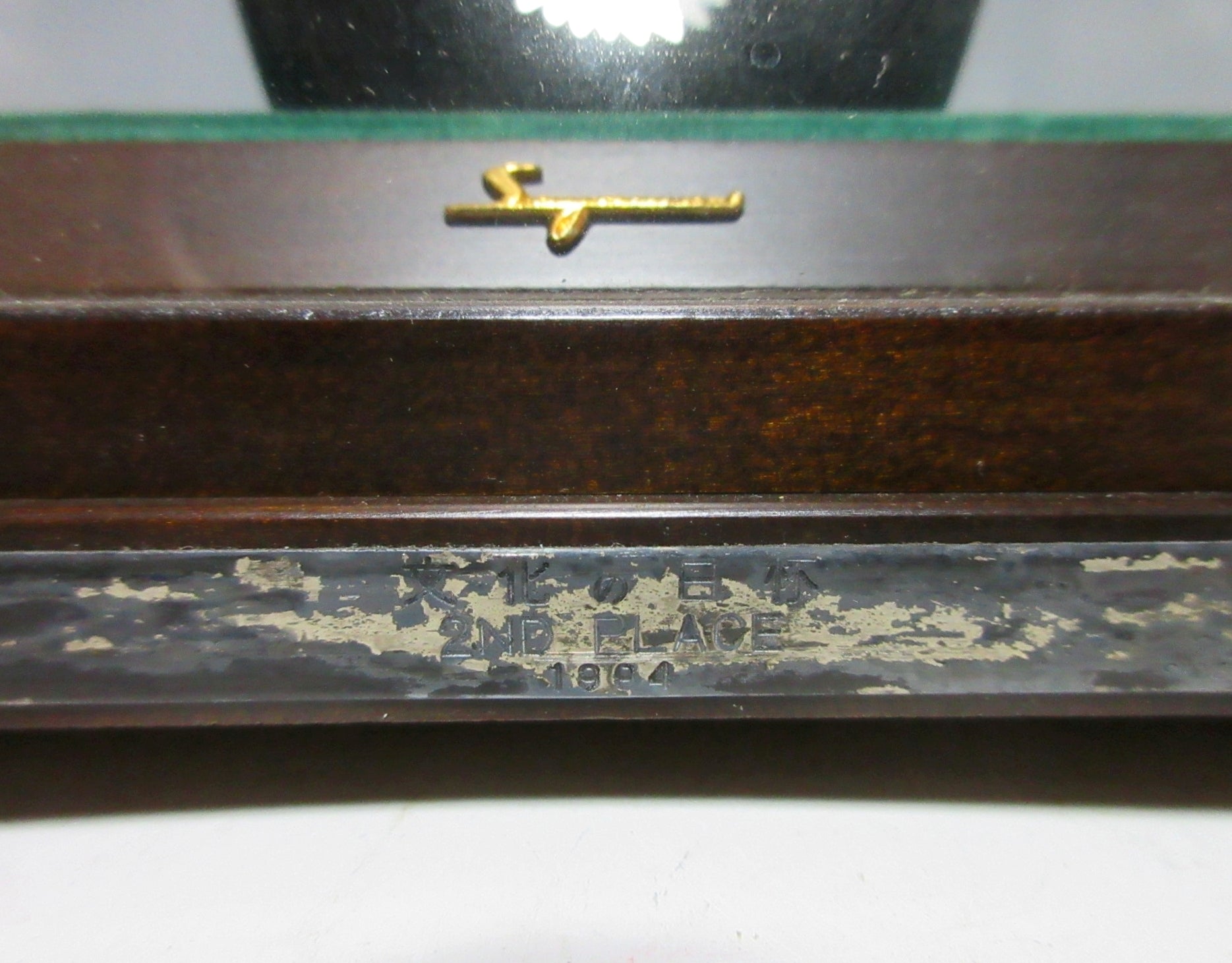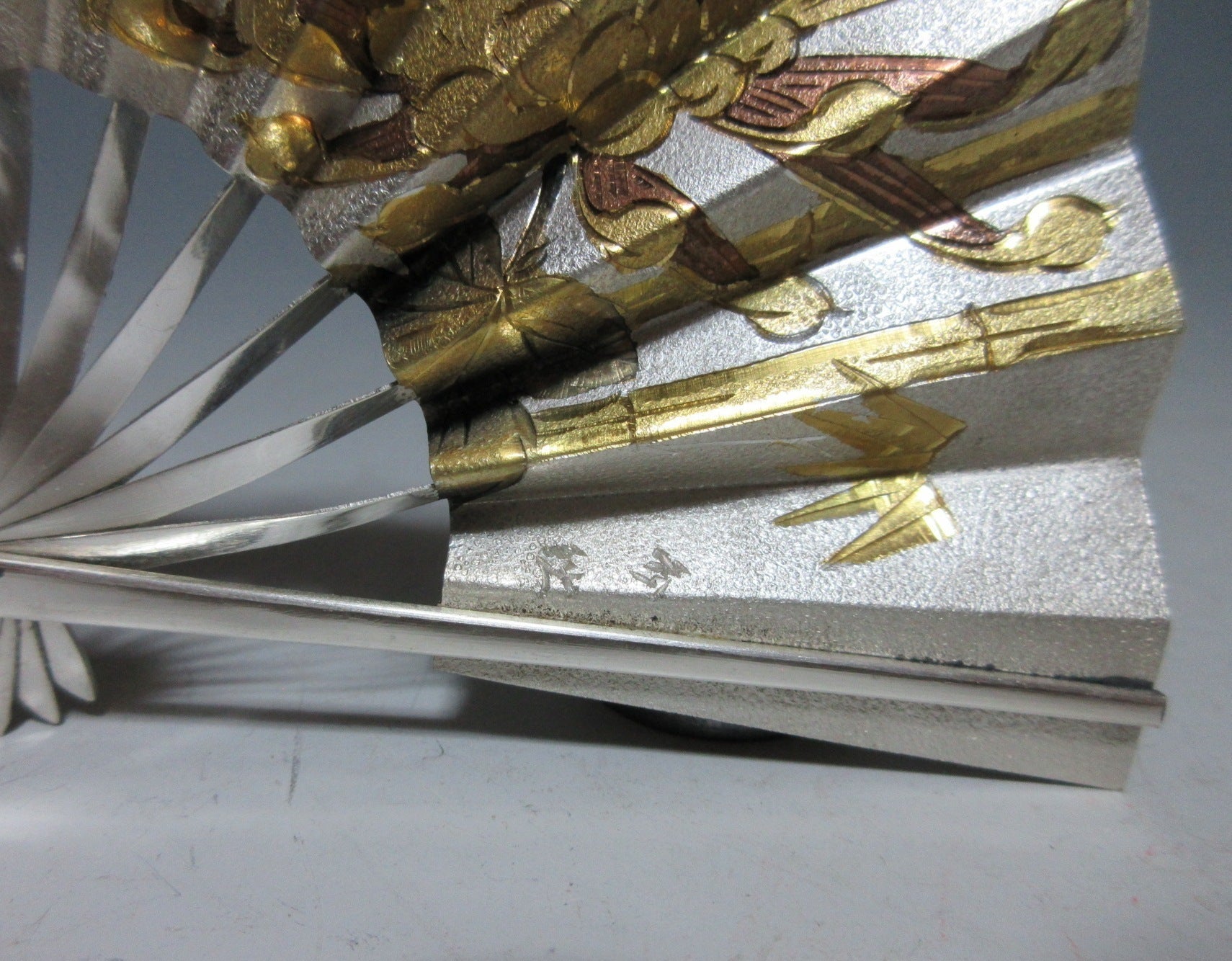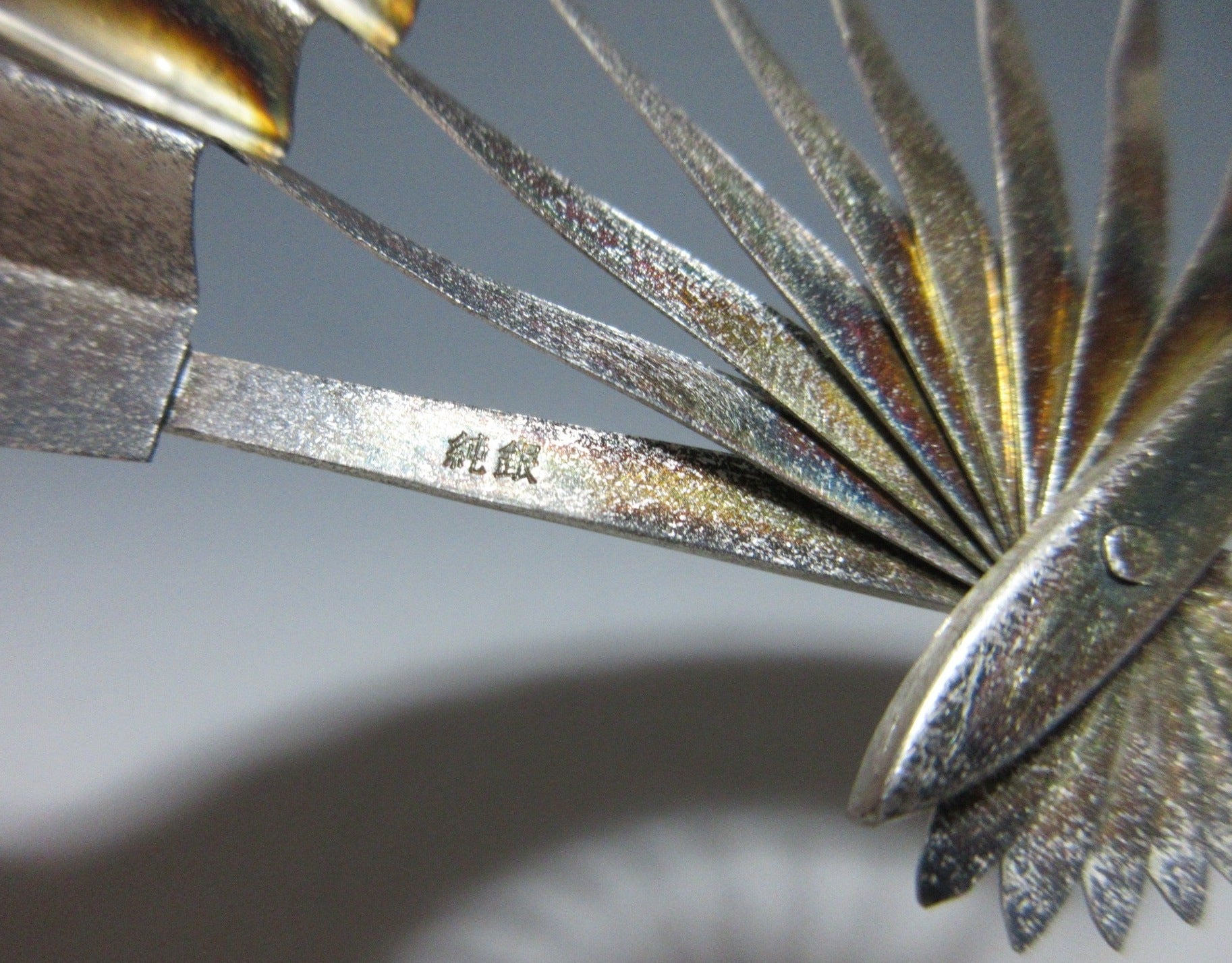 This listing is for a small silver fan made around 30 years ago. It is stamped ‘jungin’, which translates as pure silver. Silver with the jungin mark means that the silver content is around 95%, that is a fineness above sterling silver which has to be a minimum of 92.5%. It comes with the glass display case in the photos, as well as the black stand. The little plaque attached to the front of the display case says ‘2nd Place Award 1994’ and it was received at a golf tournament. The fan is signed on the front and is decorated with plum blossoms, a chrysanthemum, bamboo and a small iris.