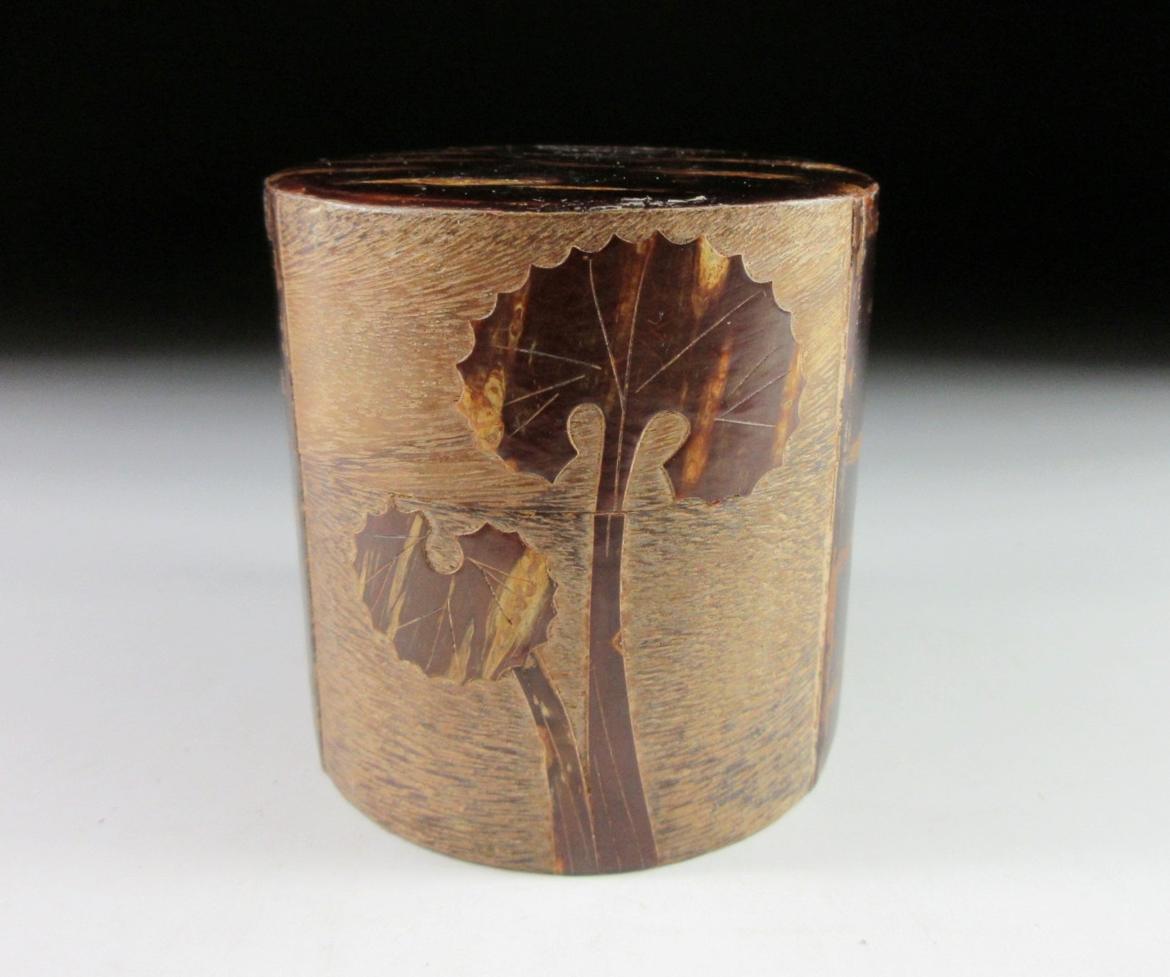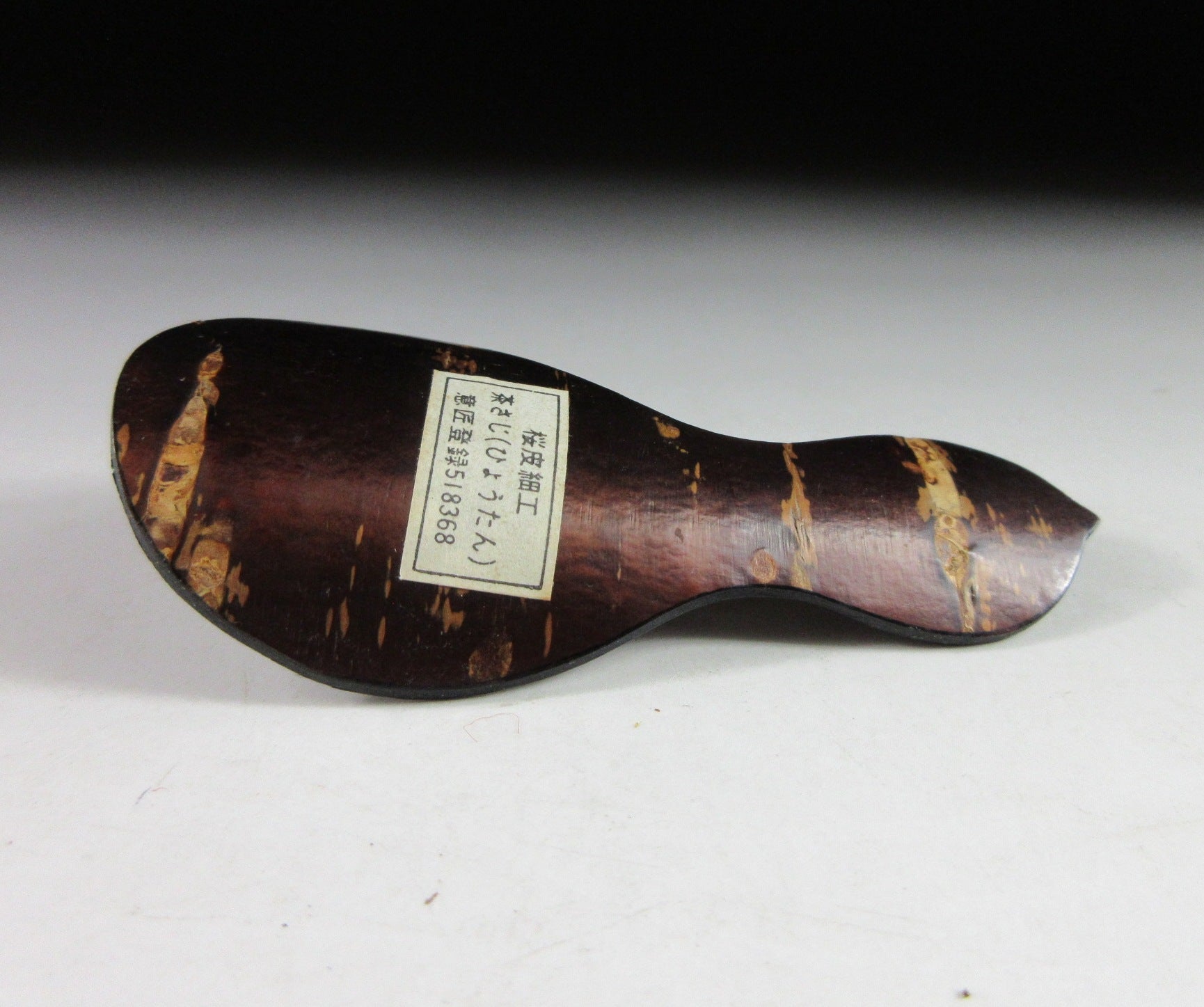 This listing is for a Kaba-zaiku cherry bark tea caddy with scoop made around 30 years ago. The interior of the caddy is made of tin and there is an outer lid and an inner lid to keep your tea nice and fresh. The carving on the front of the caddy is of a butterbur leaf, a plant highly revered for its medicinal qualities. Cherry bark has been in use since early the 1700s by craftsmen who produced tobacco cases, fumibako and chopsticks for the ruling class. To make a tea caddy, a skilled craftsman needs to scrape and polish the bark until the surface becomes smooth and shiny. It is then applied to the surface of cherry wood. These types of canisters should never be washed along with your other dishes. To clean it, simply wipe it down with a damp cloth and leave it air dry.