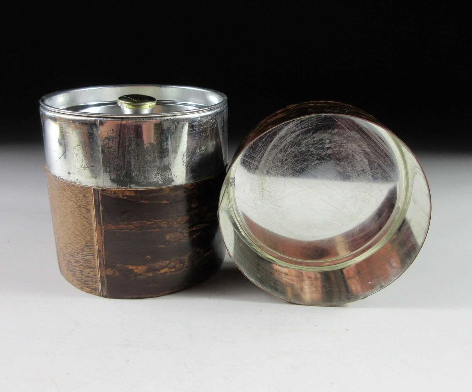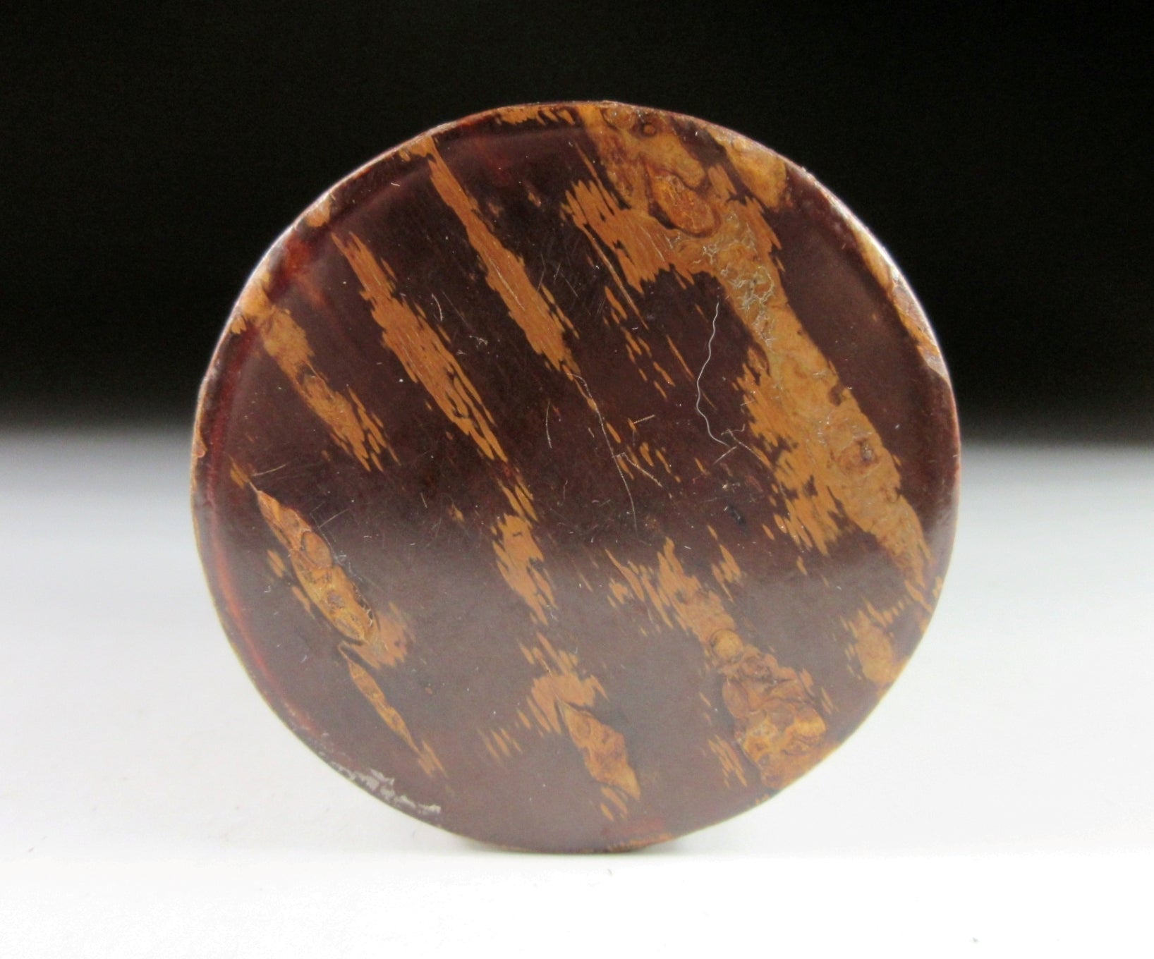 There are scratches on the interior, scratches where the lid turns, and scratches under the lid. The bark is in pretty good condition, just a couple light scratches on the lid, and a small patch of wear. The scoop is in very good condition.