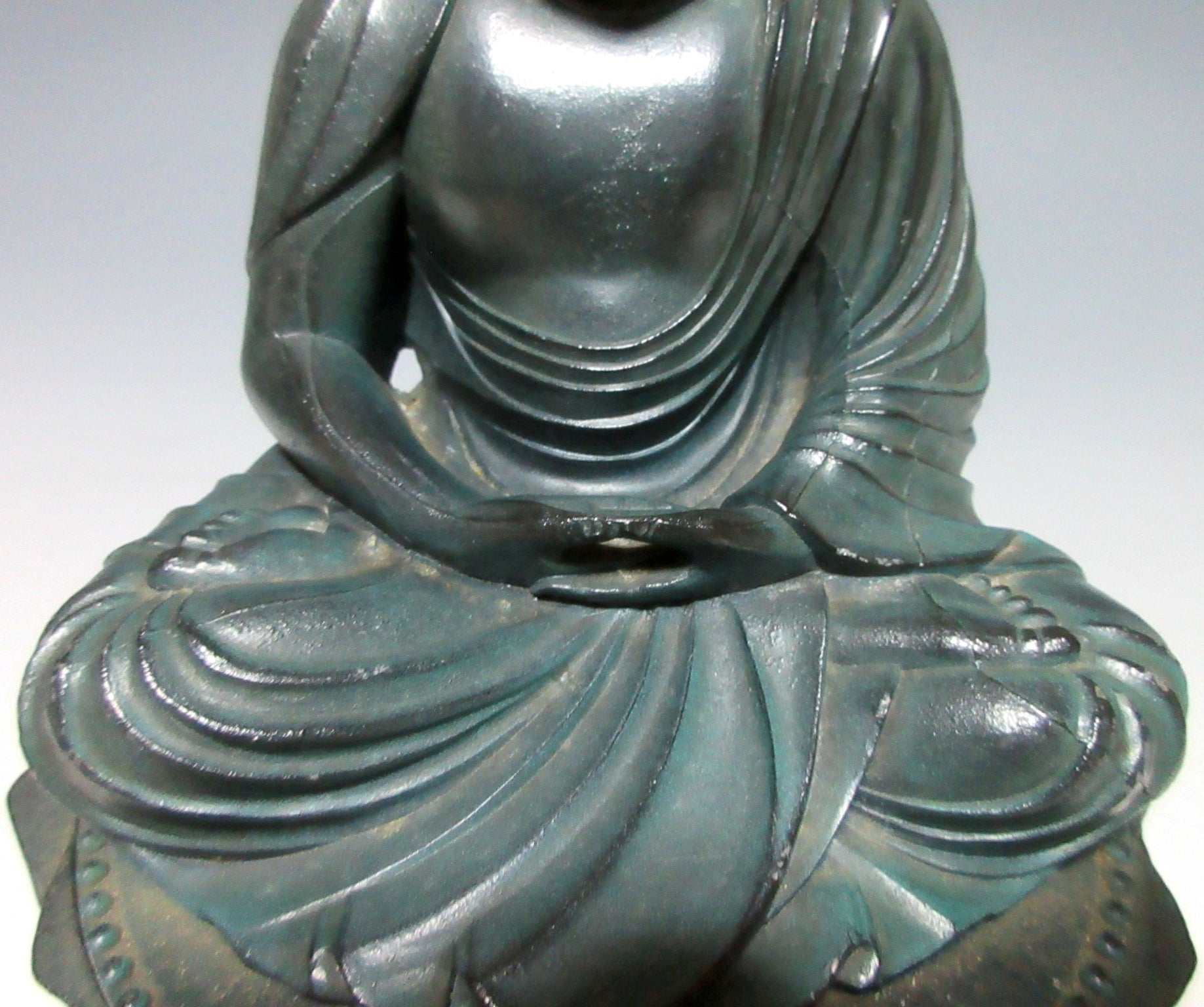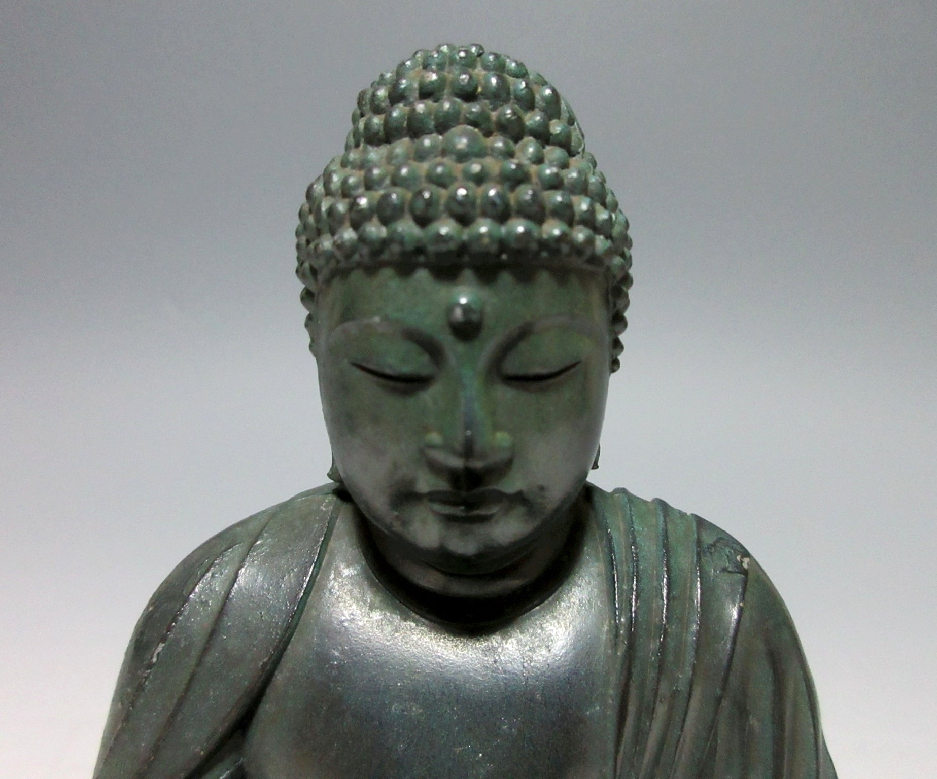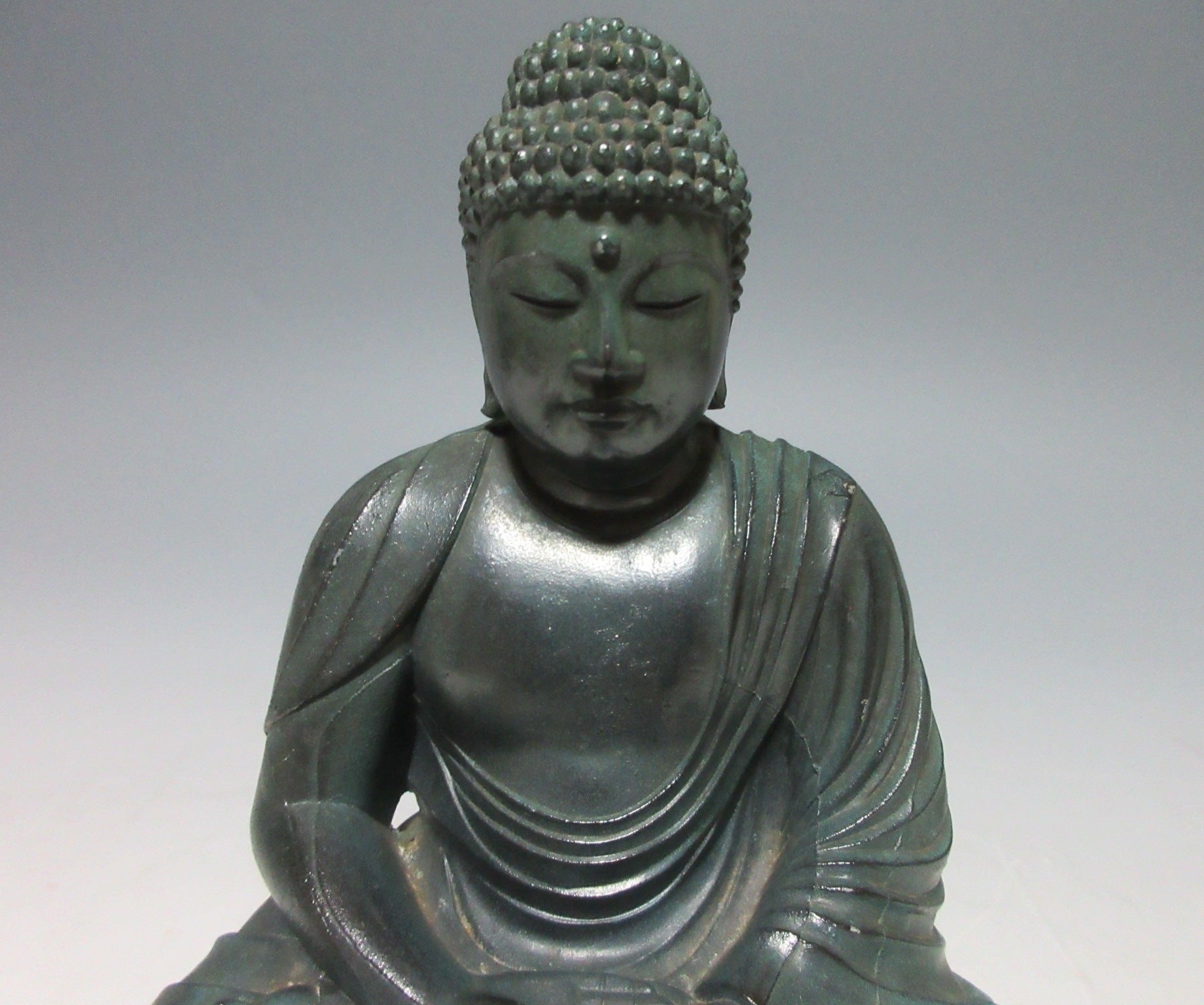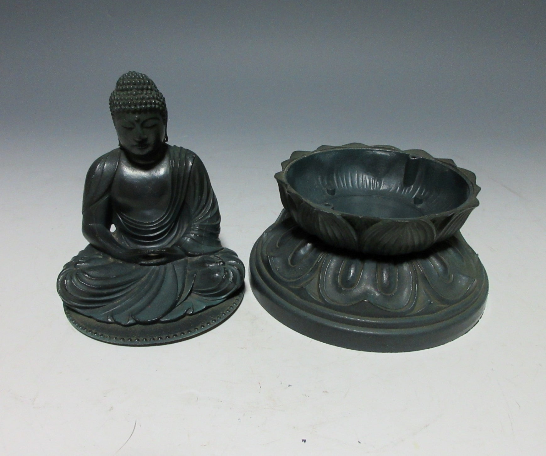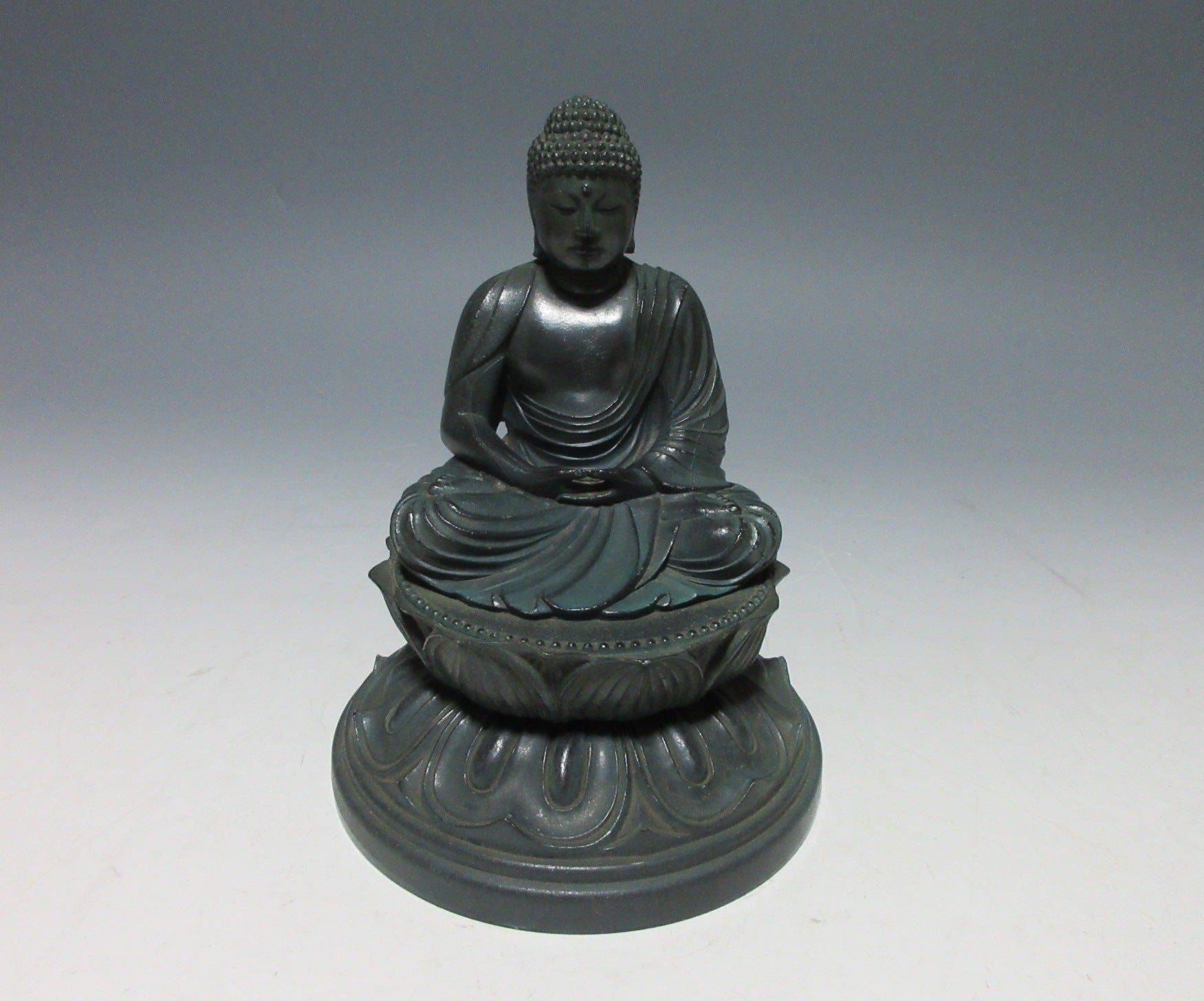 This listing is for a metal Kamakura Daibutsu ornament made around 10-20 years ago. It separates into two parts with the lower part serving as a trinket box. The Kamakura Daibutsu (the Great Buddha of Kamakura) was originally a large wooden structure completed in the year 1252 at Kotoku-in Temple in Kamakura. It was severely damaged in a storm and then rebuilt as a cast metal structure housed in a large hall. The hall was destroyed during a storm in 1334 and rebuilt, but then washed away during a tsunami in 1369. The Great Buddha is now an open air structure and designated as a National Treasure. It attracts thousands of visitors every year and is one of the main attractions in the Tokyo area.