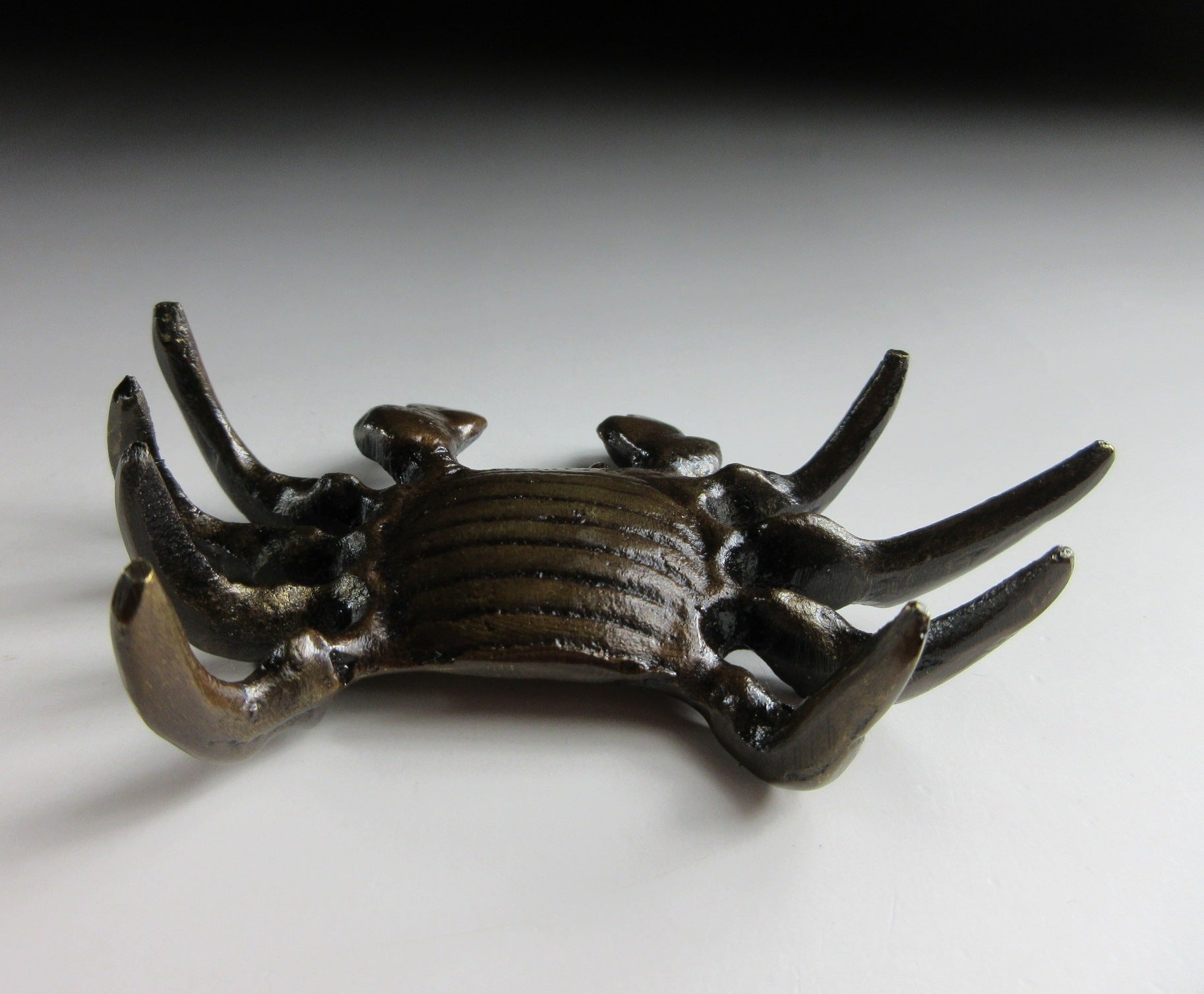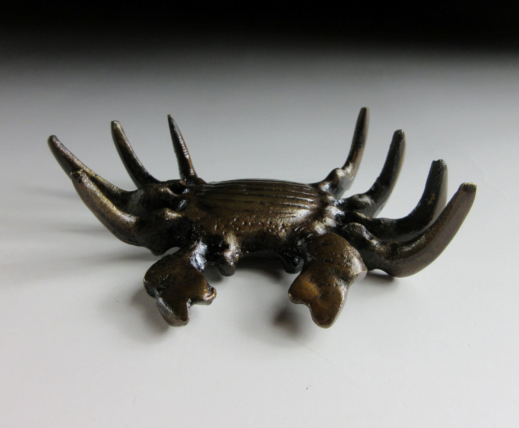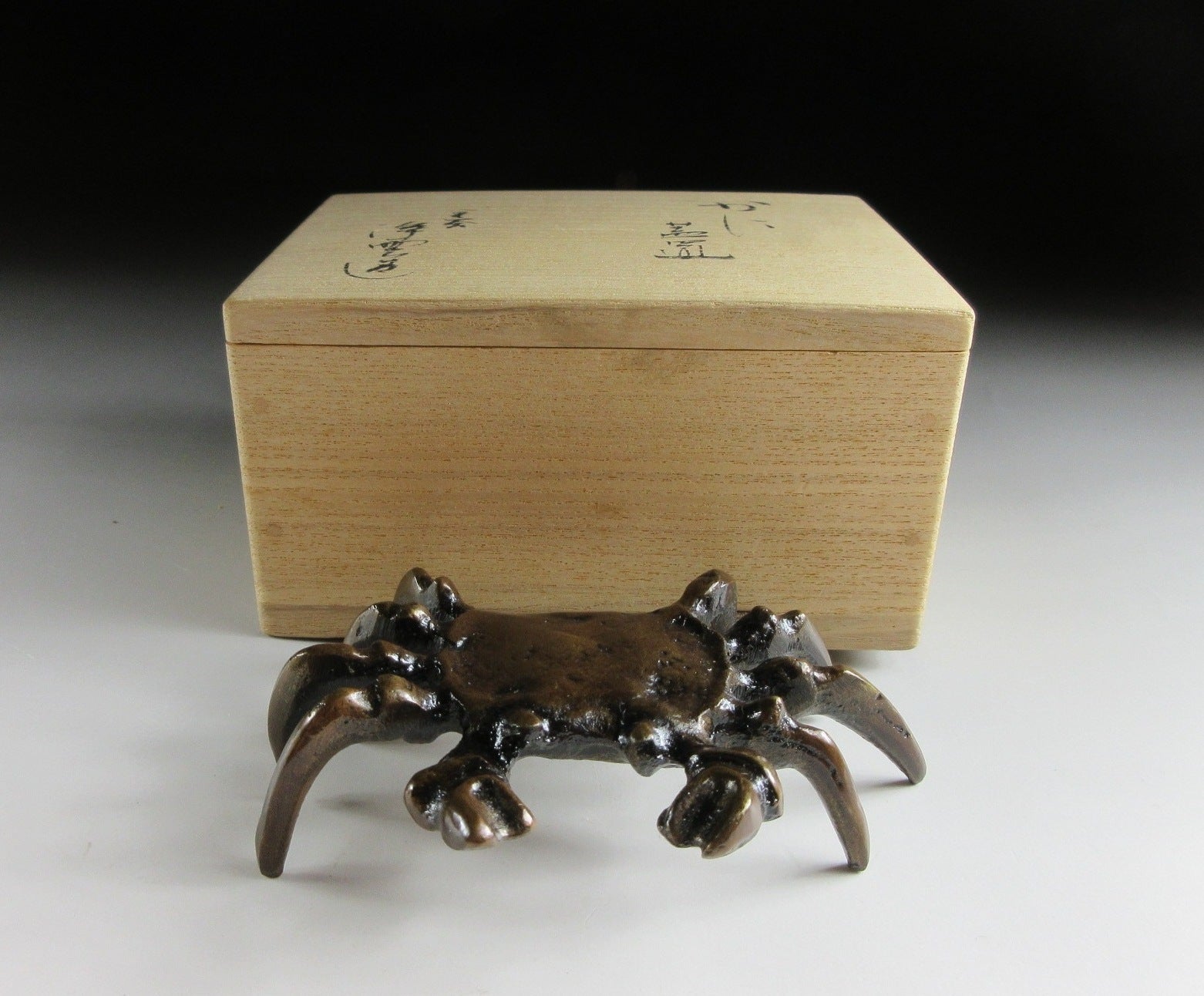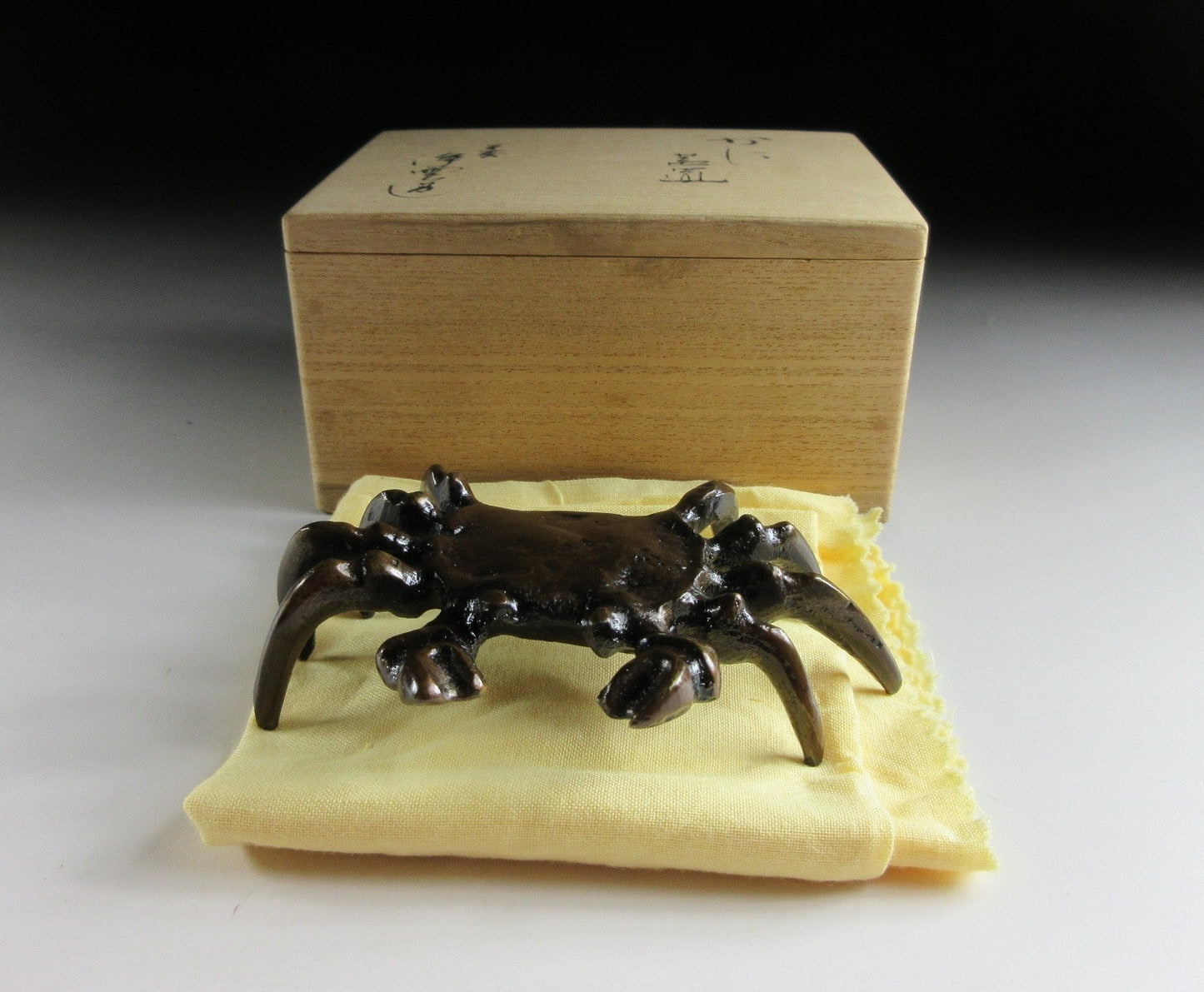 This listing is for a vintage futaoki made around 20 years ago by master craftsman, Kanaya Joun. A futaoki functions as a lid rest during the tea ceremony. The lid of the kama is placed on the futaoki when hot water needs to be drawn from the kettle. The bamboo water ladle rests there up until the lid of the kama is removed. The futaoki featured in this listing is made of copper and moulded to resemble a crab. It comes with its original signed wooden storage box, as well as a yellow wrapping cloth for when the item is not in use.