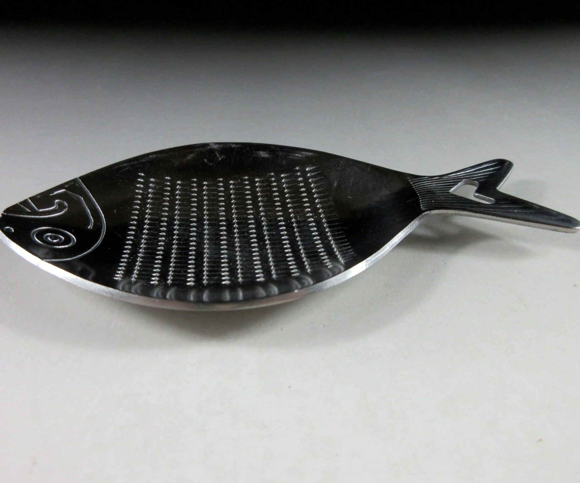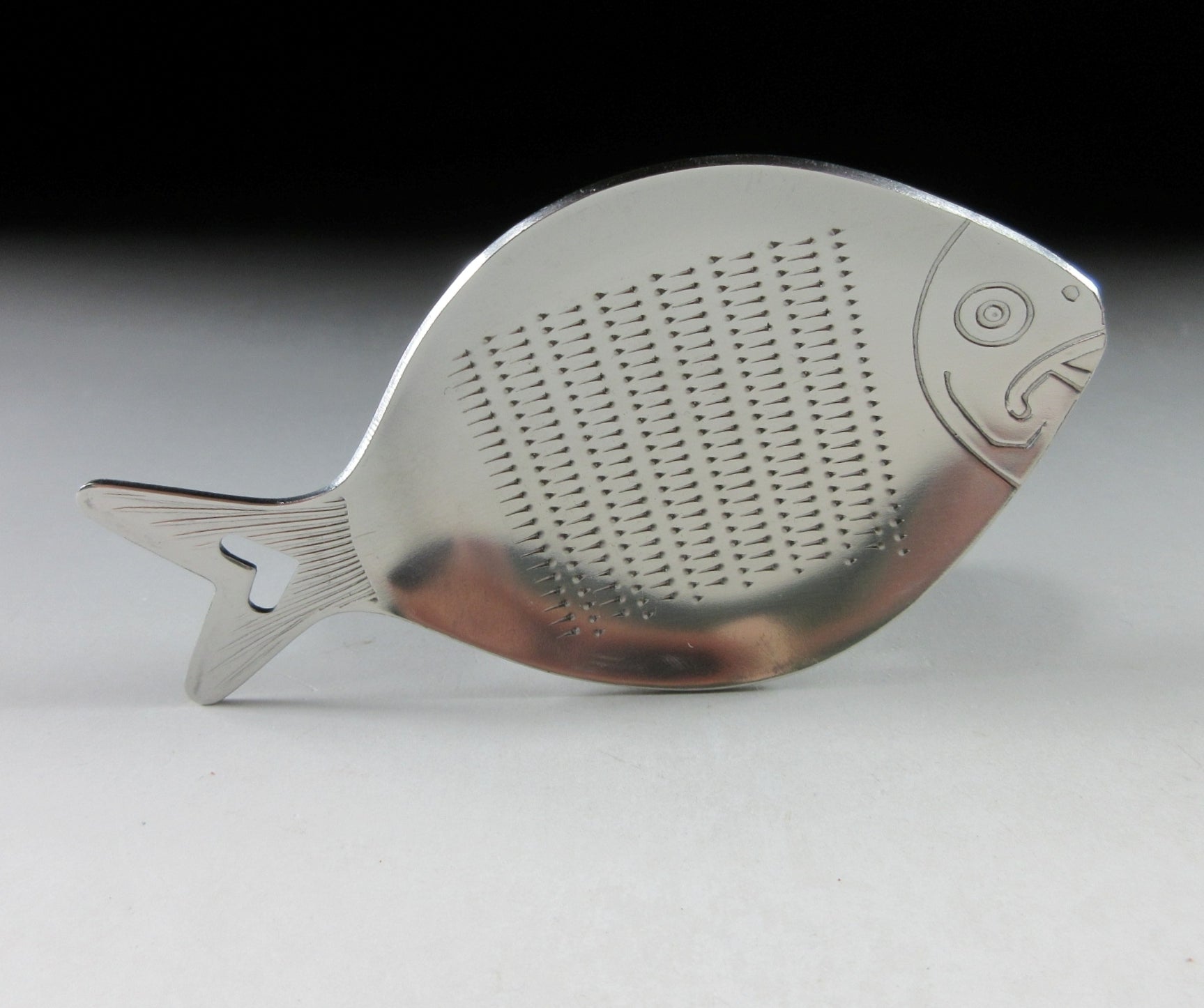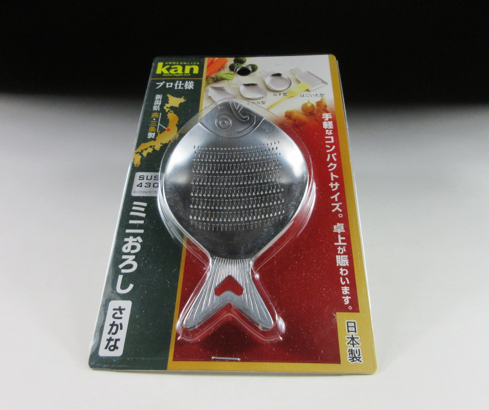 This listing is for a small Made in Japan stainless steel grater made by Kankuma. It is moulded to resemble a fish, and is intended for grating garlic, radish etc. It has a heart-shaped hole on the tail so it can be hung from a hook, and it comes with its original packaging.