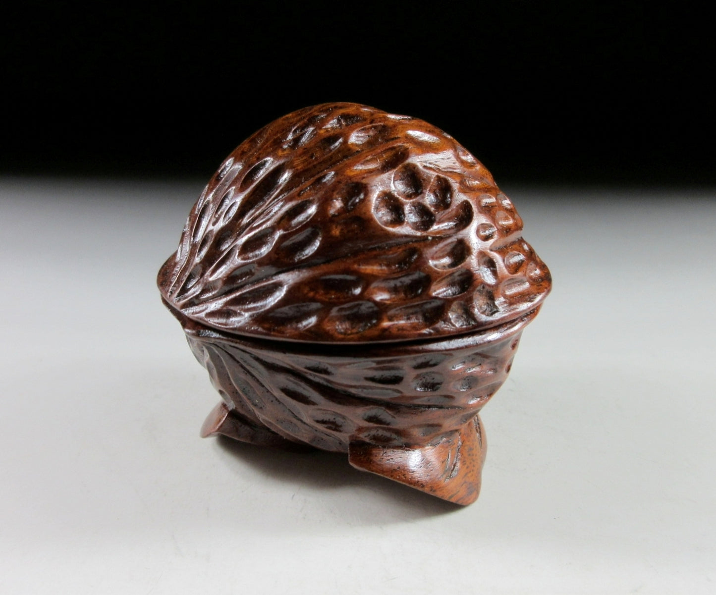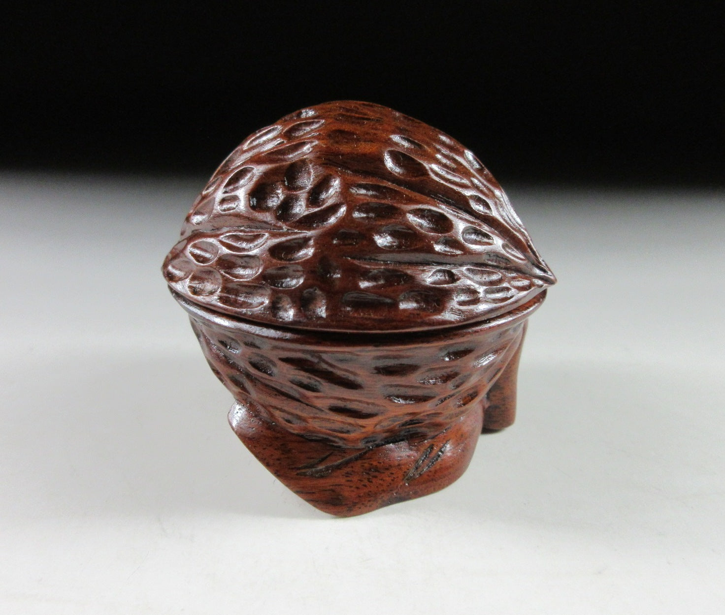 This listing is for a wooden urushi lacquerware kogo made around 20 years ago. It is made of karaki wood and carved to resemble a peach seed, and finished with clear lacquer. Wooden kogo are intended for use during summer and for woodchip incense, however its nice round shape makes it perfect for holding kneaded incense as well. It comes with its original paper storage box.