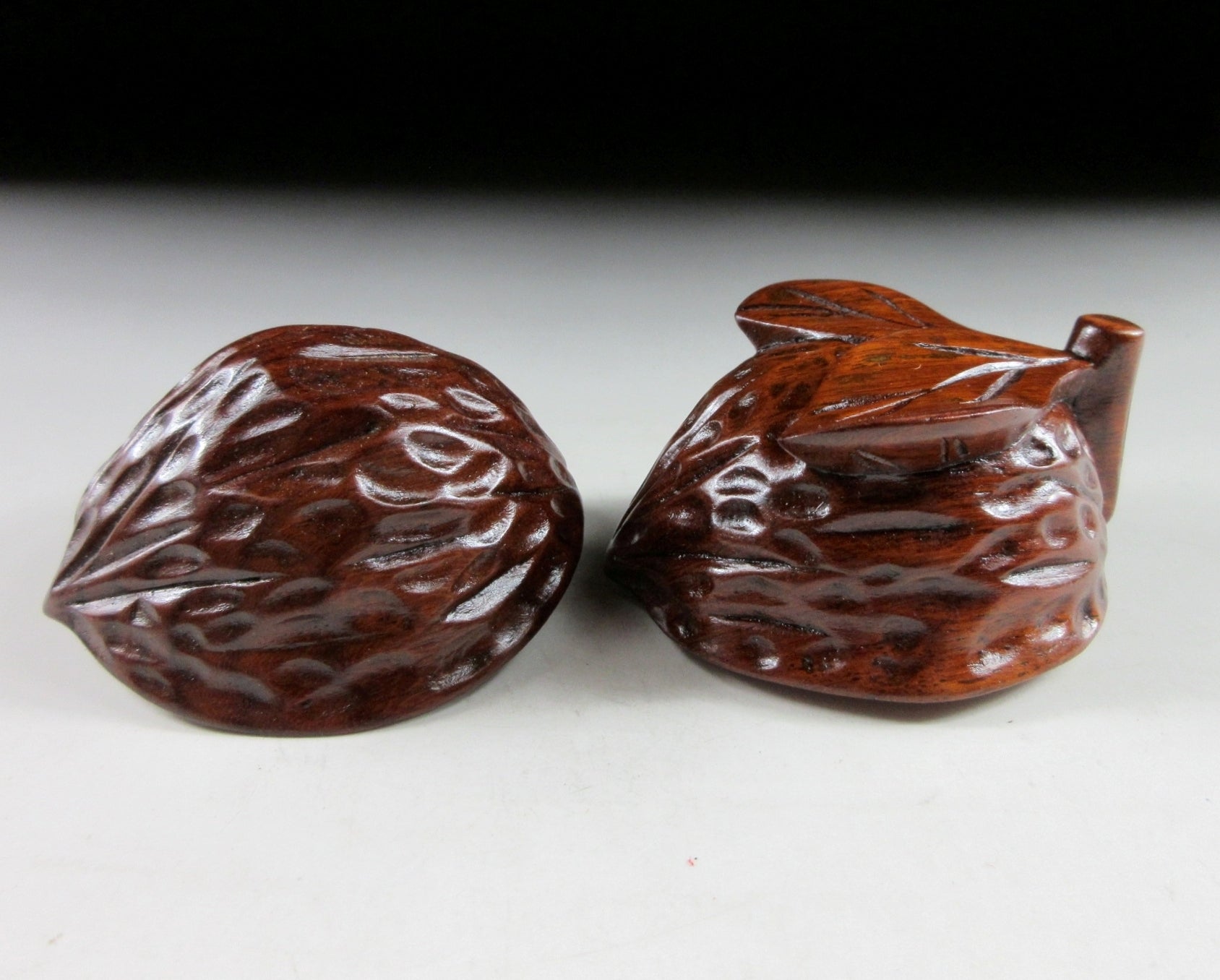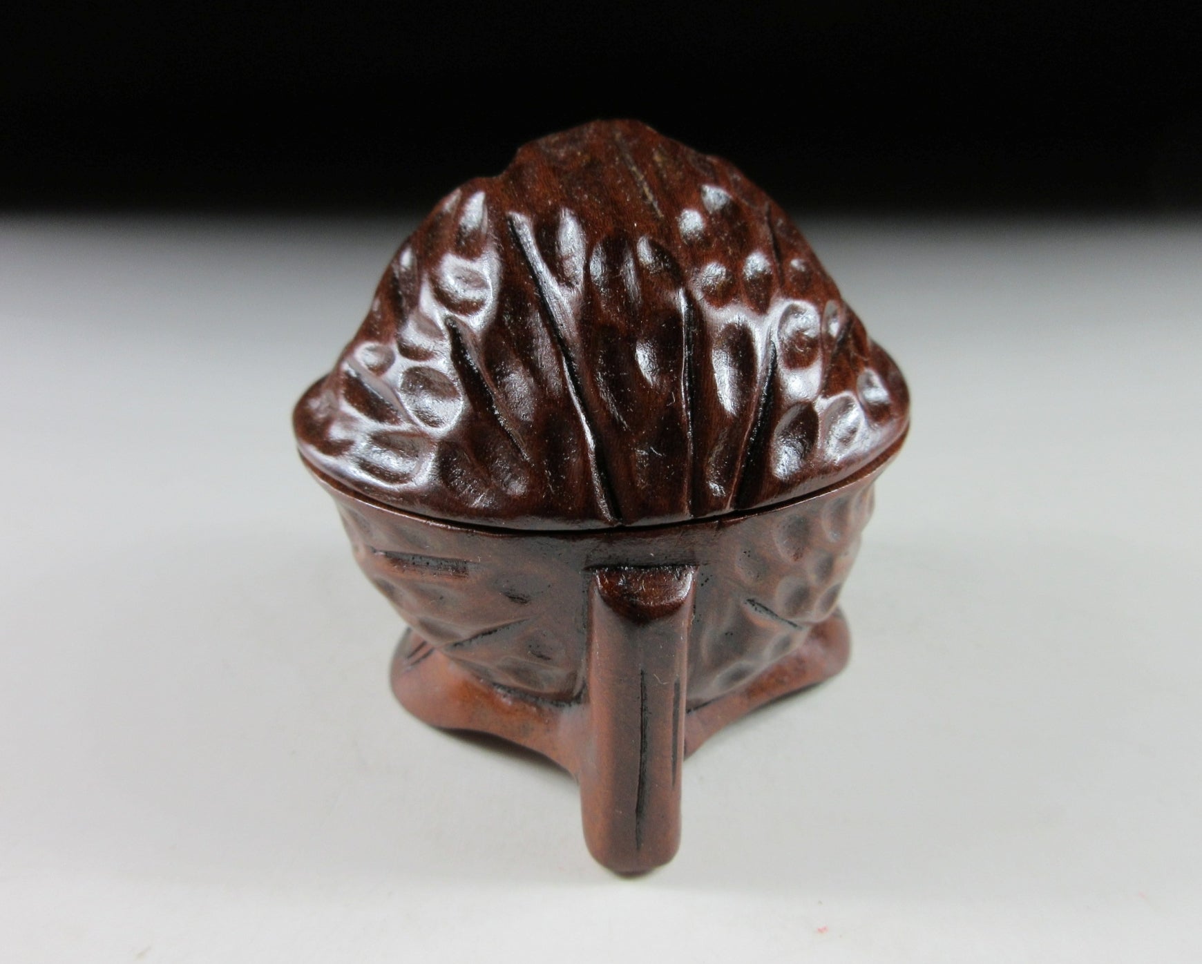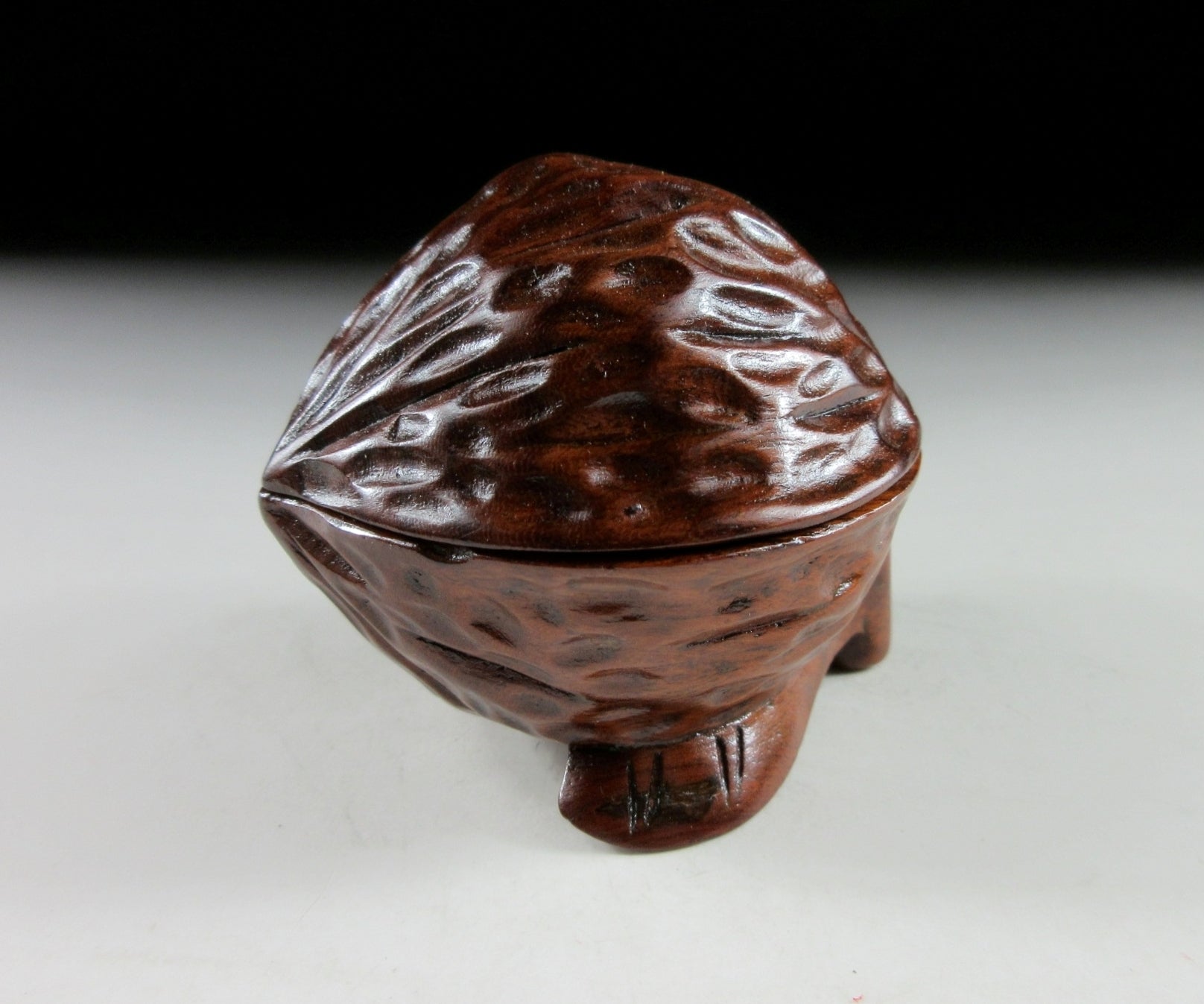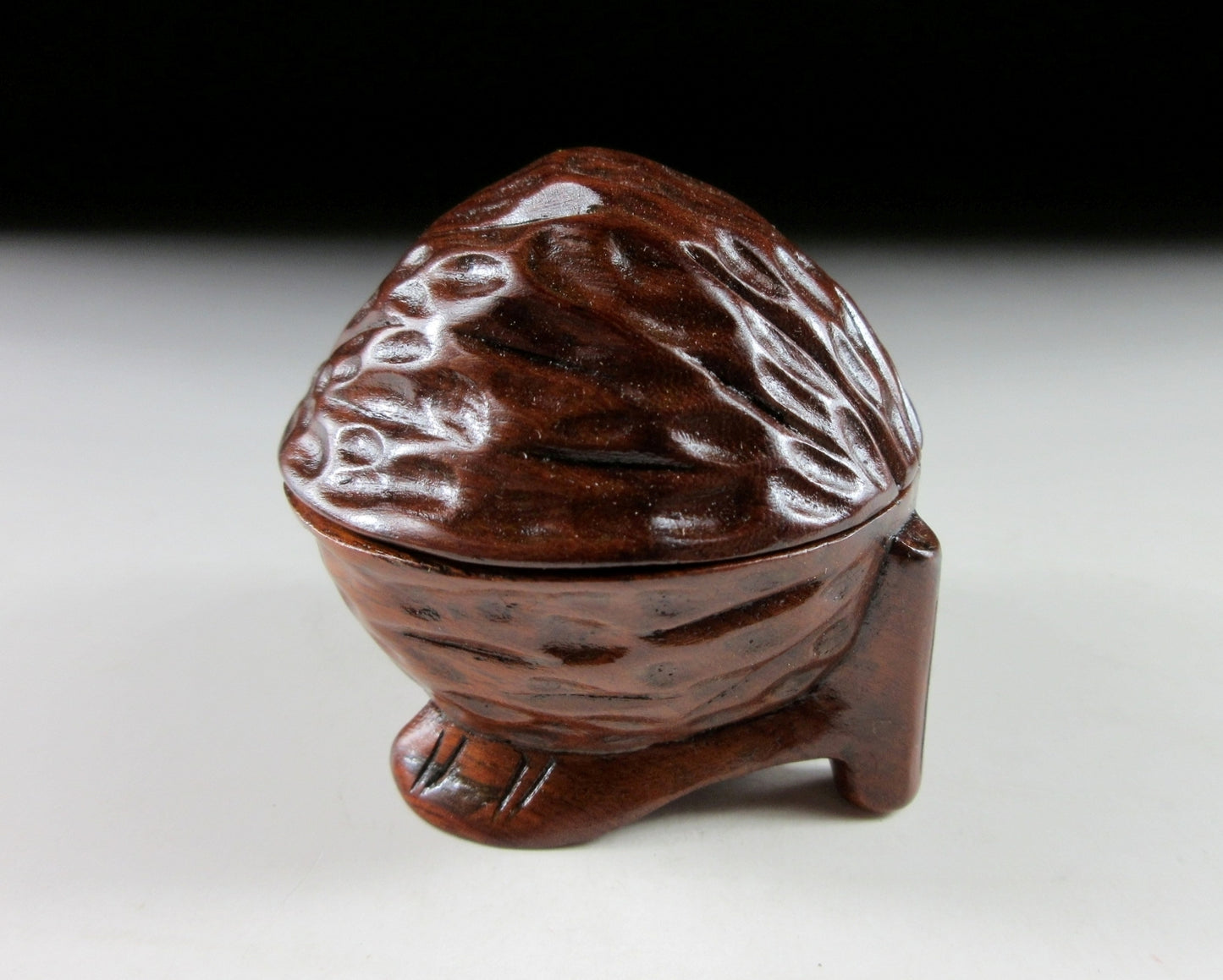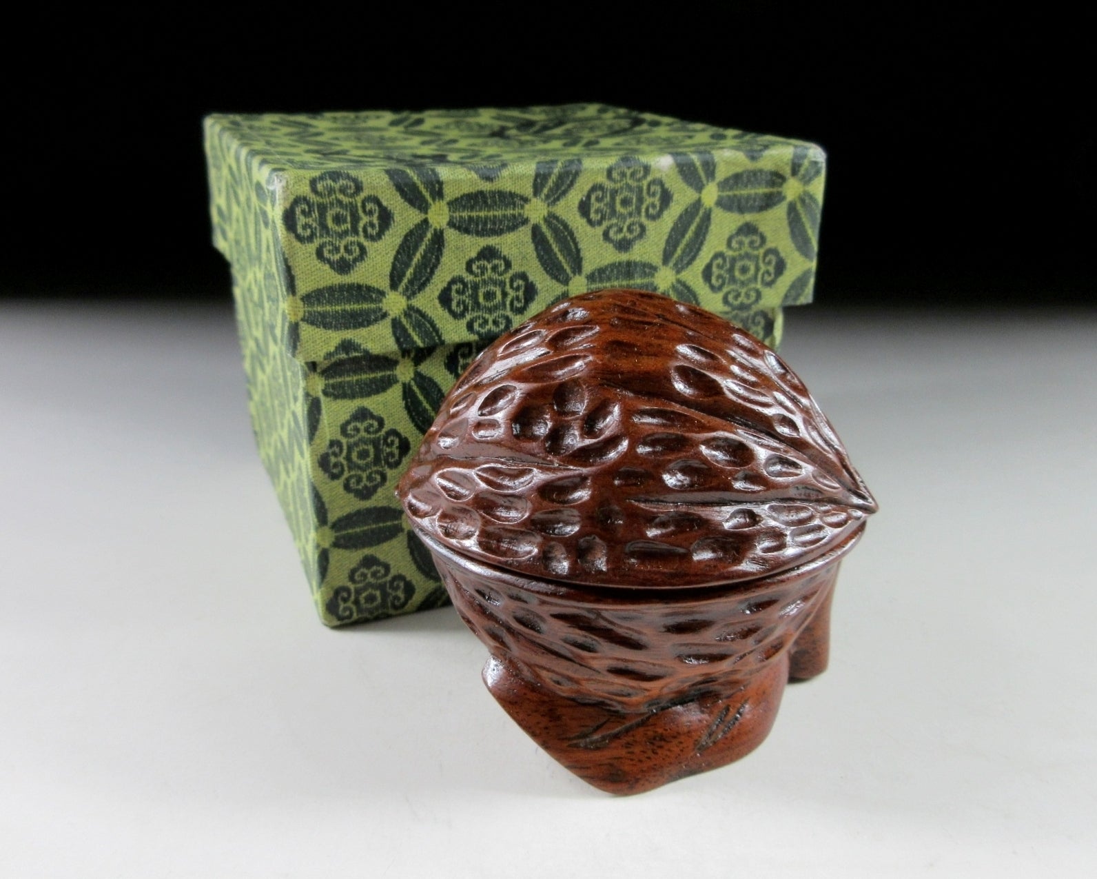 This listing is for a wooden urushi lacquerware kogo made around 20 years ago. It is made of karaki wood and carved to resemble a peach seed, and finished with clear lacquer. Wooden kogo are intended for use during summer and for woodchip incense, however its nice round shape makes it perfect for holding kneaded incense as well. It comes with its original paper storage box.
