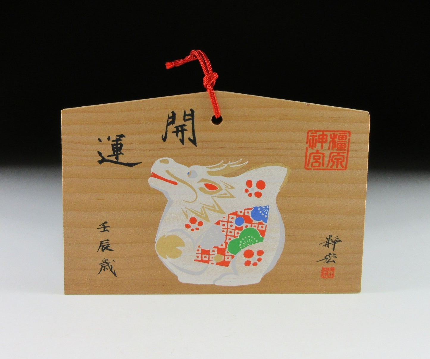 This listing is for a wooden ema from Kashihara Jingu Shrine in Nara. Kashihara Jingu was built in 1890 at the site where Emperor Jimmu was said to have acceded to the throne in the year 660. The front of the ema is decorated with a white dragon ornament, and was most likely purchased to commemorate the Year of the Dragon back in 2000. This ema came in a wooden box containing 28 different ema collected over a 28-year period.