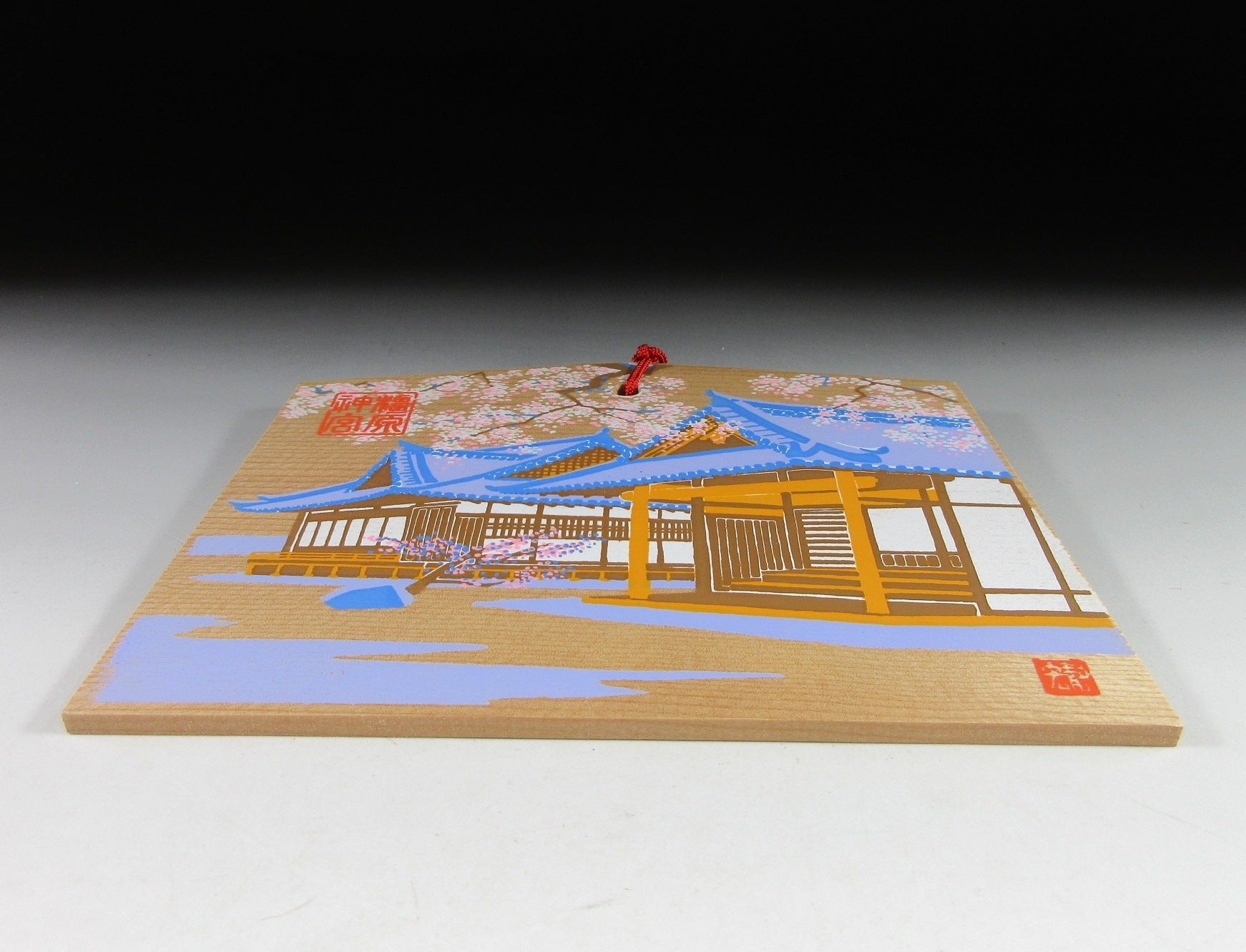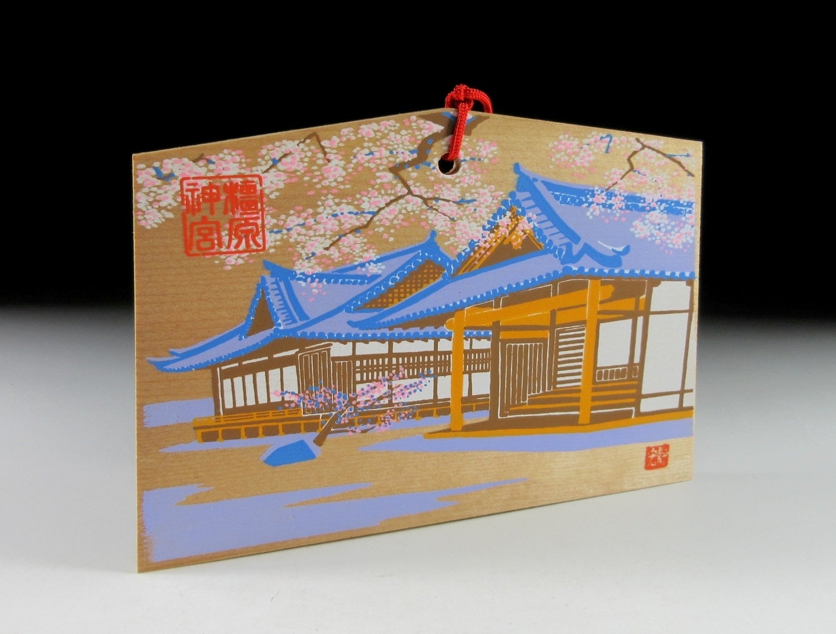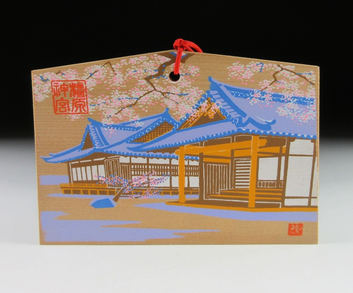 This listing is for a wooden ema from Kashihara Jingu Shrine in Nara. Kashihara Jingu was built in 1890 at the site where Emperor Jimmu was said to have acceded to the throne in the year 660. The front of the ema is decorated with a view of the shrine during cherry blossom season. This ema was most likely purchased in the 1990s, and came in a wooden box containing 28 different ema from the same shrine. It appears the previous owner collected these over a 28 year period.