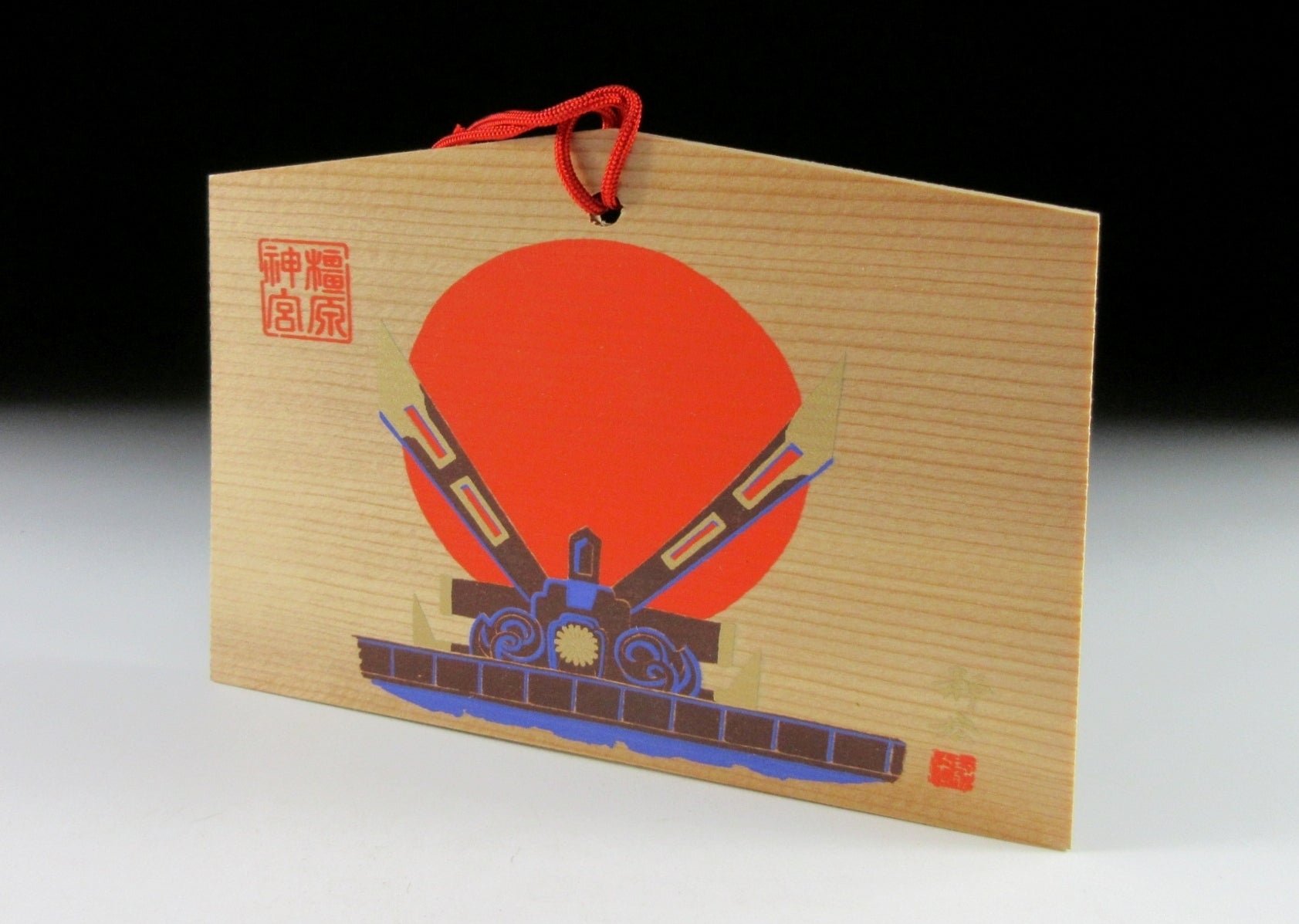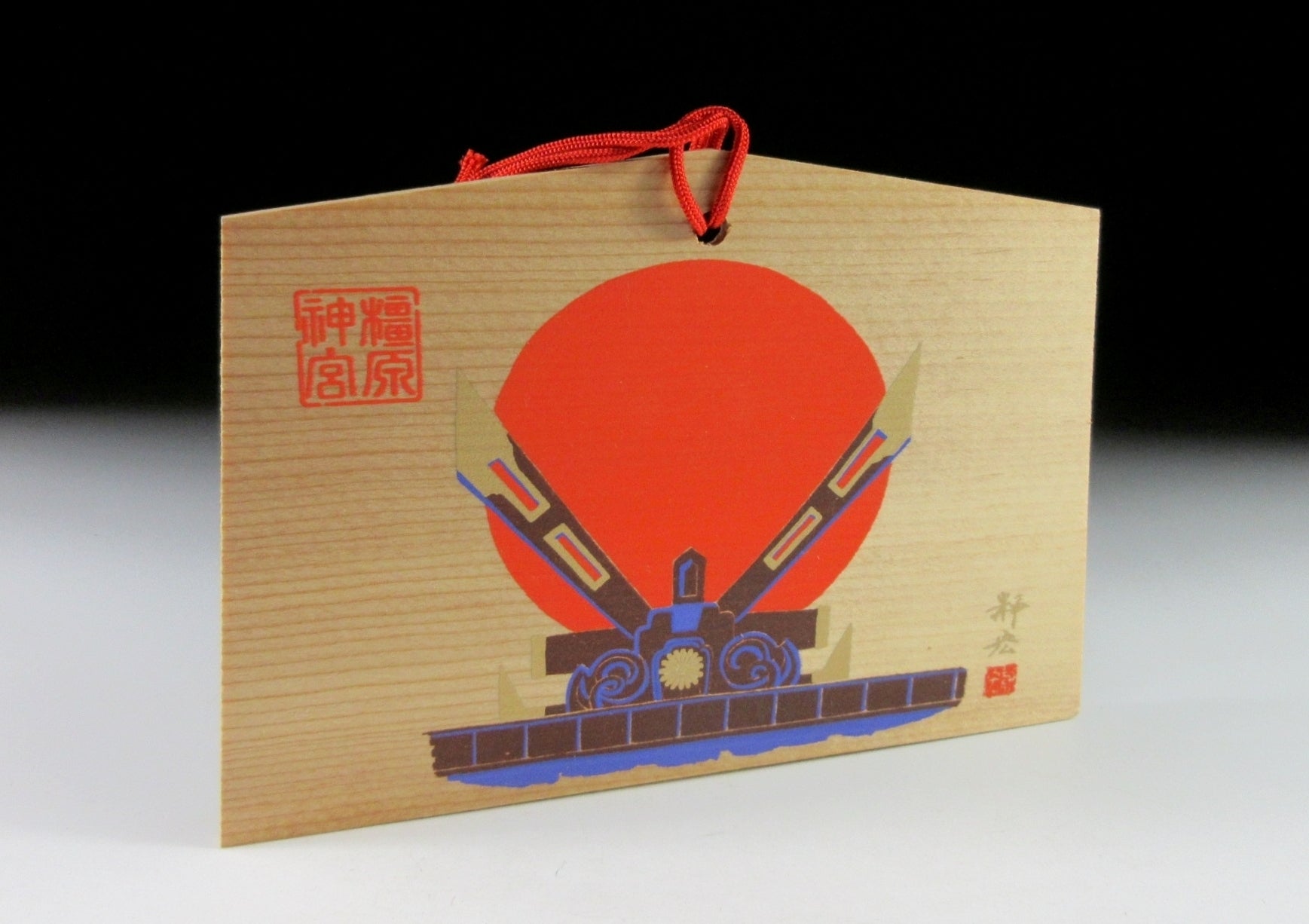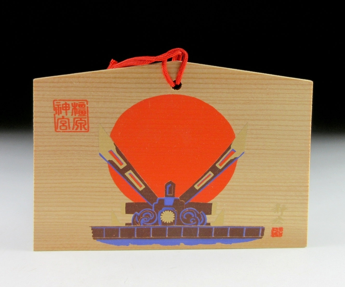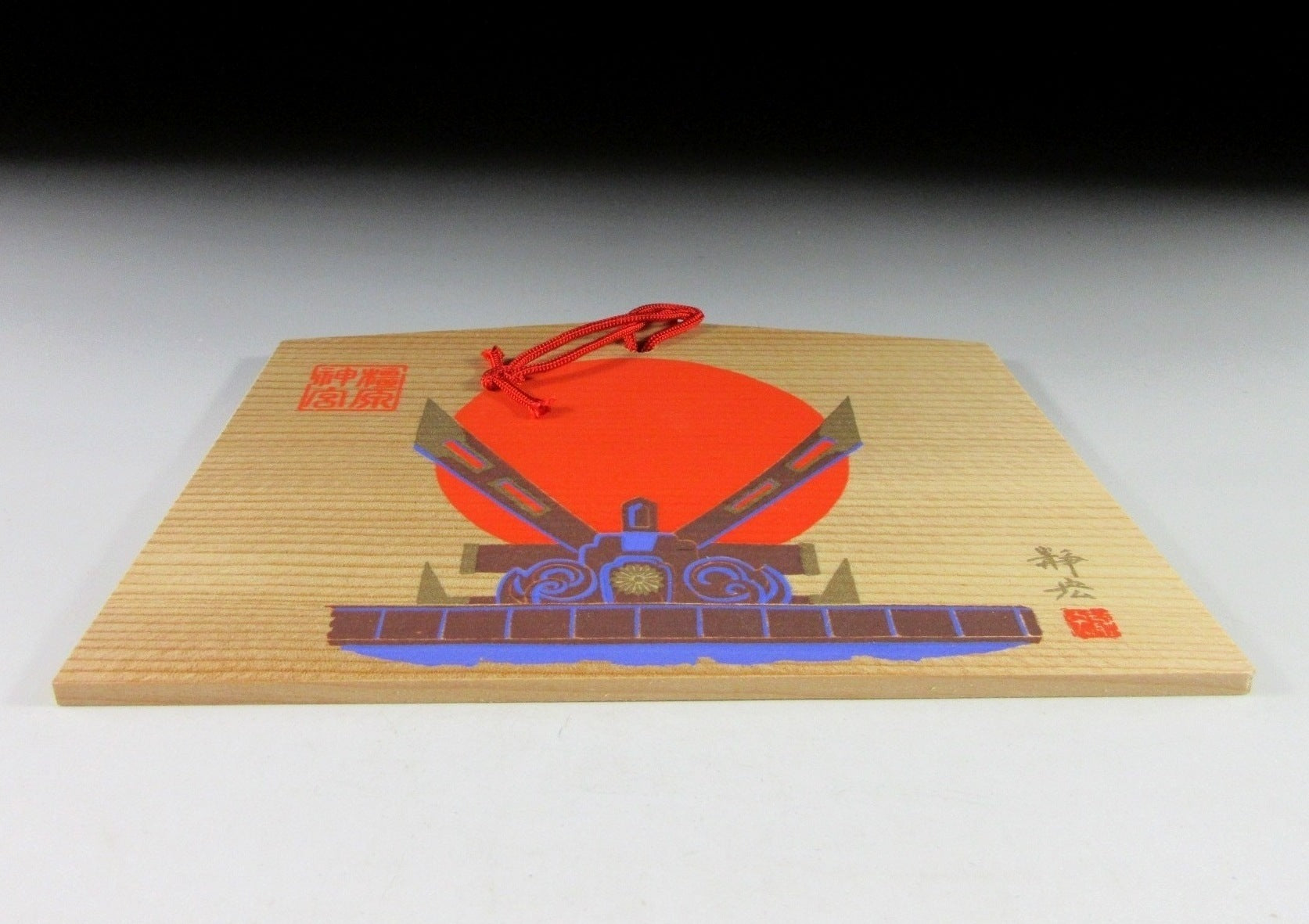 This listing is for a wooden ema from Kashihara Jingu Shrine in Nara. Kashihara Jingu was built in 1890 at the site where Emperor Jimmu was said to have acceded to the throne in the year 660. The front of the ema is decorated with the rising sun behind part of the shrine roof. This ema was most likely purchased in the 1990s, and came in a wooden box containing 28 different ema from the same shrine. It appears the previous owner collected these over a 28 year period.