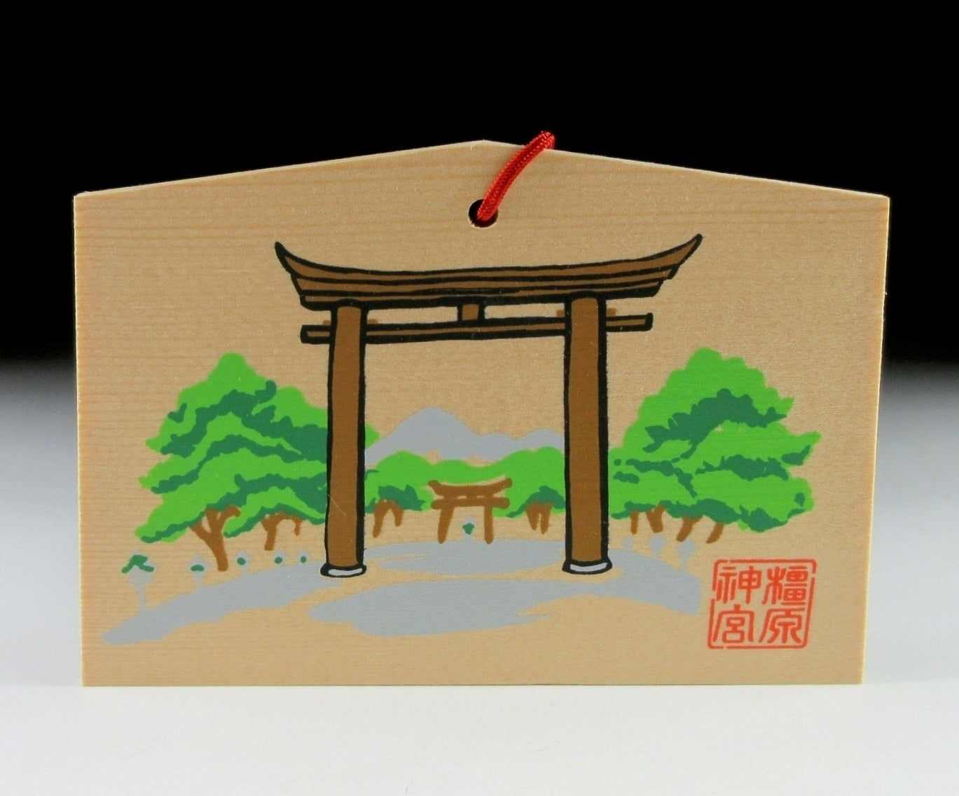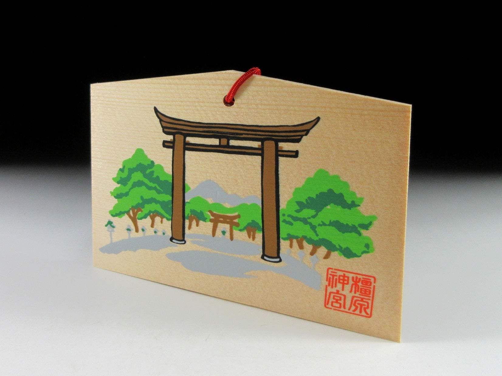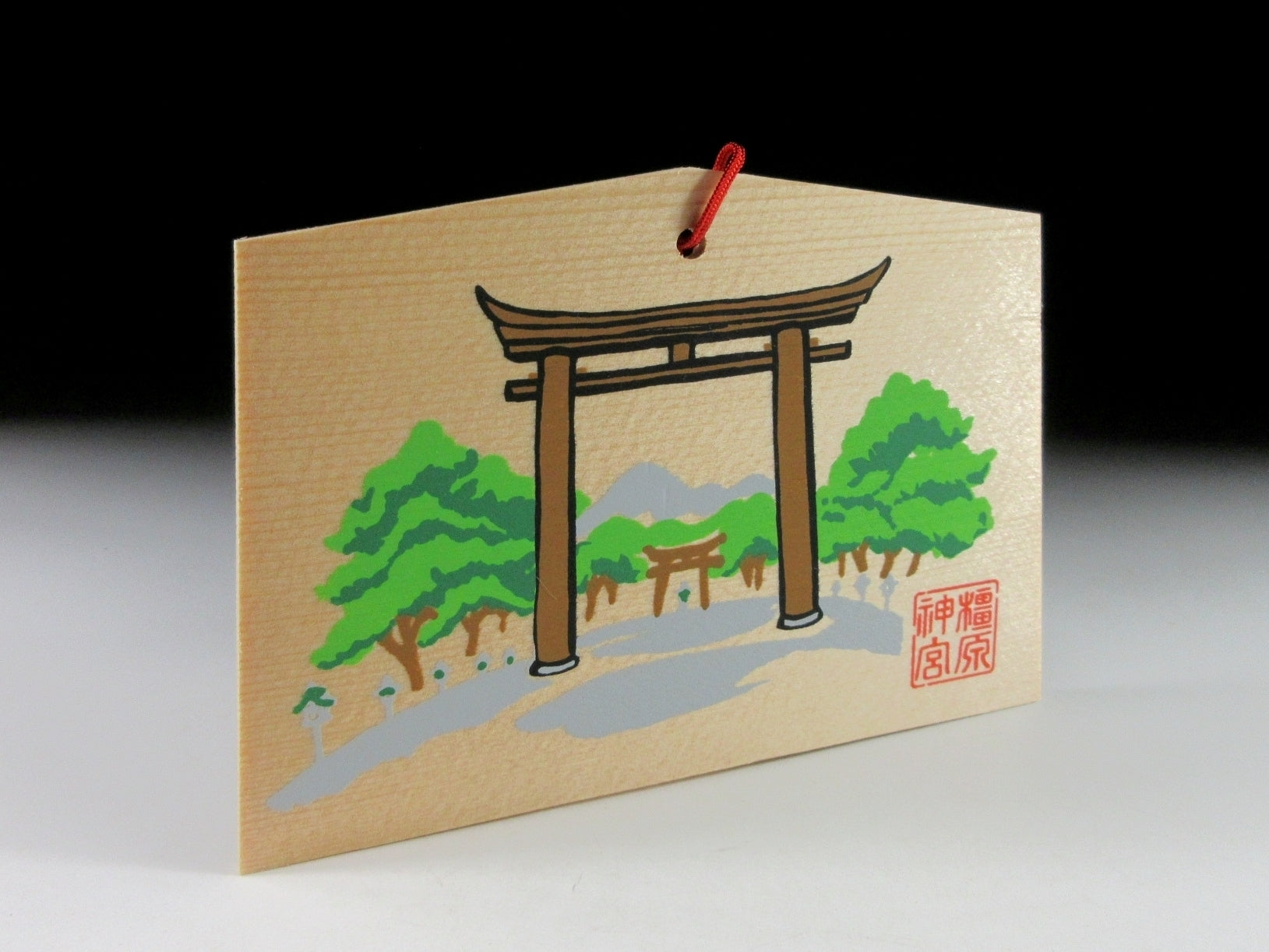This listing is for a wooden ema from Kashihara Jingu Shrine in Nara. Kashihara Jingu was built in 1890 at the site where Emperor Jimmu was said to have acceded to the throne in the year 660. The front of the ema is decorated with the torii that stands at the entrance of the shrine. This ema was most likely purchased in the 1990s, and came in a wooden box containing 28 different ema from the same shrine. It appears the previous owner collected these over a 28 year period.