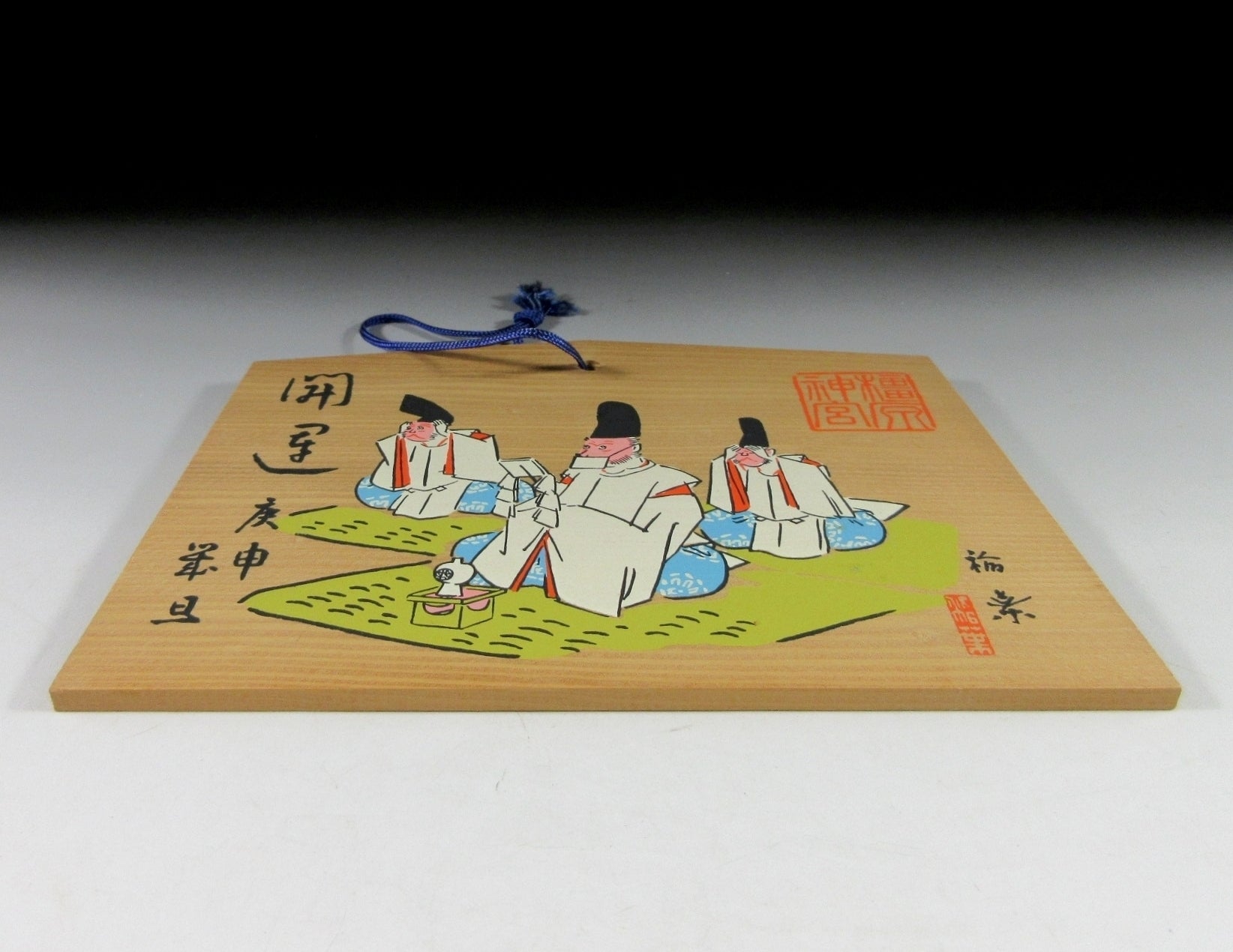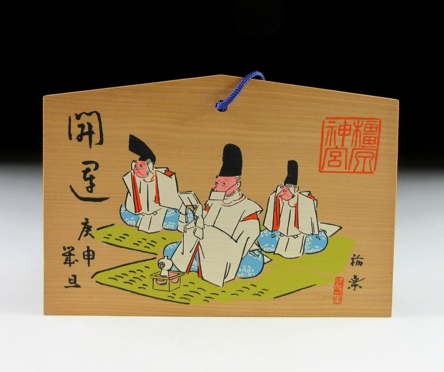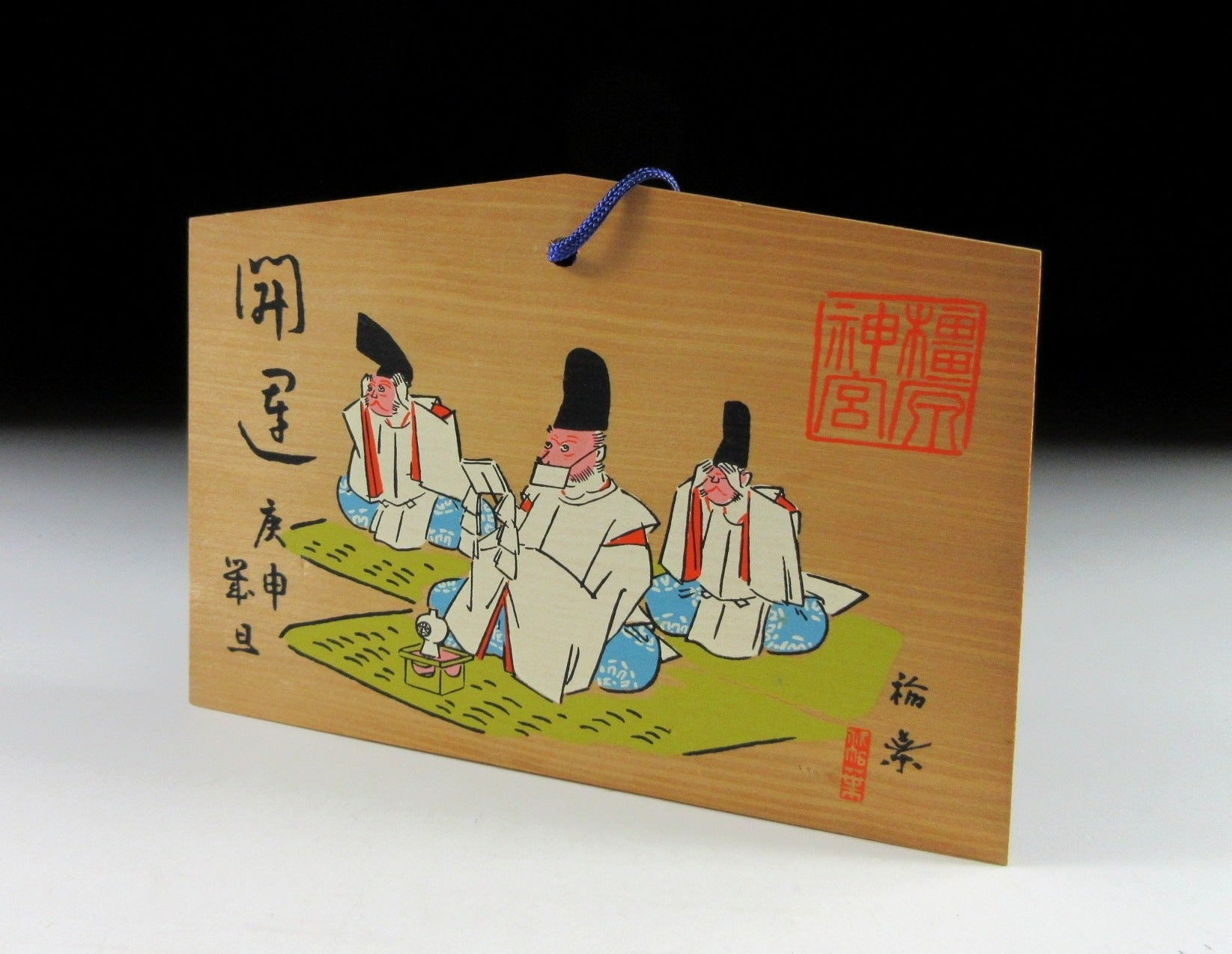 An ema is a traditional wooden votive prayer on which Shinto and Buddhist worshippers inscribe their wishes or prayers. Ema typically depict figures and zodiac animals, and they are hung at shrines and temples in the hope that the gods receive them and answer their prayers. The very first ema were said to be painted pictures of horses which were offered to shrines in place of real horses. The tradition of donating horses goes back to one of the first emperors of Japan, down in Kyoto. This was done to appease the gods when the weather wasn’t cooperating – a white horse was given to ease unseasonably heavy rainfall, and a black horse was offered to curb a drought. Traditionally ema were very large in size and often painted by well-known artists and craftsmen. During the Edo period they began to change in size due to the number of ordinary people travelling around the country visiting shrines and temples. These everyday folks were not so wealthy so shrines began to offer small wood framed ema as an alternative. This particular type were either hand painted by artists, or by those commissioned by the shrine. Sadly not many remain as most of them were burned in ritual fires at the end of each year.