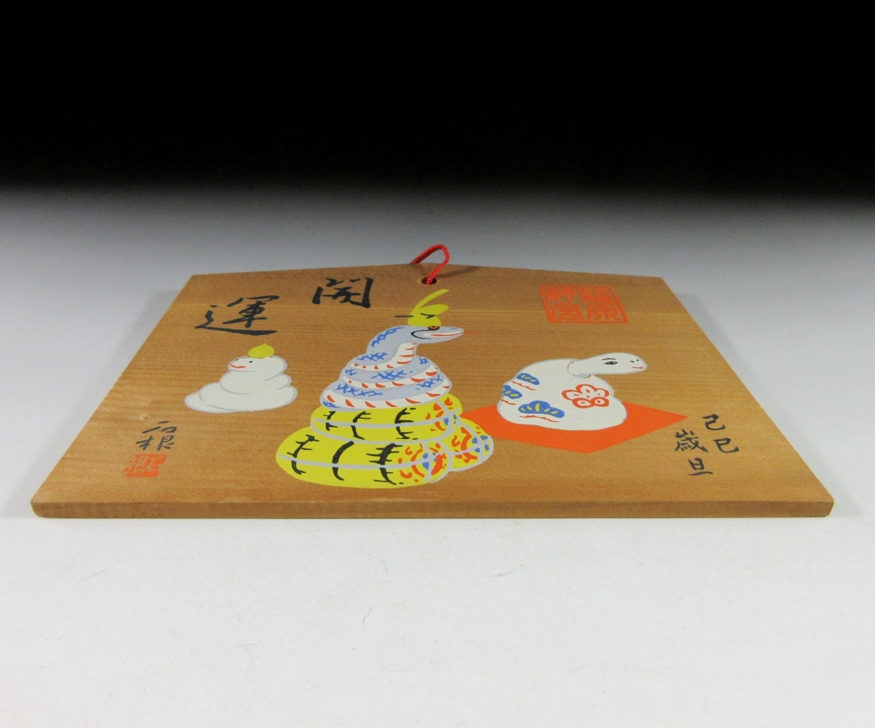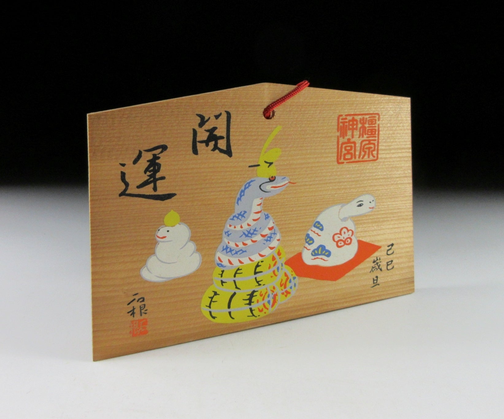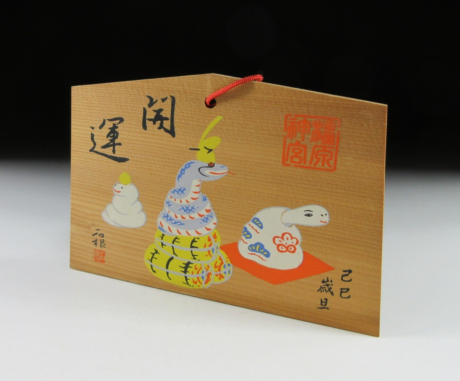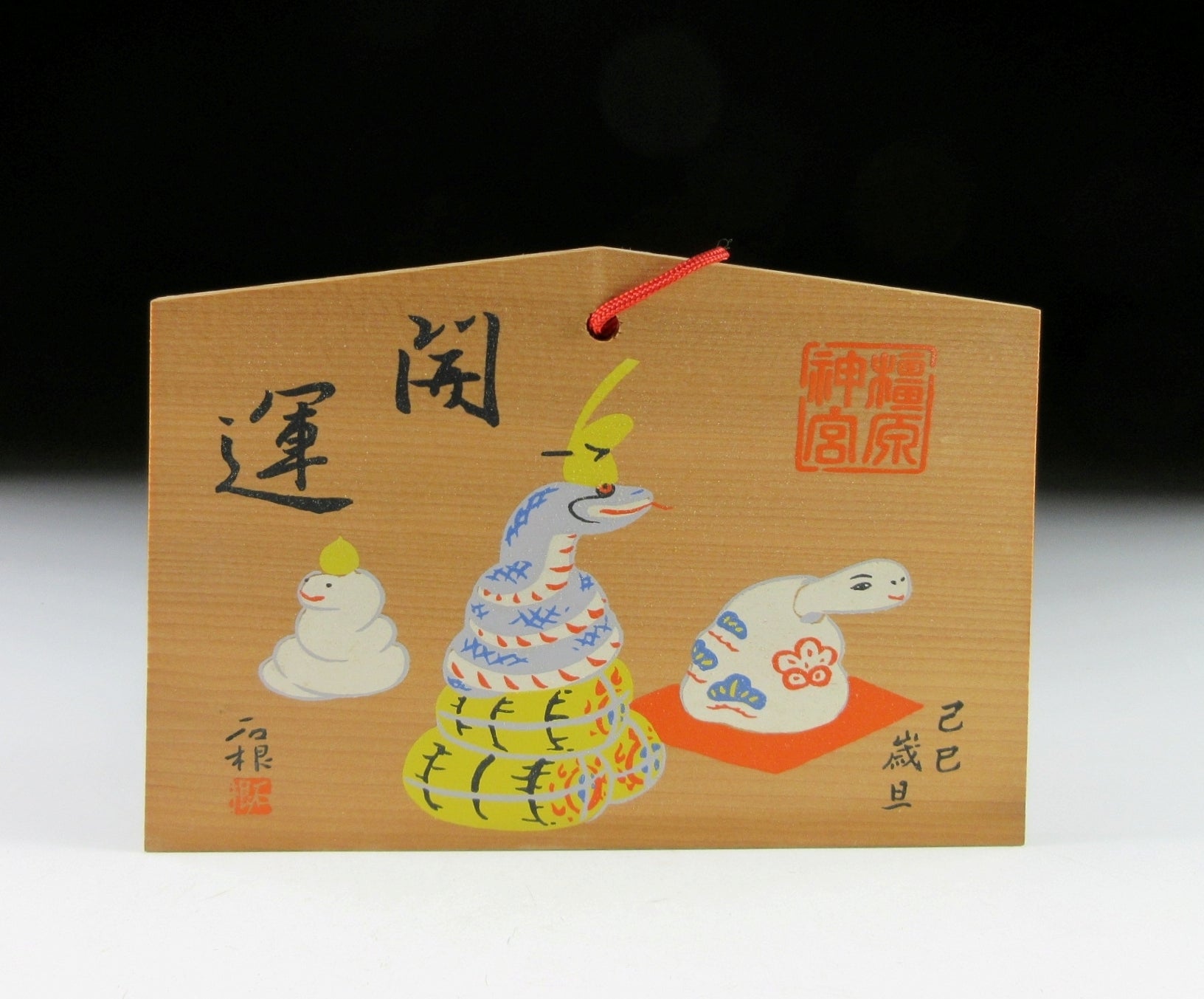 This listing is for a wooden ema from Kashihara Jingu Shrine in Nara. Kashihara Jingu was built in 1890 at the site where Emperor Jimmu was said to have acceded to the throne in the year 660. The front of the ema is decorated with three white snake ornaments, and was most likely purchased to commemorate the Year of the Snake back in 2001. This ema came in a wooden box containing 28 different ema collected over a 28-year period.