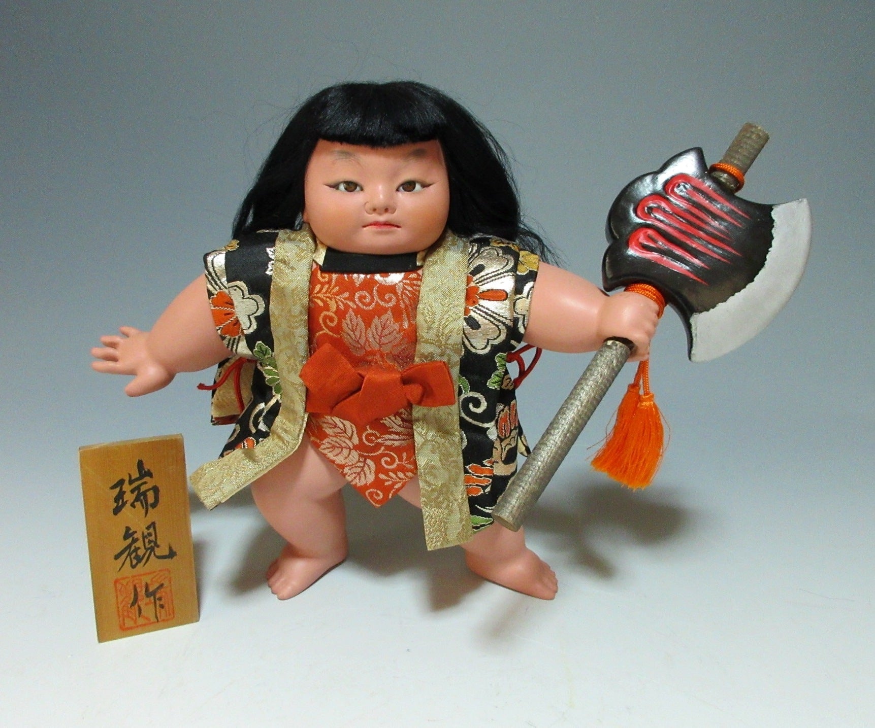 Kintaro is a folk hero from Japanese folklore. He was born with super human strength and is usually depicted as a plump boy with a ruddy complexion. His strength comes from the unnatural way that he was conceived, according to legend his mother was a mountain witch who was impregnated by a bolt of lightning hurled at her by a red dragon from Mt. Ashigara. Kintaro had a fondness for sumo wrestling and loved to wrestle bears as they were the only creature who could match his strength. Kintaro became a hero after defeating Shuten-doji, the terror of the region based at Mt Oe. It is said that he joined the powerful warrior Minamoto no Yorimitsu and served as a retainer for him in Kyoto. Kintaro is easily recognised by his hatchet and red bib with the kanji character for gold written on it. It is tradition in Japan to display a Kintaro doll during Tango-no-sekku festivities in early May in the hope that sons will grow up with courage and strength.