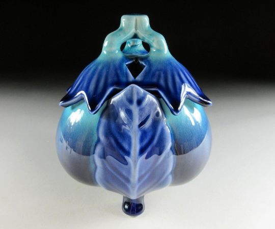 This listing is for a Kutani-ware incense burner made around 20 years ago by noted potter, Kato Akio. It is made of porcelain and moulded to resemble three eggplants supported on three legs. It is coated in two shades of blue saiyu glaze and has a white unglazed interior. The signature of the potter can be found on the bottom, and it comes with its original signed wooden storage box. It also comes with a Japanese language profile about the potter.