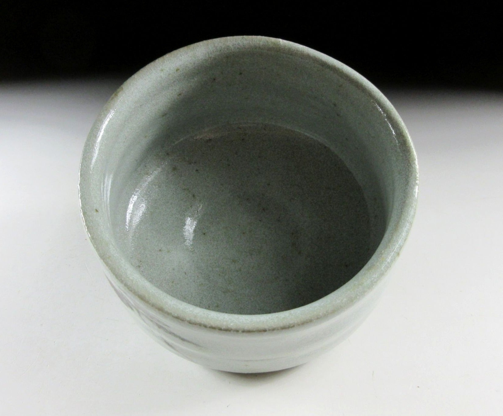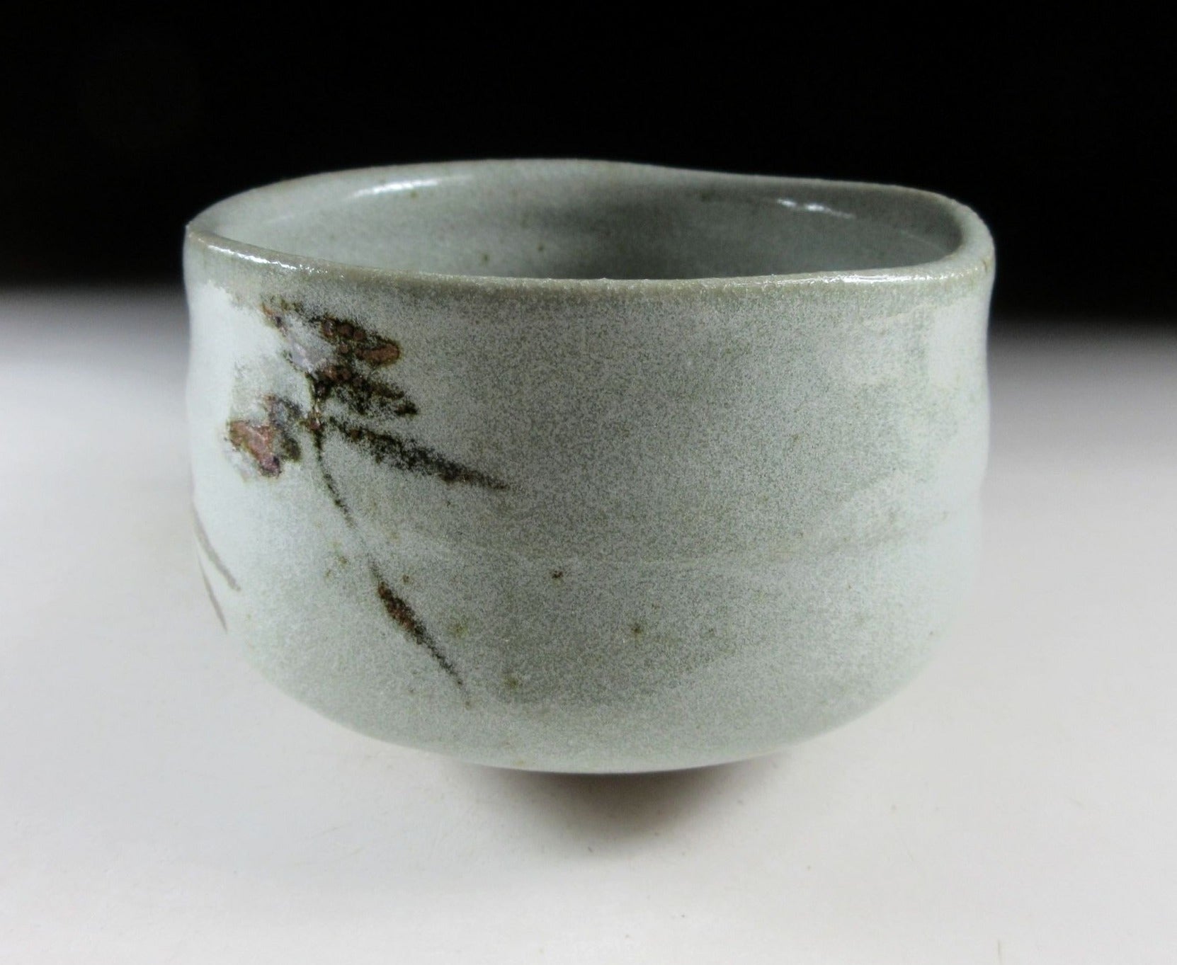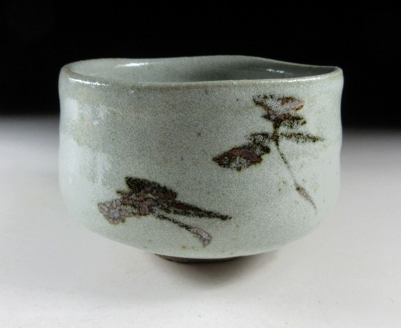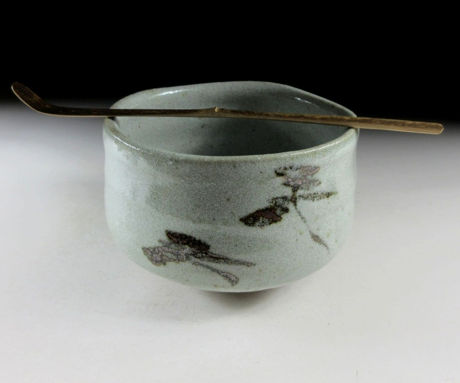 This listing is for a Mino-ware chawan made around 20-30 years ago by Kato Eichi. It is wheel-thrown and coated with thick, semi-transparent white glaze over a high-fired stoneware base. This piece has a gently undulating rim, and the front is decorated with two iron oxide matsu pine motifs. Pine is a popular motif because it is one of the three friends of winter. Matsu pine, ume and bamboo are admired in both Japan and China as they do not wither against the cold of winter. All three plants are regarded as auspicious and are believed to symbolise endurance and strength. *PLEASE NOTE THAT THE CHASHAKU TEA SCOOP IS NOT INCLUDED.