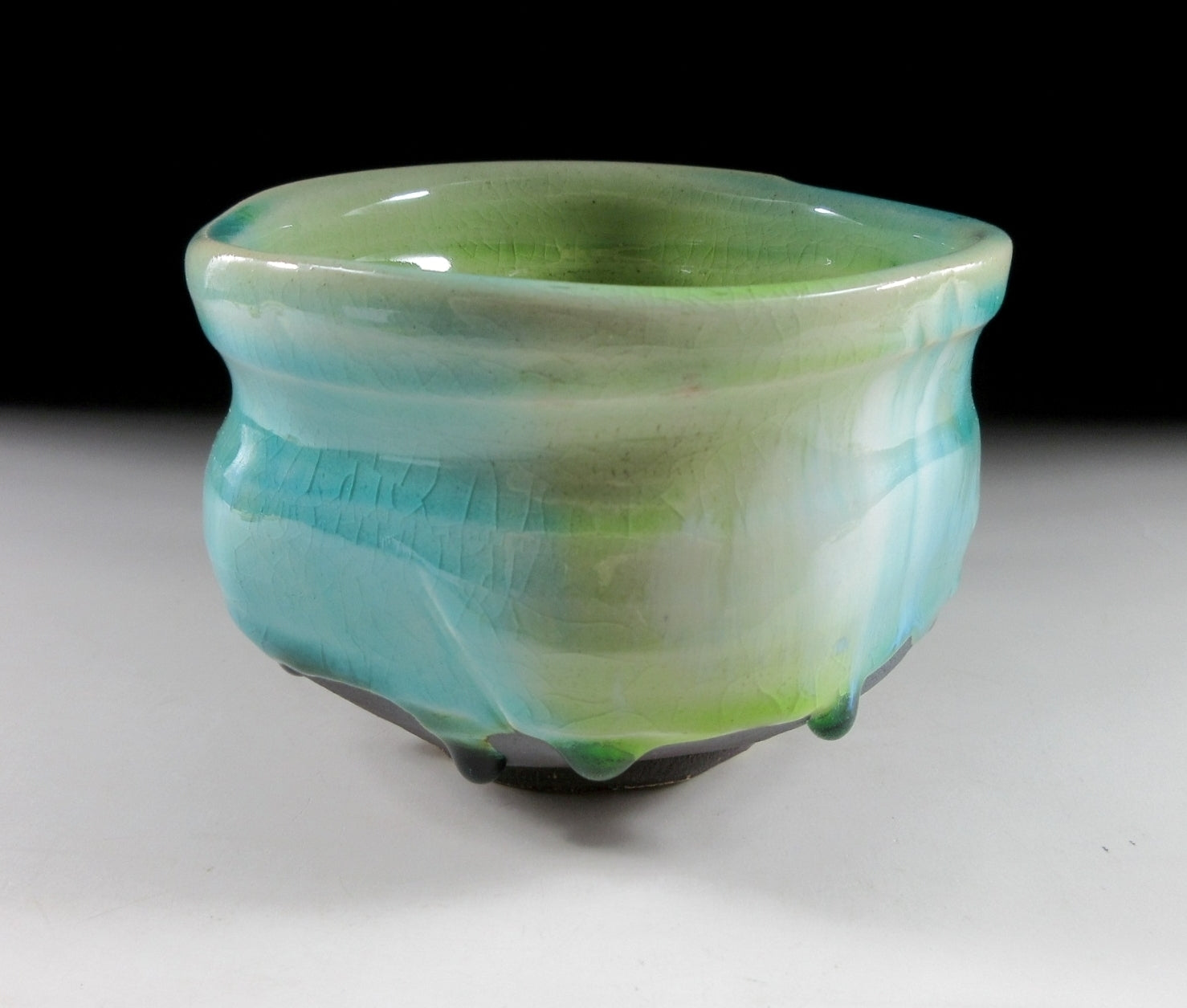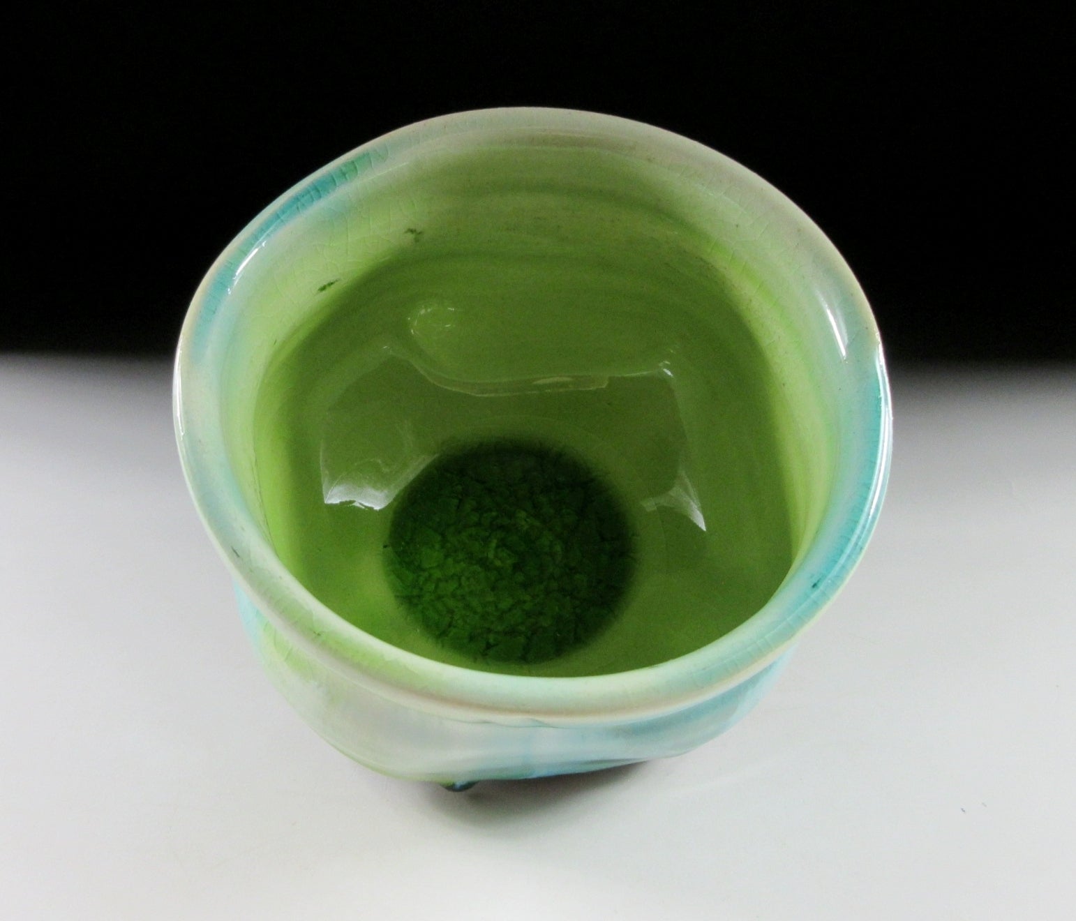 This listing is for a ‘dreamy’ Mino-ware chawan made around 20 years ago by Kato Eichi. It is a combination of wheel-throwing and shaping by hand to give it a beautiful undulating form. Both the interior and exterior are coated in shades of ocean coloured glaze, with drips forming on the layer of matte glaze gracing the lower part of the bowl. This is a lovely piece for sipping tea while listening to the gentle song of the waves. The mark of the potter (two lines) can be found on the bottom, and it comes with a paper storage box.