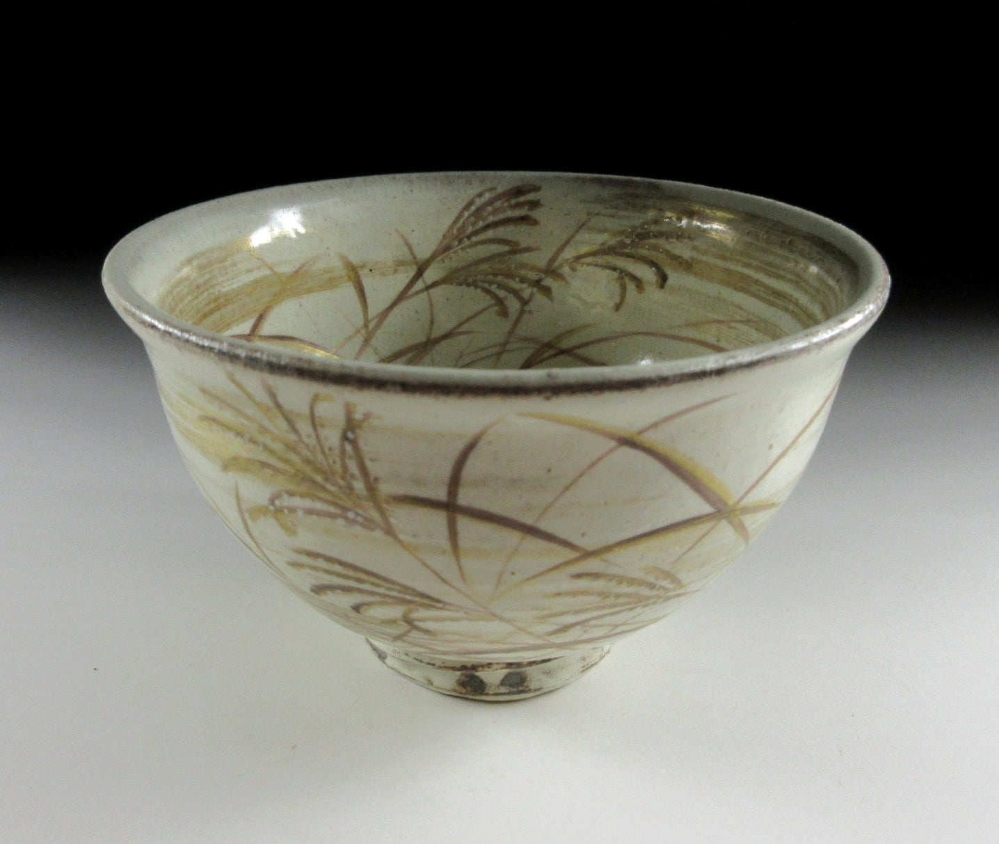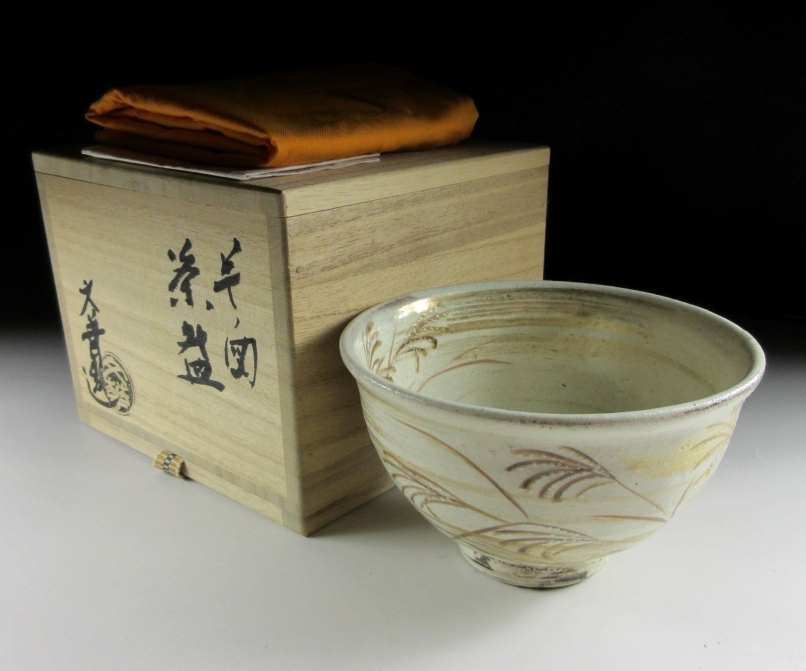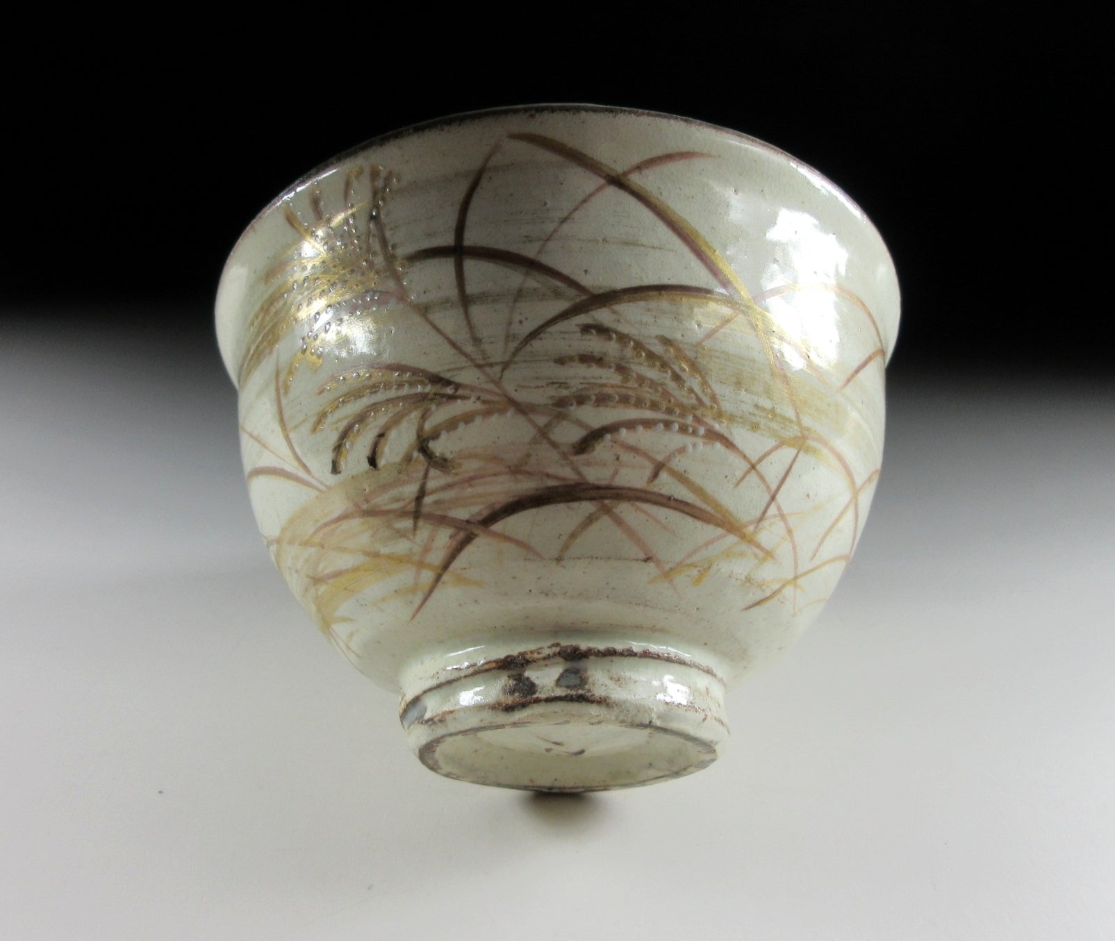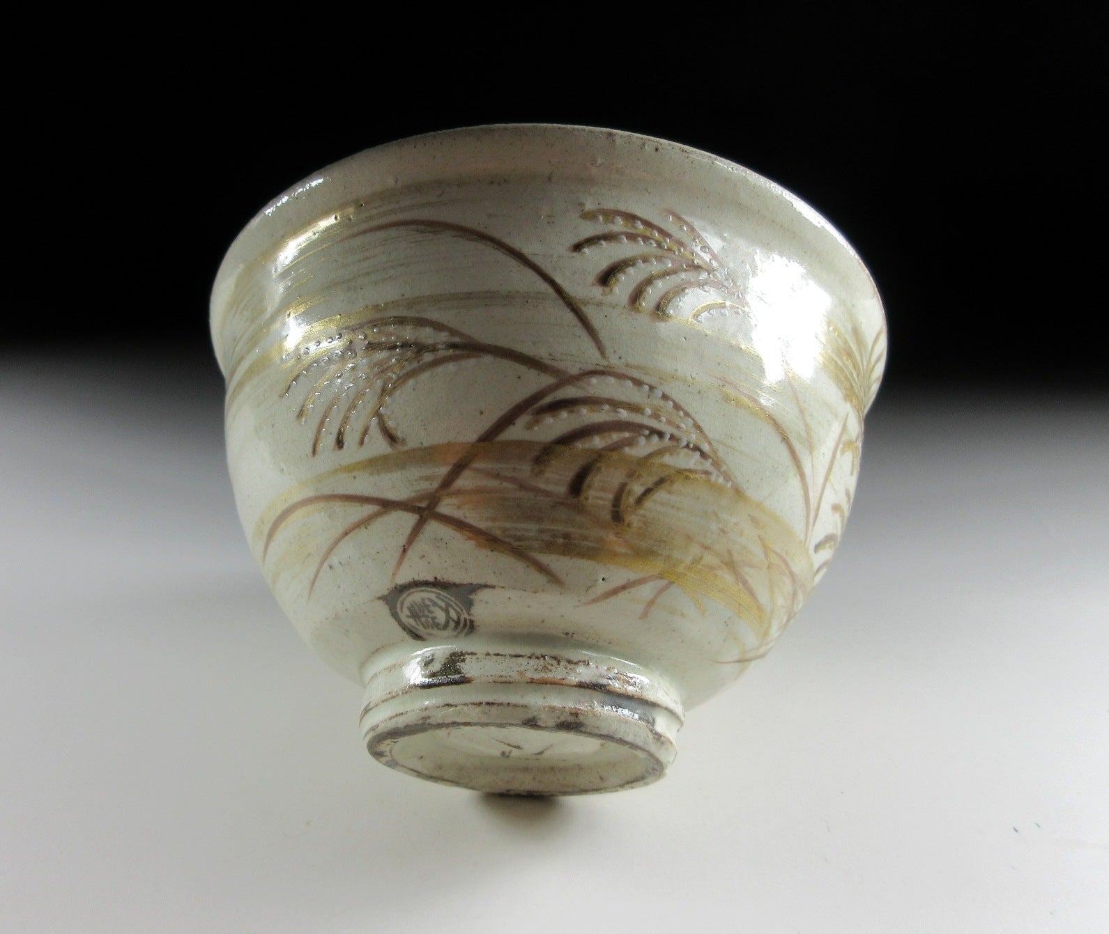 This listing is for a Kyo-ware kohiki chawan made around 20 years ago by noted potter, Kato Fumika. It is wheel-thrown and coated in light coloured slip over a stoneware base. Both the interior and exterior features gold enamel brushwork and hand-painted pampas grass gently swaying in the breeze – it’s almost poetic. The stamp of the potter can be found on the bottom, and it comes with its original signed wooden storage box. It also comes with a stamped turmeric coloured wrapping cloth for when the item is not in use, as well as a Japanese language profile paper about the potter.