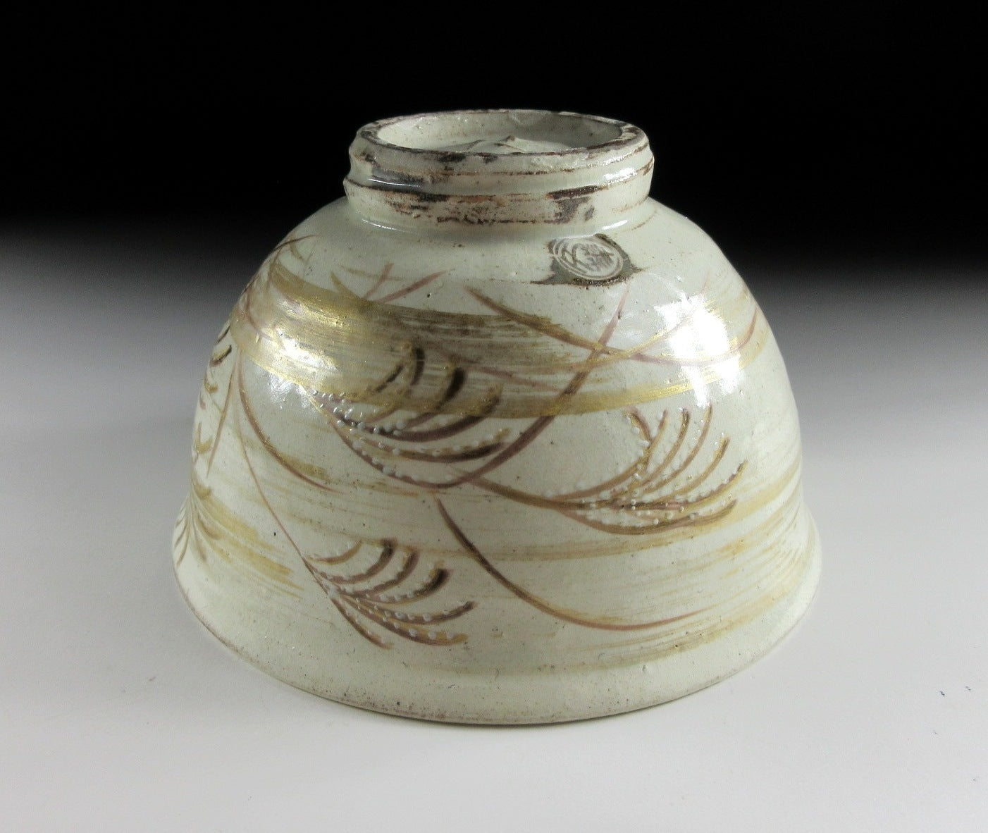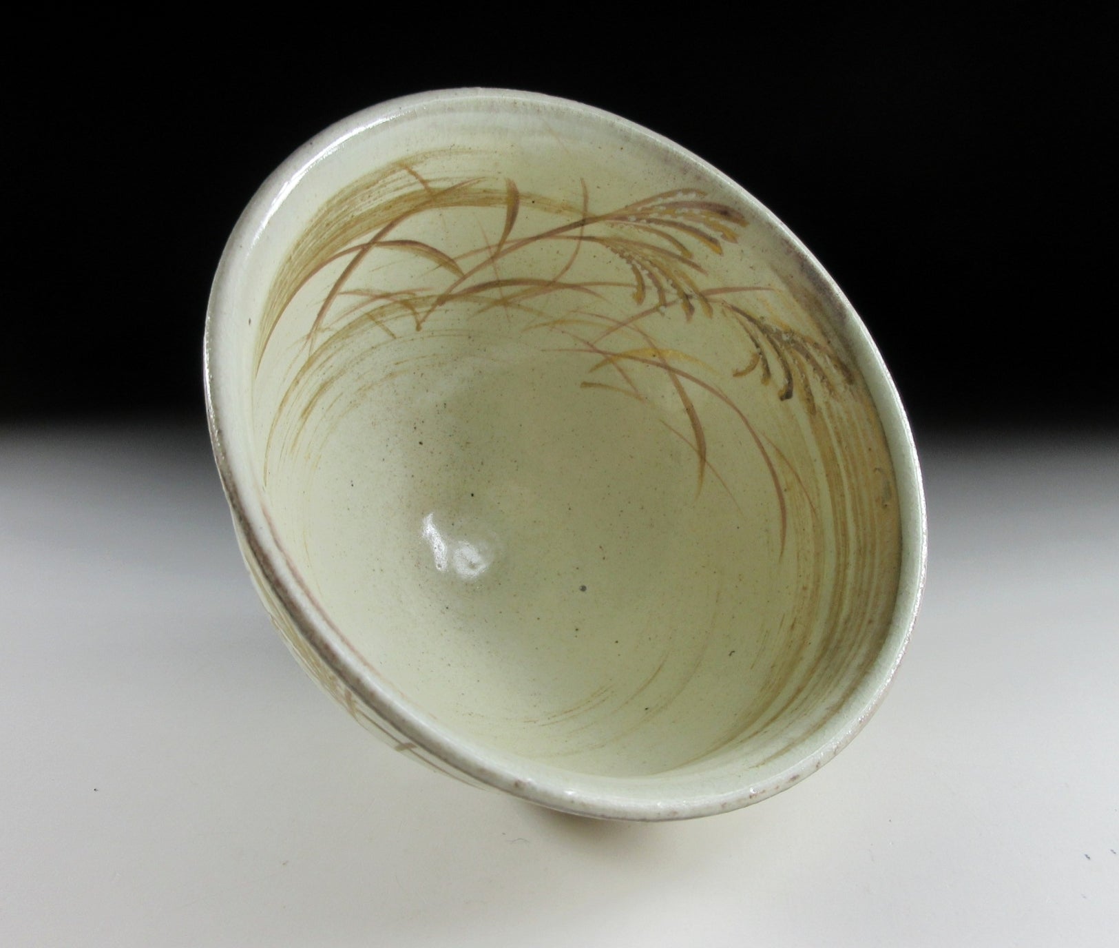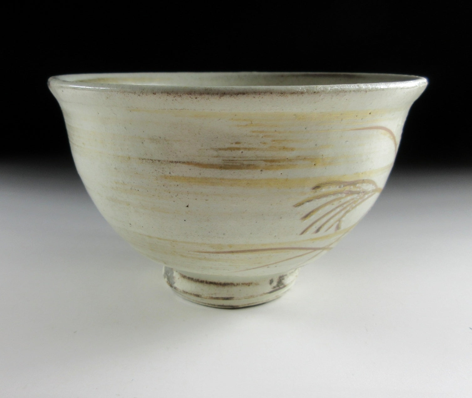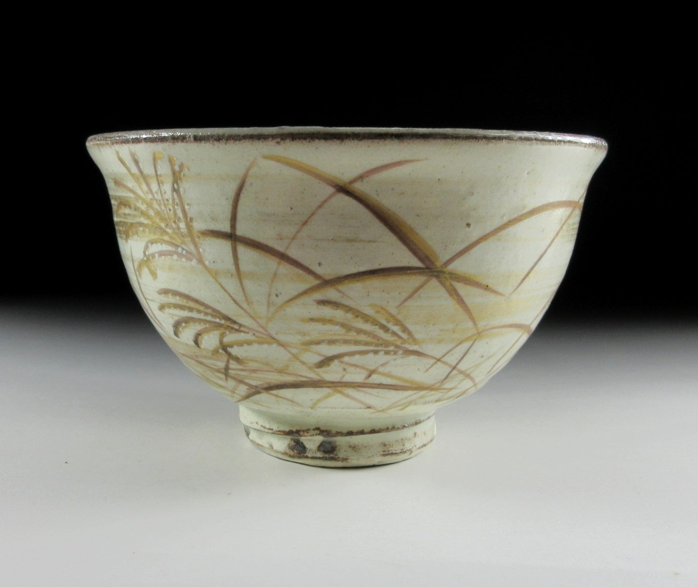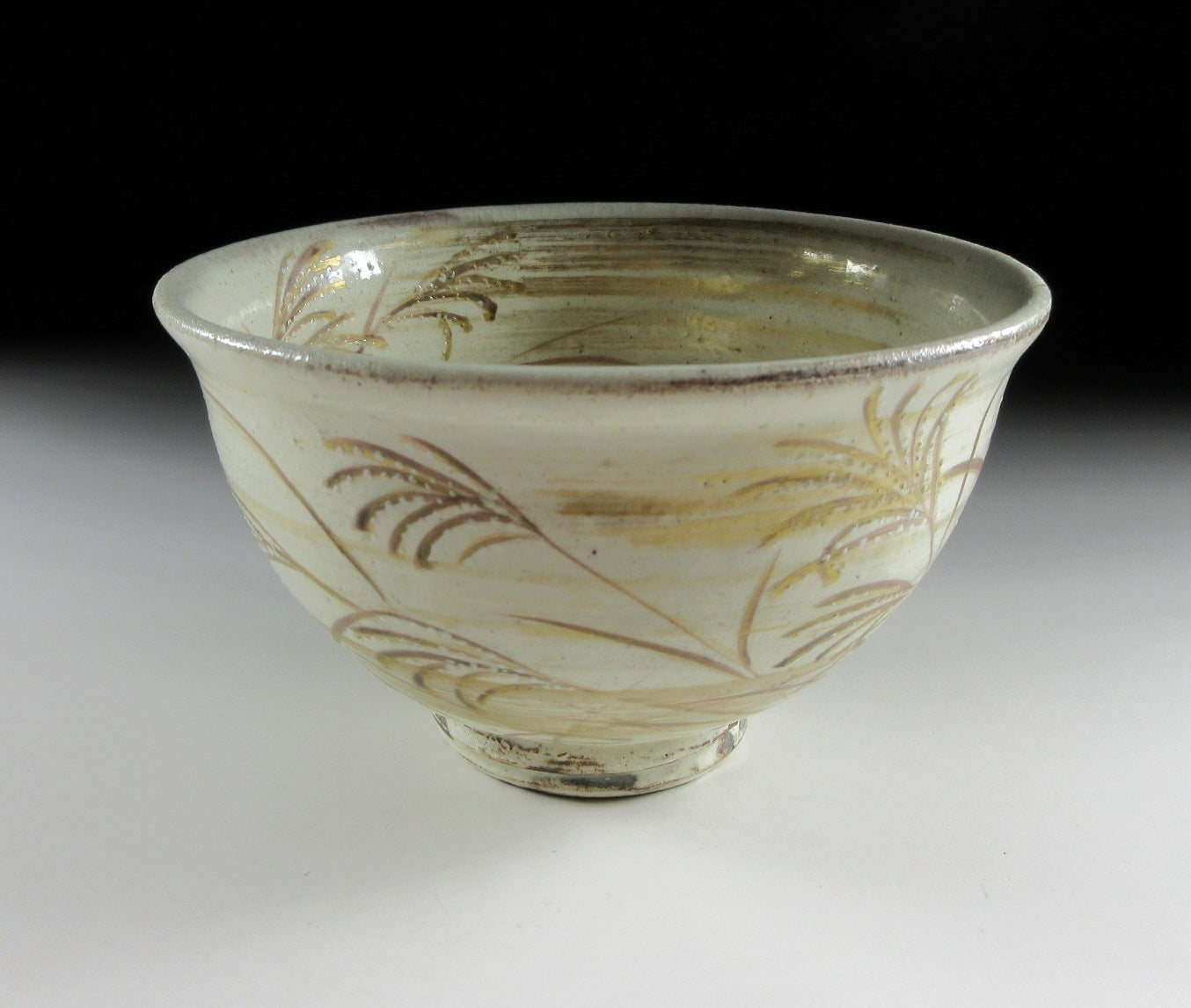 This listing is for a Kyo-ware kohiki chawan made around 20 years ago by noted potter, Kato Fumika. It is wheel-thrown and coated in light coloured slip over a stoneware base. Both the interior and exterior features gold enamel brushwork and hand-painted pampas grass gently swaying in the breeze – it’s almost poetic. The stamp of the potter can be found on the bottom, and it comes with its original signed wooden storage box. It also comes with a stamped turmeric coloured wrapping cloth for when the item is not in use, as well as a Japanese language profile paper about the potter.