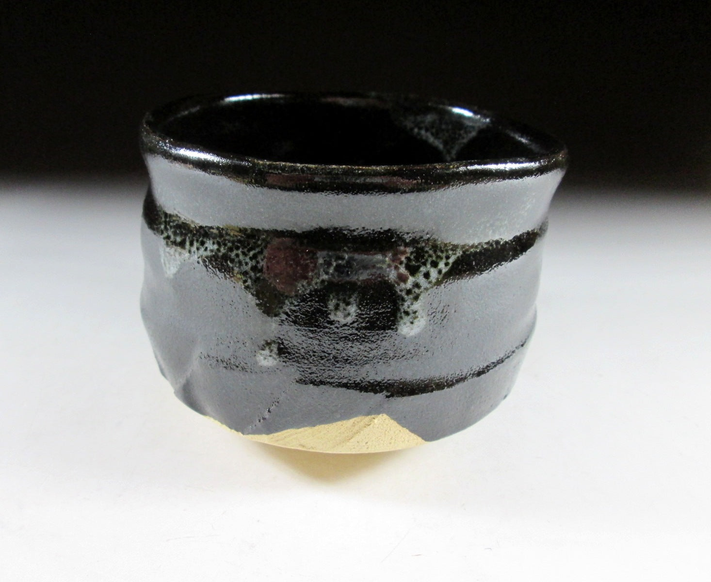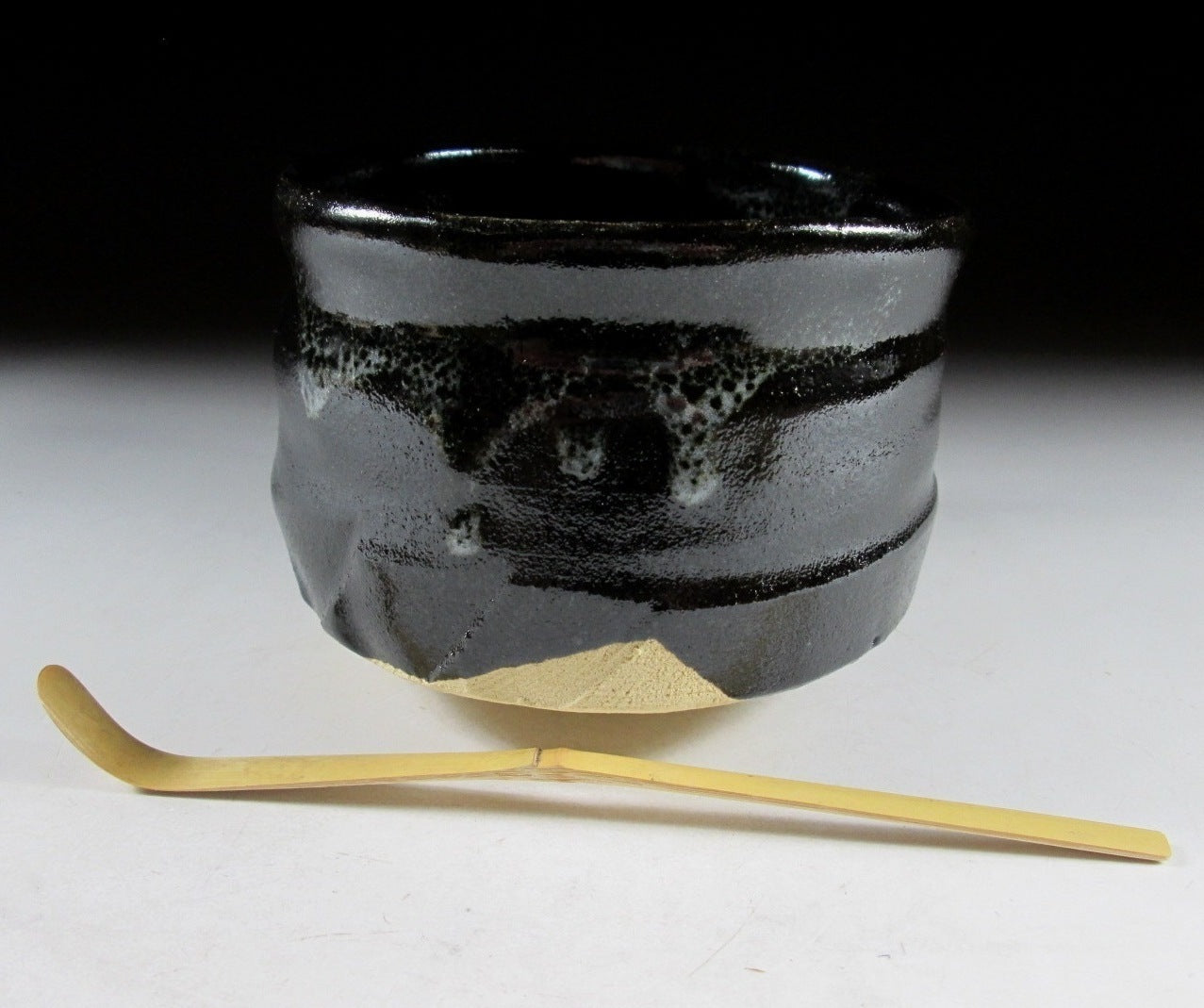 This listing is for a Mino-ware chawan made around 20-30 years ago by Kato Kanho from Kikyo Gama. It is wheel-thrown and rather robust in form and appearance. It is coated in thick black glaze with traces of white on the front. This is quite a masculine piece with nice thick walls. The signature of the potter can be found on the bottom, and it comes with its original signed wooden storage box. It also comes with a stamped yellow wrapping cloth for when the item is not in use. *PLEASE NOTE THAT THE CHASHAKU TEA SCOOP IS NOT INCLUDED.