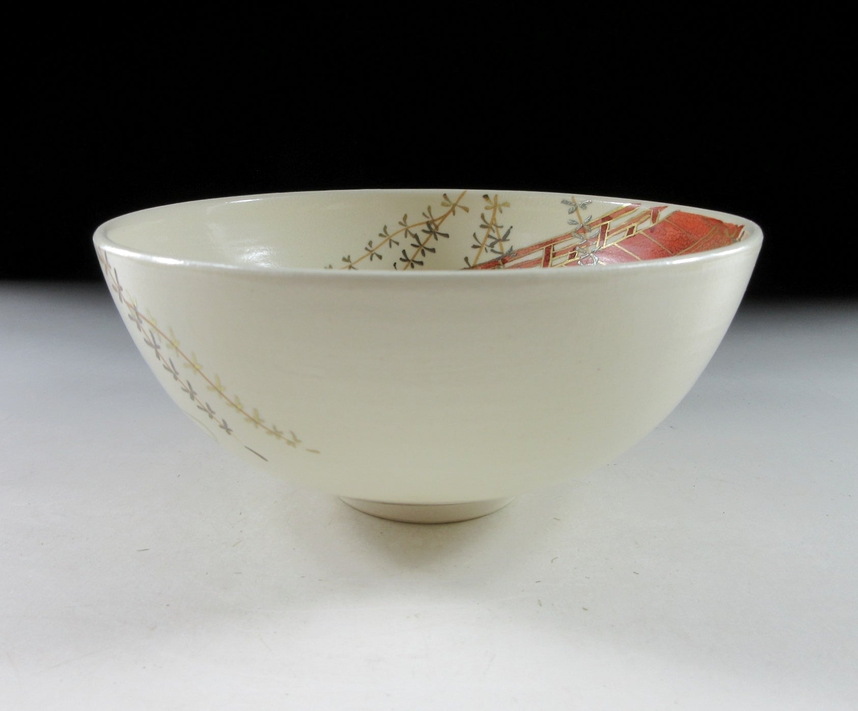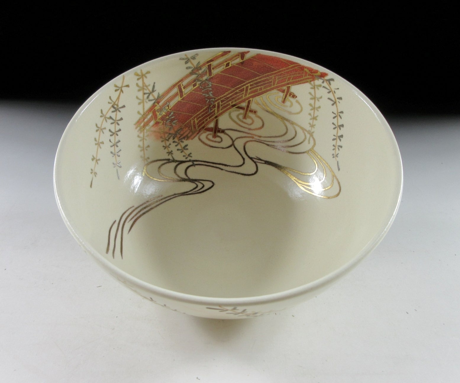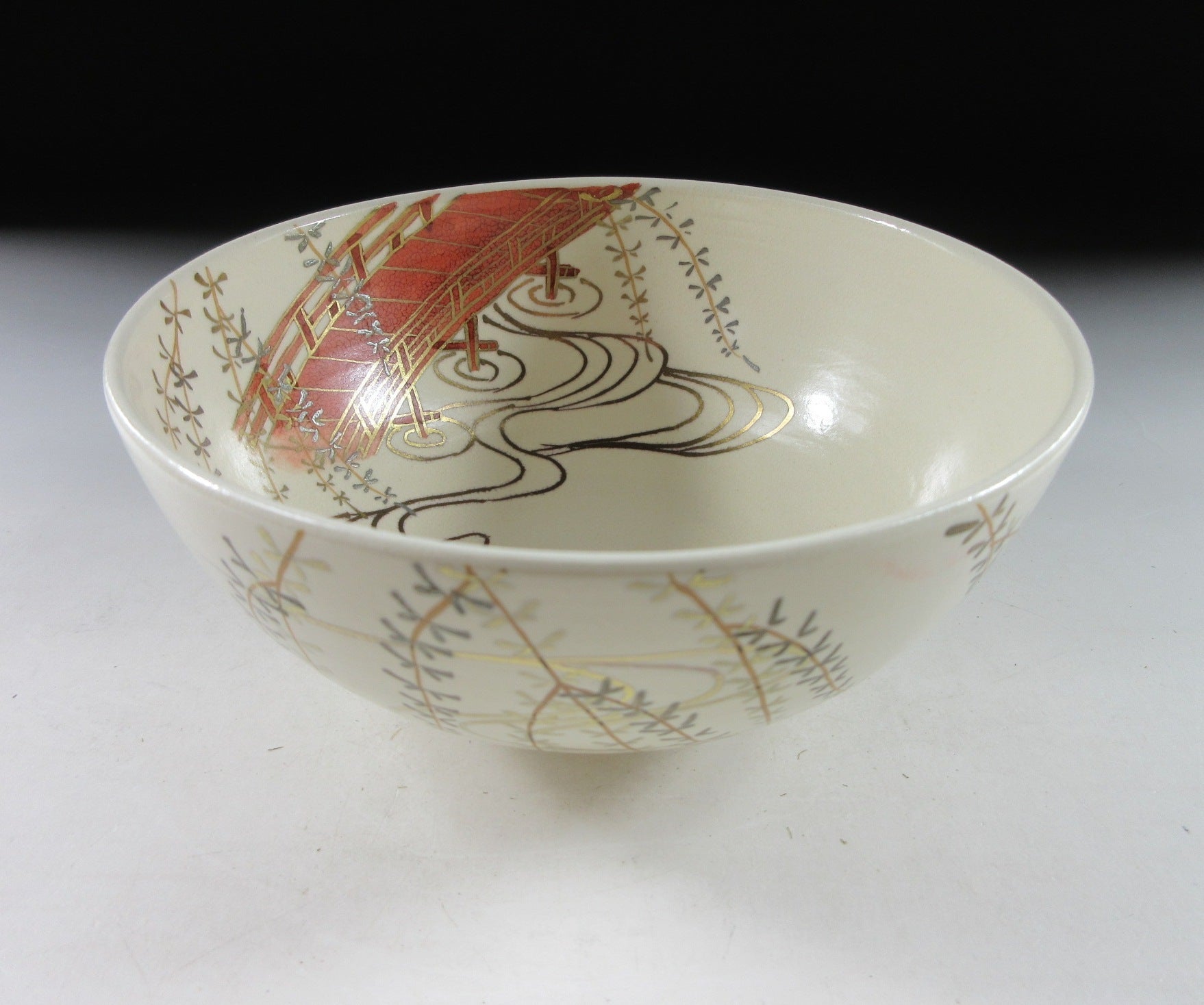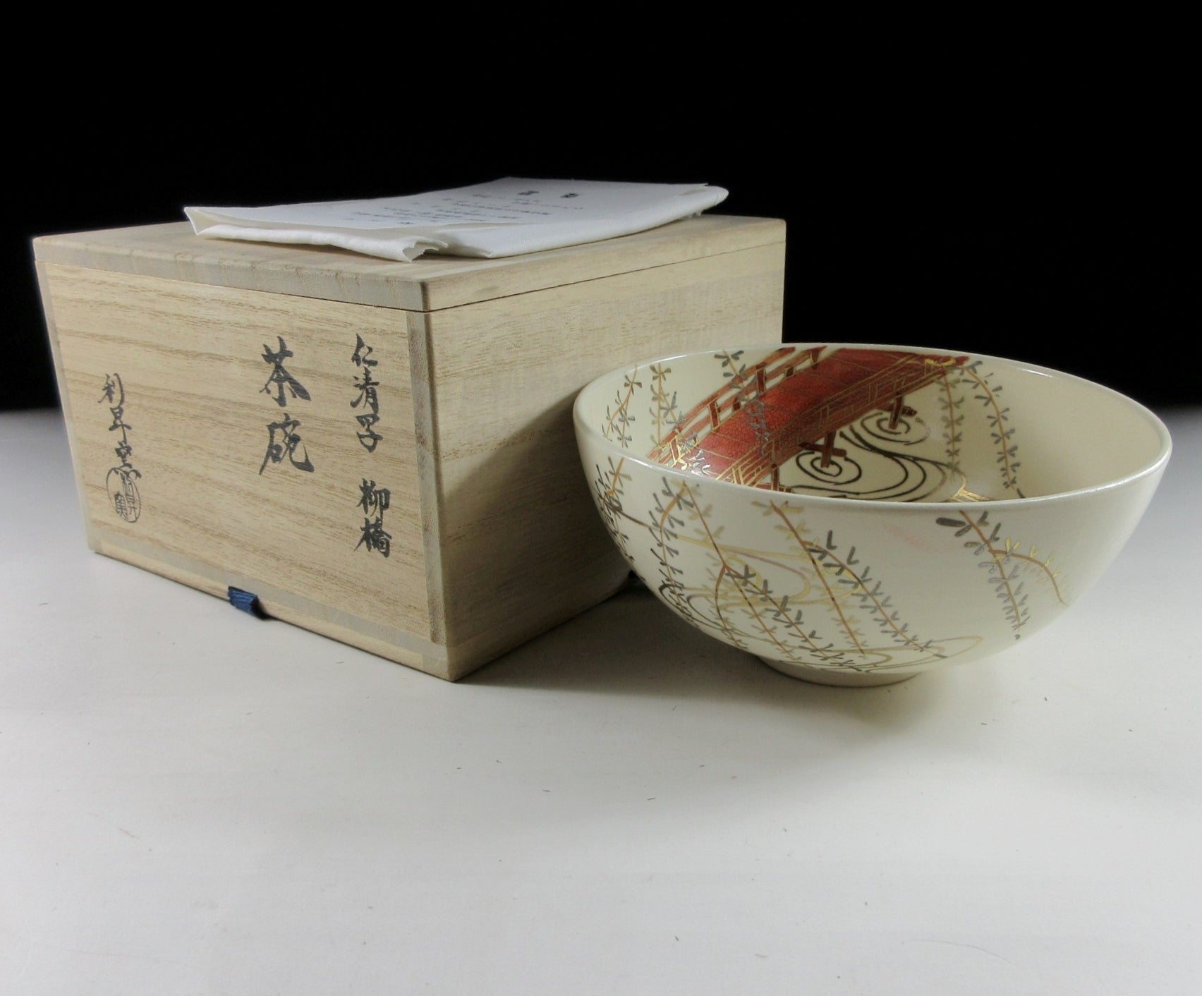 This listing is for a beautiful Kyo-ware chawan made around 20 years ago by noted potter, Kato Risho III. It is wheel-thrown and the flat hira type used during the summer season. Hira chawan are shallow bowls with low sides designed to cool tea down faster. The bowl in this listing is a replica of Ninsei’s ‘yanagi bashi’ chawan depicting a red bridge and weeping willow. The willow appears to be gently swaying in the breeze, and there are soft ripples on the water below. This piece is lightweight, and both the chawan and cloth appear completely unused. The stamp of the potter can be found on the bottom, and it comes with its original signed wooden storage box. It also comes with a white wrapping cloth for when the item is not in use, as well as a Japanese language profile paper about the potter.