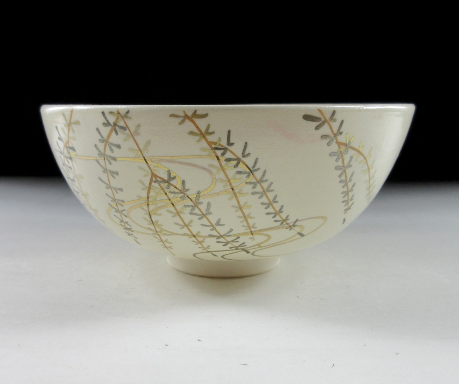 Kato Risho III (b.1946) is a Kyo-ware potter and third generation master of Risho Gama. Both the first and second generation potters originally made a living by producing hand-painted tableware, however the third generation decided to become a tea ceremony potter. He became independent after working as a painter for master potter Eiraku Sokuzen (1935-1998), and succeeded as head of the family kiln in 1979. In 1985 he received the Kyoto Traditional Art Merit Award, and in 1989 he held a solo exhibition at Kyoto Takashimaya. In 2003 he held a solo exhibition at Kyoto Daimaru, and he has also worked on many calligraphy works for the Senke family. Risho is best known for his utsushi Ninsei pieces, and his work has received praise from the Senke school of tea. His teaware is fired many times, and when applying gold or silver, the gold-painted areas are repeatedly polished with agate. Since it is all done by hand, it takes a very long time. **Fellow sellers, this information was researched by Kominka Zakka and CANNOT be used in your own listings.