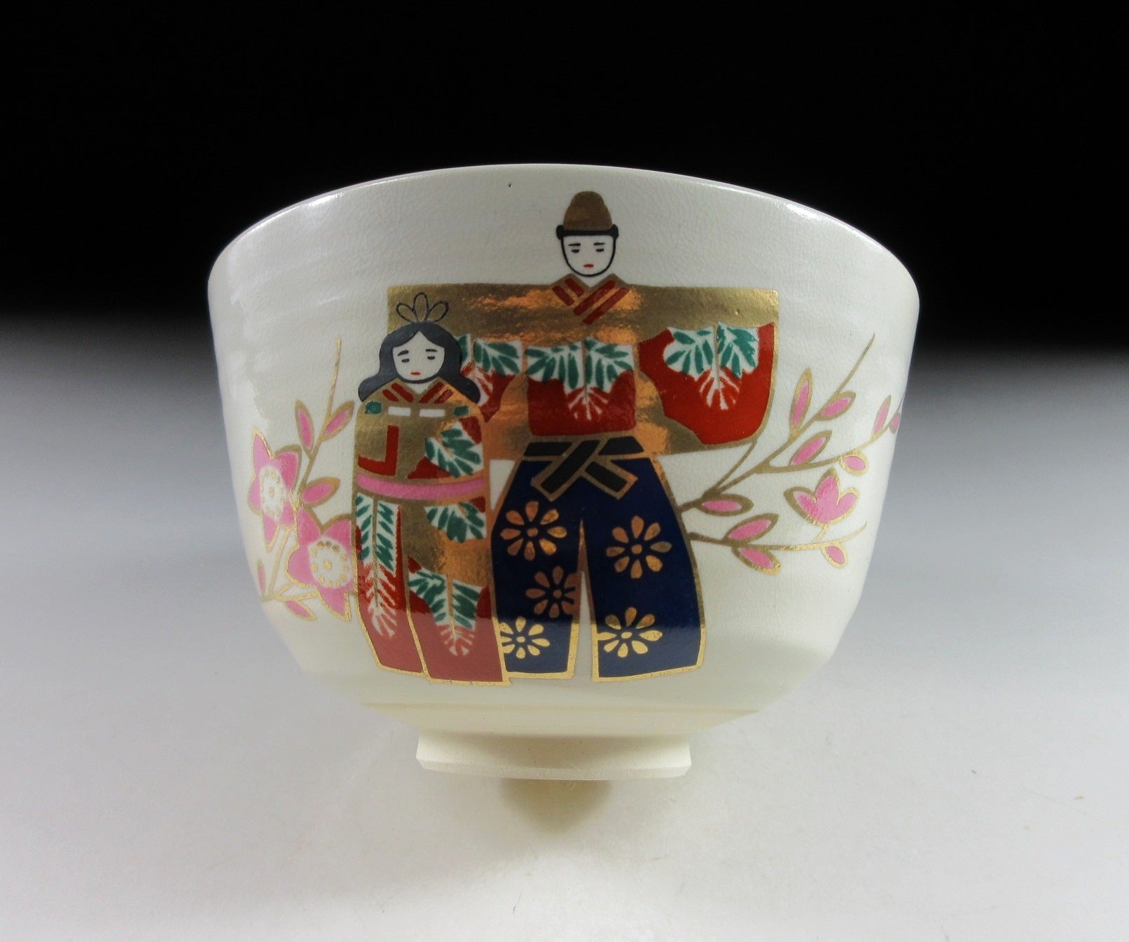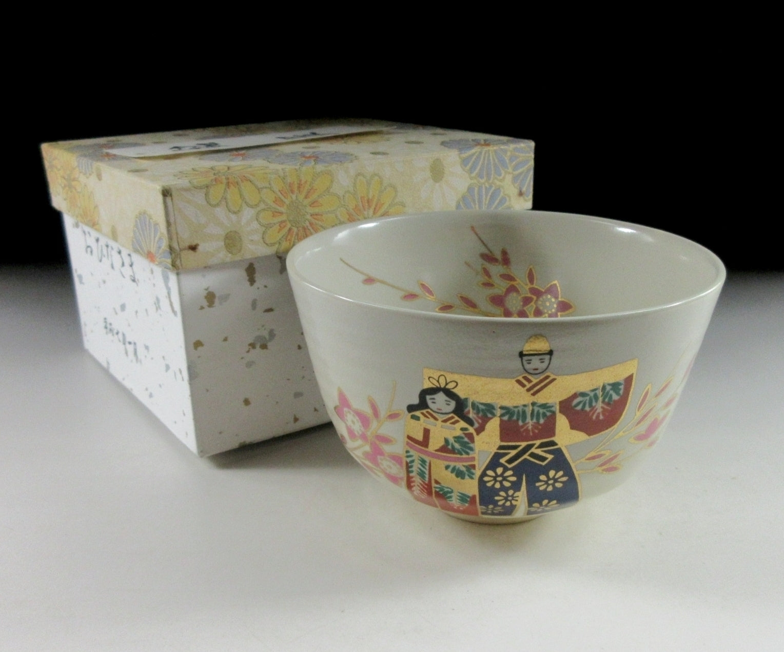 This listing is for a Mino-ware chawan made around 30 years ago by Kato Shouzan. It is wheel-thrown and the front is decorated with a lovely hina matsuri design. Hina matsuri refers to a March 3rd celebration where people pray for the health and happiness of their girls. Families display dolls and eat food such as hina arare. The bowl in this listing is decorated with an emperor and empress doll and peach blossoms. The stamp of the potter can be found on the bottom, and it comes with its original paper storage box dated January Heisei 7 (1995).