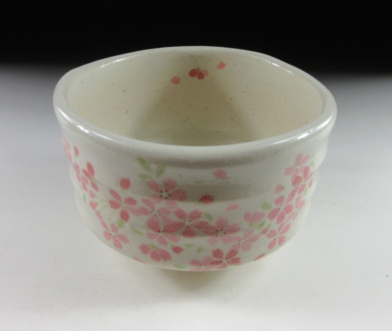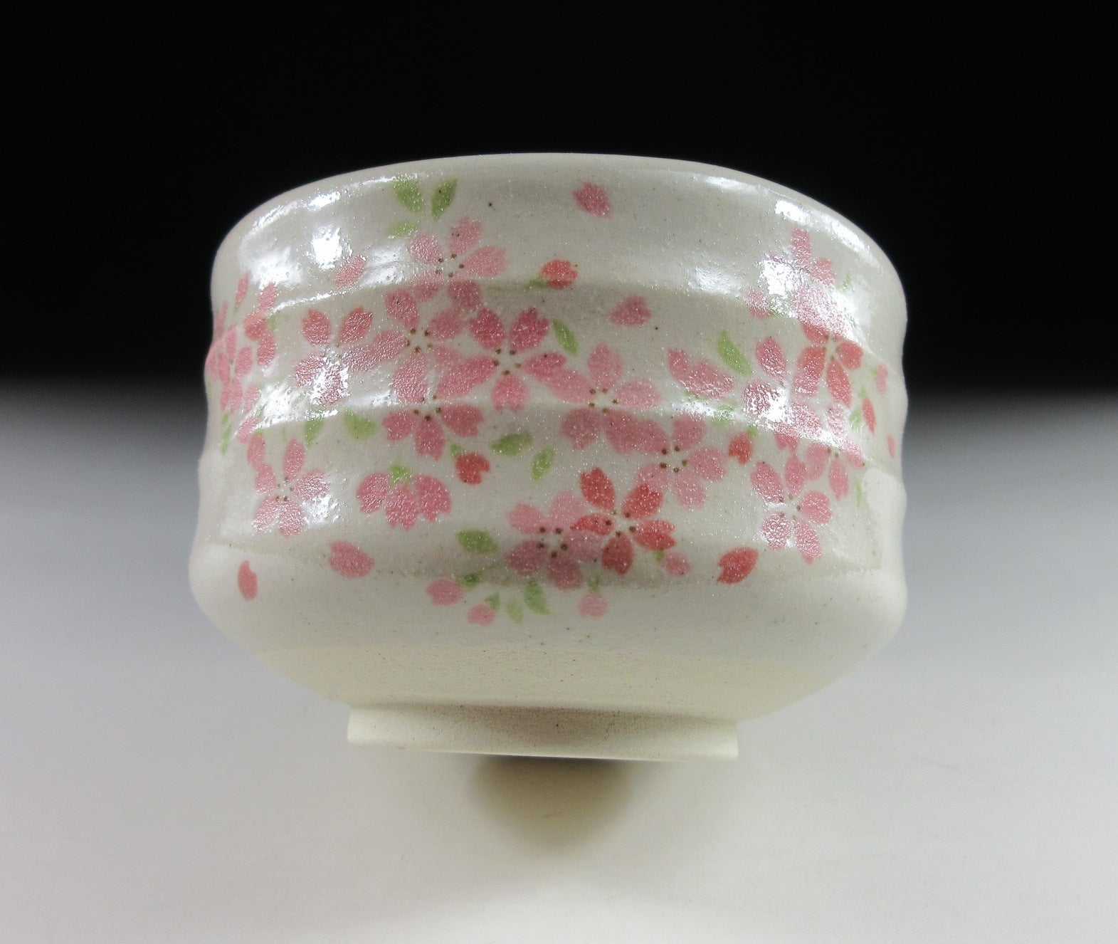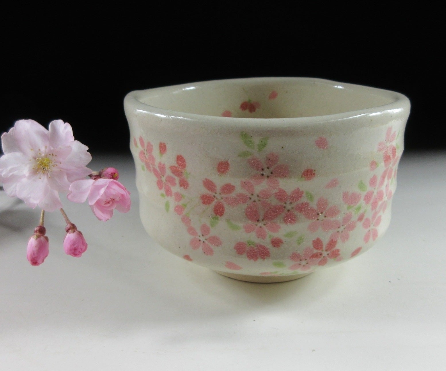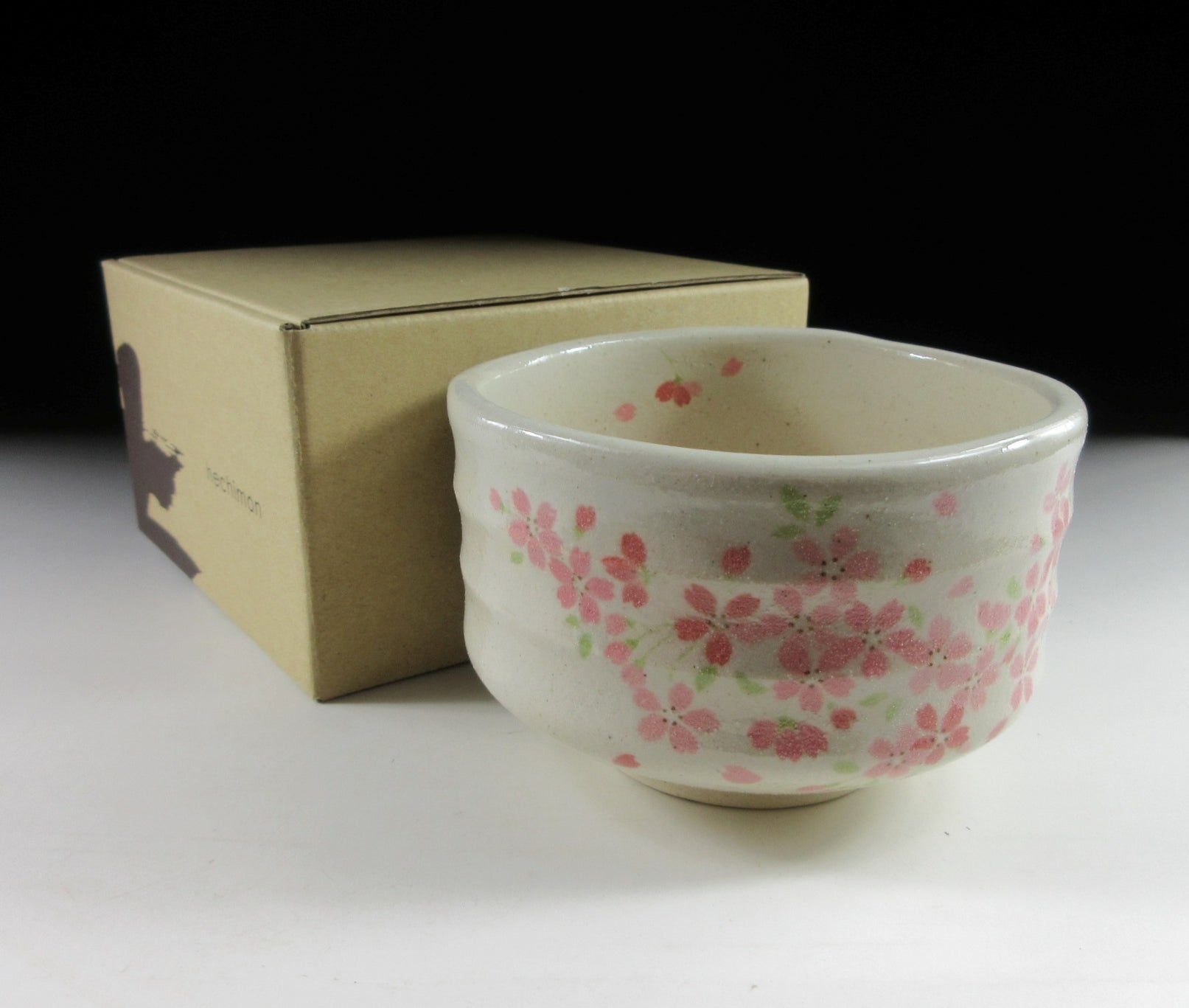 This listing is for a Mino-ware chawan made around 20 years ago by Kato Shozan. It is wheel-thrown and the front is decorated with dainty cherry blossoms over a clear glazed background. A single sakura can be found on the interior of the bowl, and this piece has a gently undulating rim. The signature of the potter can be found on the bottom of the bowl, and it comes with its original paper storage box. *PLEASE NOTE THAT THE CHASEN TEA WHISK IS NOT INCLUDED.