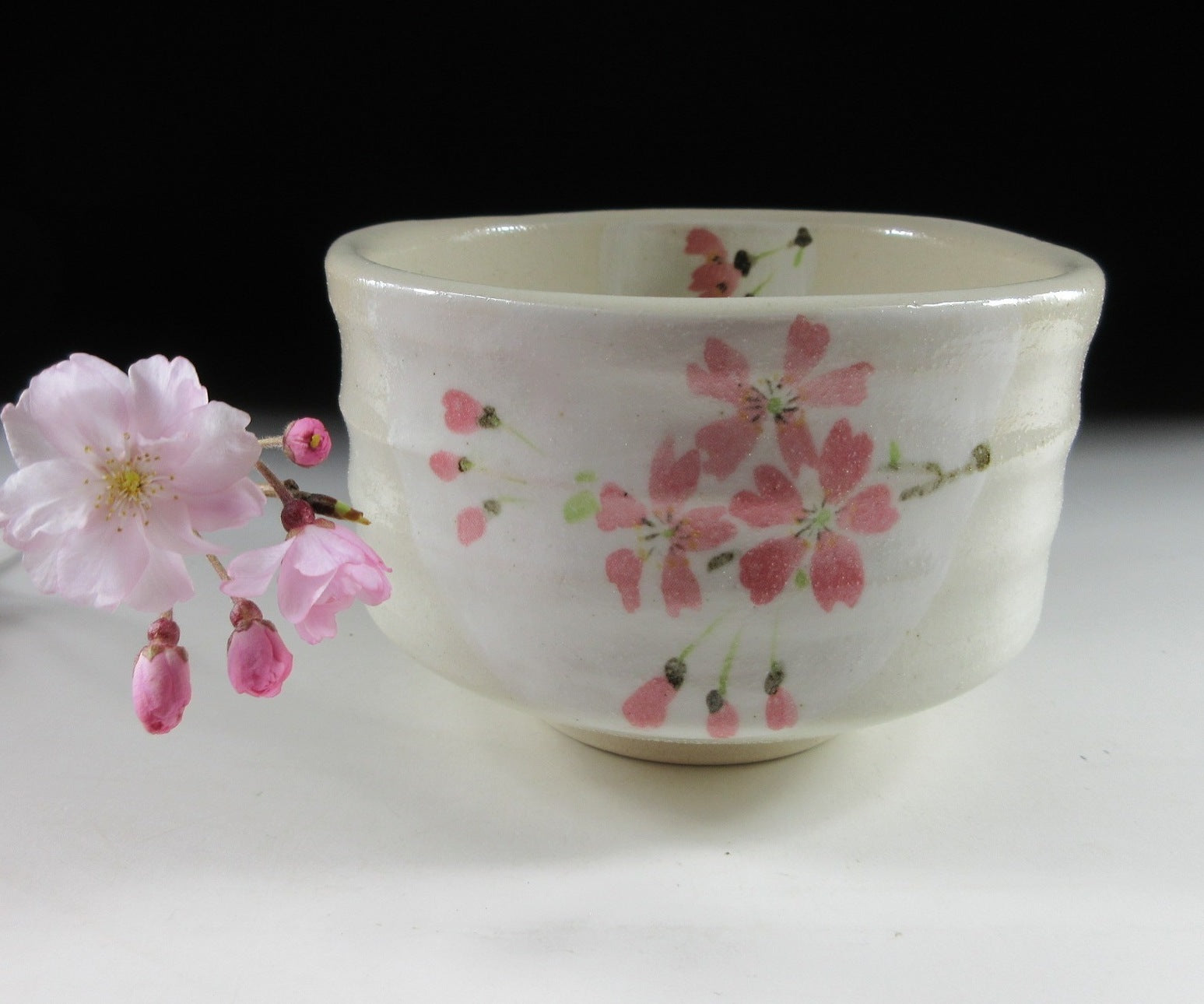 This listing is for a Mino-ware chawan made around 20 years ago by Kato Shozan. It is wheel-thrown and the front is decorated with dainty cherry blossoms over a panel of white glaze. Smaller blossoms can be found on the interior of the bowl, and this piece has a slightly undulating rim. This bowl is called ‘sakura hangetsu’, which means cherry blossoms with half moon. The signature of the potter can be found on the bottom of the bowl, and it comes with its original paper storage box. *PLEASE NOTE THAT THE CHASEN TEA WHISK IS NOT INCLUDED.