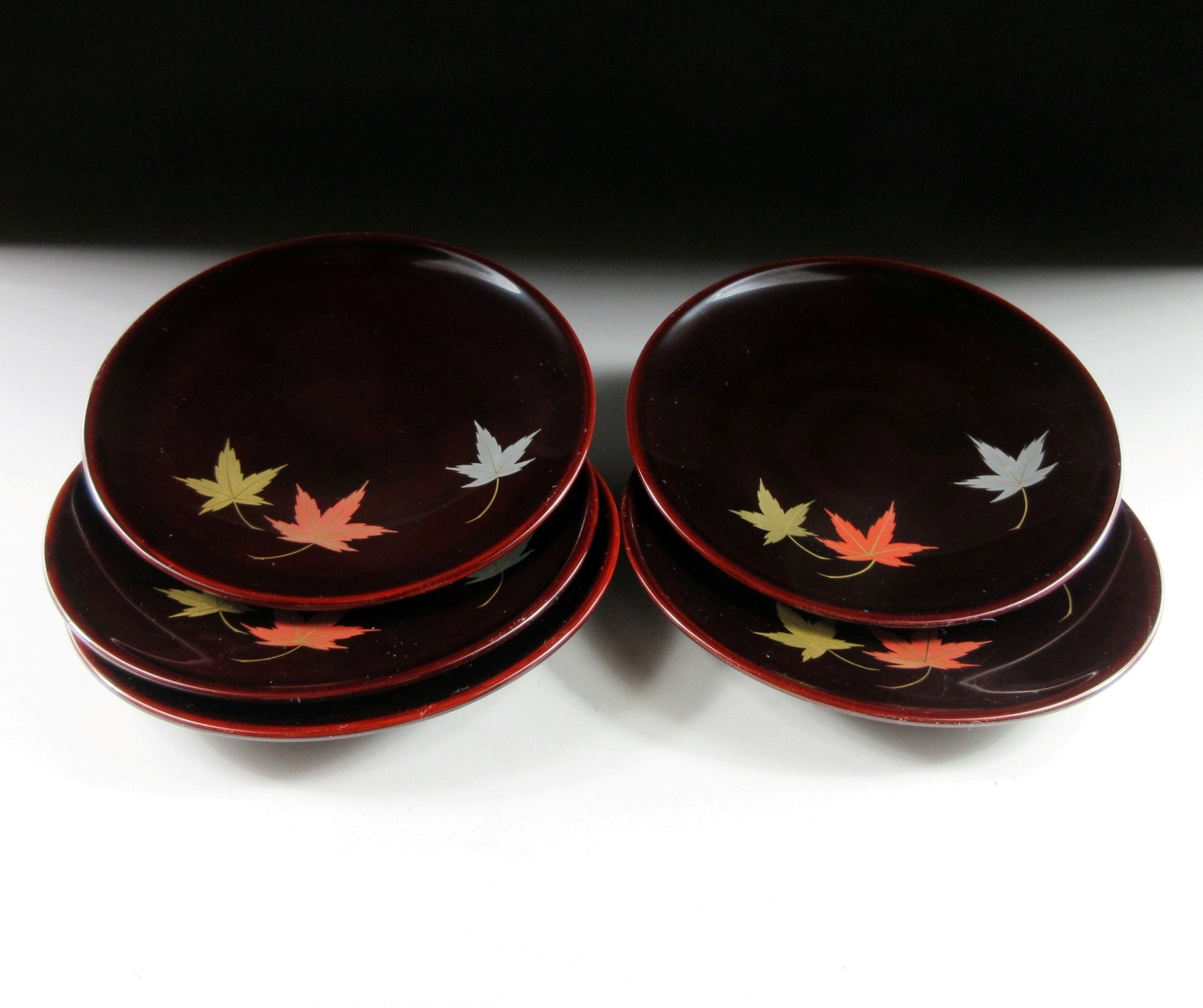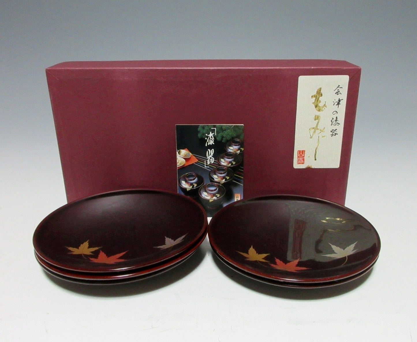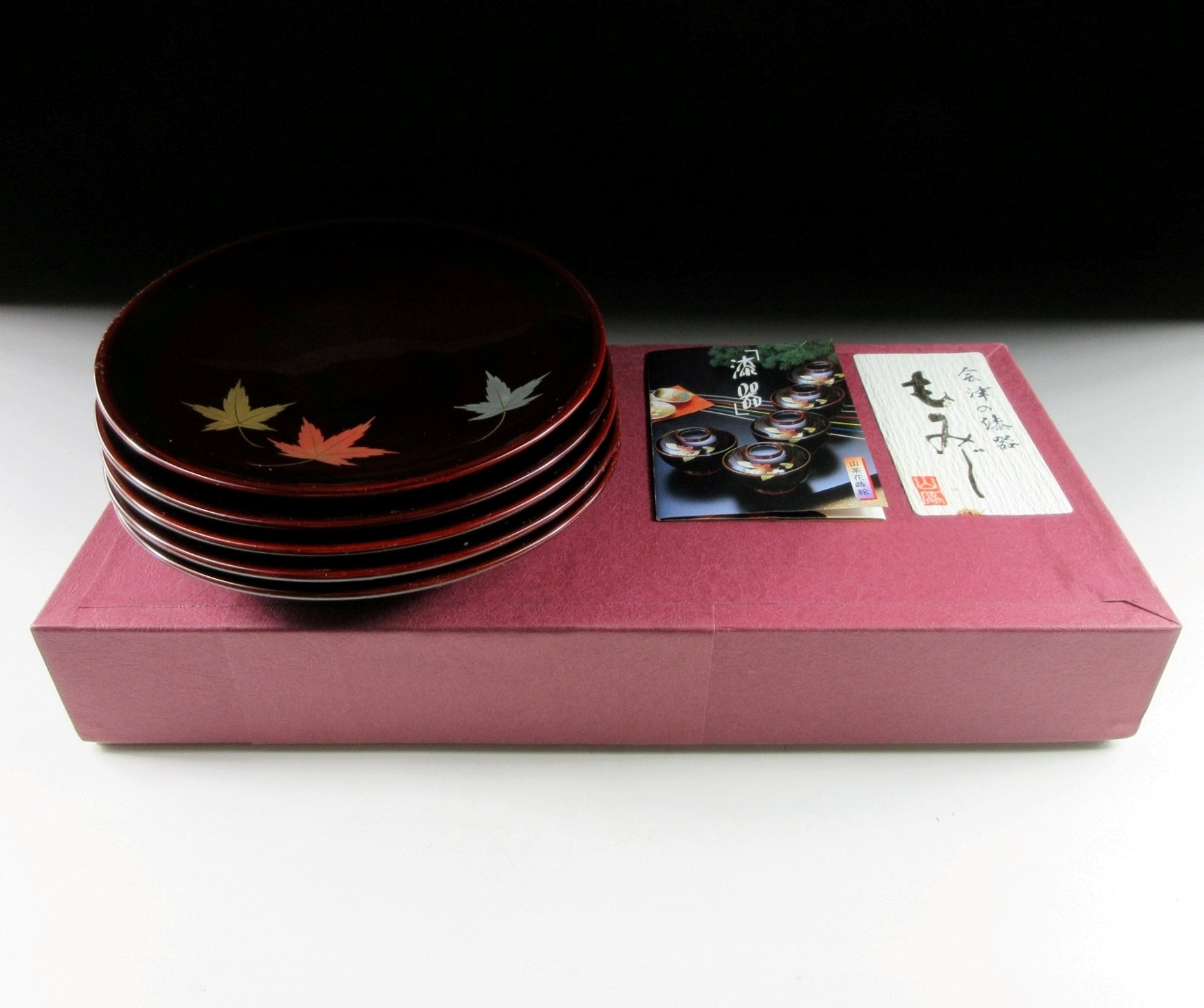 This listing is for a set of five small Aizu-nuri lacquerware plates made around 40 years ago by Kato Takeo. They are made of wood and each plate is decorated with makie momiji leaves over a brown lacquered base. This is a beautiful set of plates for serving sweets, and they come with their original paper storage box. They also come with a Japanese language profile paper.