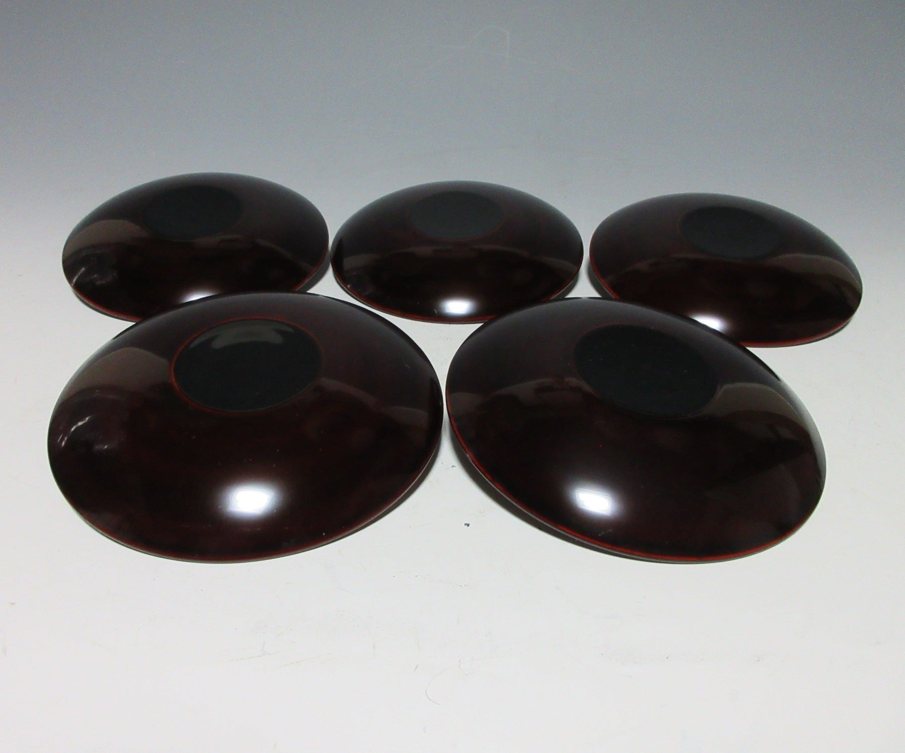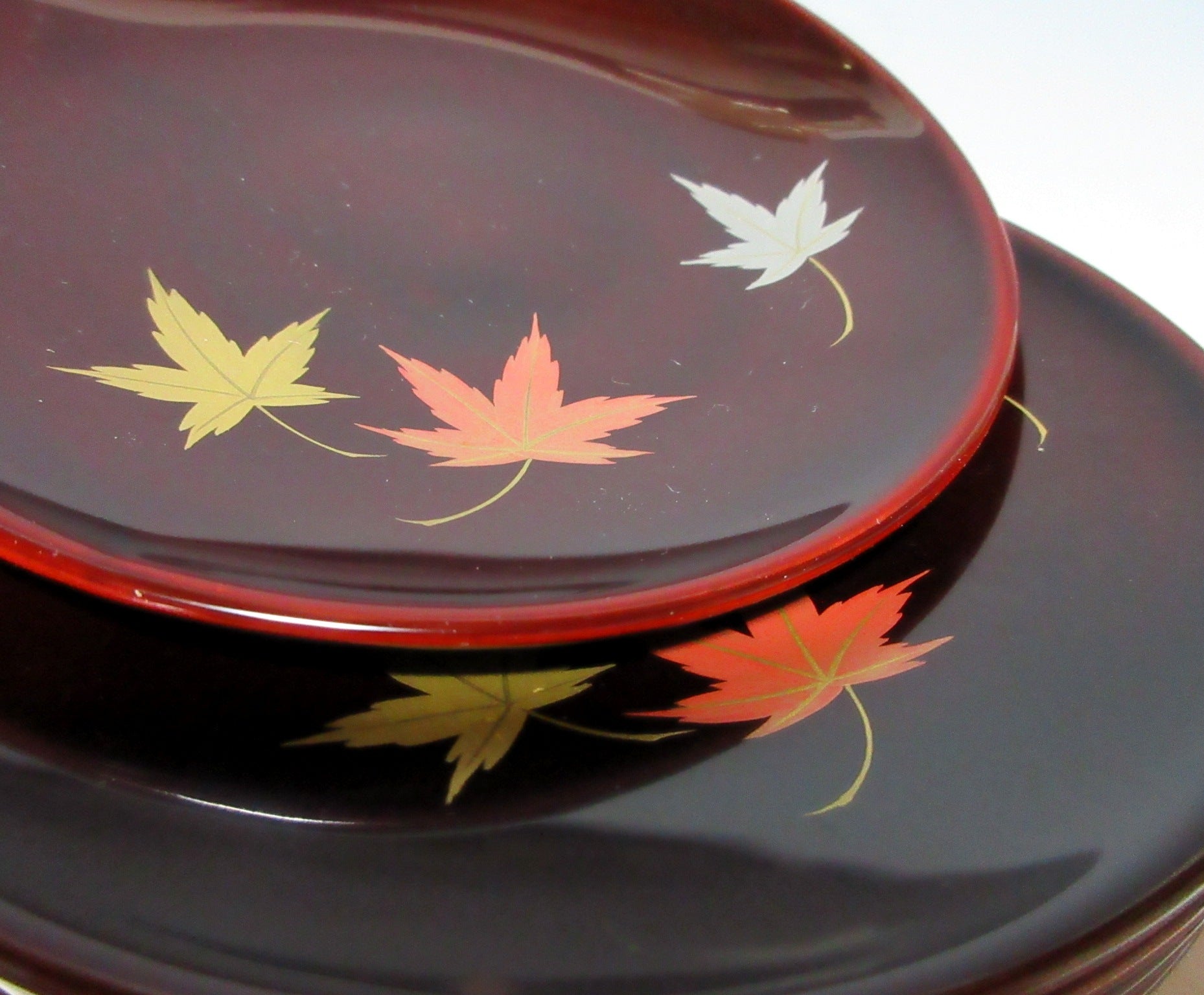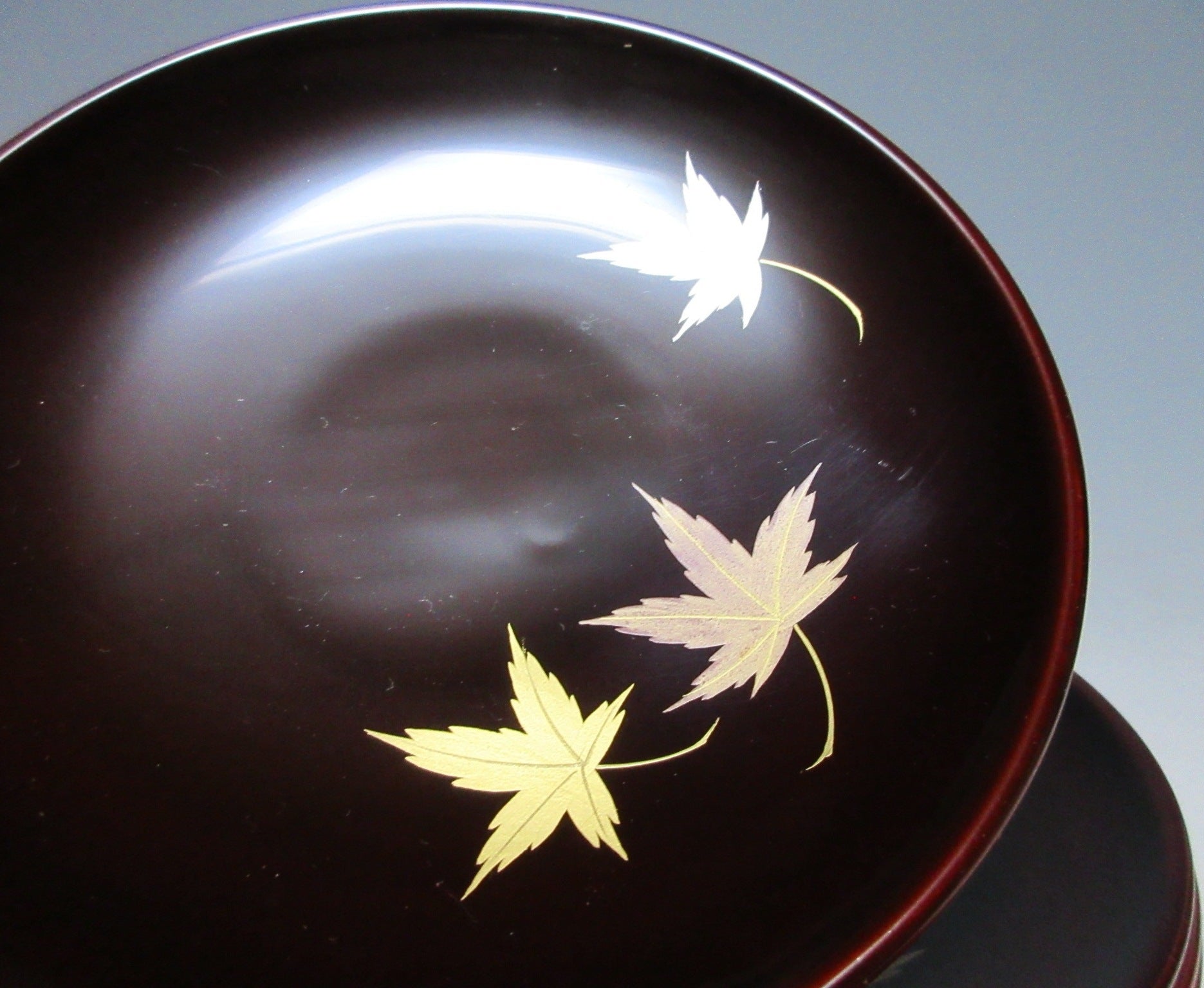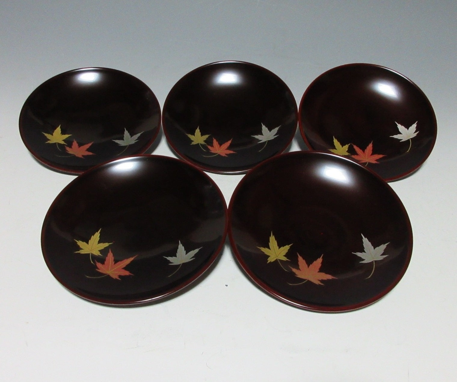 This listing is for a set of five small Aizu-nuri lacquerware plates made around 40 years ago by Kato Takeo. They are made of wood and each plate is decorated with makie momiji leaves over a brown lacquered base. This is a beautiful set of plates for serving sweets, and they come with their original paper storage box. They also come with a Japanese language profile paper.