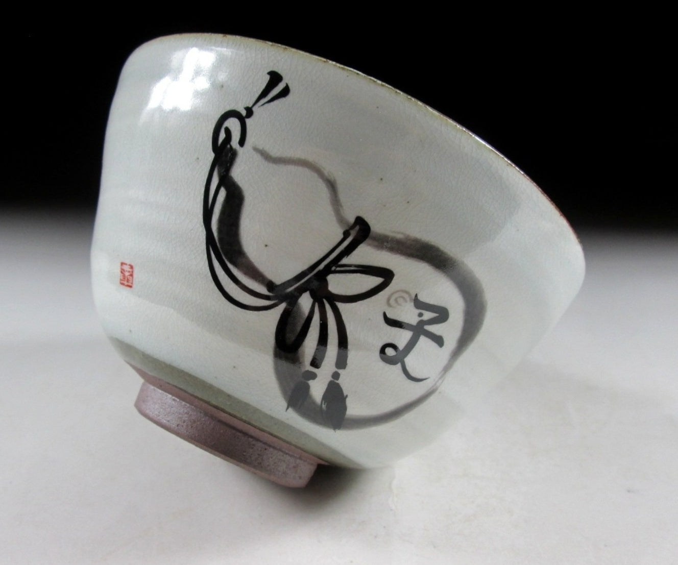 This listing is for a very pleasant Mino-ware chawan made around 30 years ago by Kato Tohzan. It is wheel-thrown and decorated with a hand-painted hyotan design. The kanji on the hyotan reads as ‘ko’ . The hyotan, or gourd in English, is an auspicious symbol thought to represent longevity and magical power. Gourds were traditionally portrayed as magical tools for capturing giant catfish, because according to Japanese folklore, earthquakes were caused by thrashing about of these giant fish. It’s a beautiful piece, and the signature of the potter can be found on the bottom. *PLEASE NOTE THAT THE CHASEN TEA WHISK IS NOT INCLUDED.