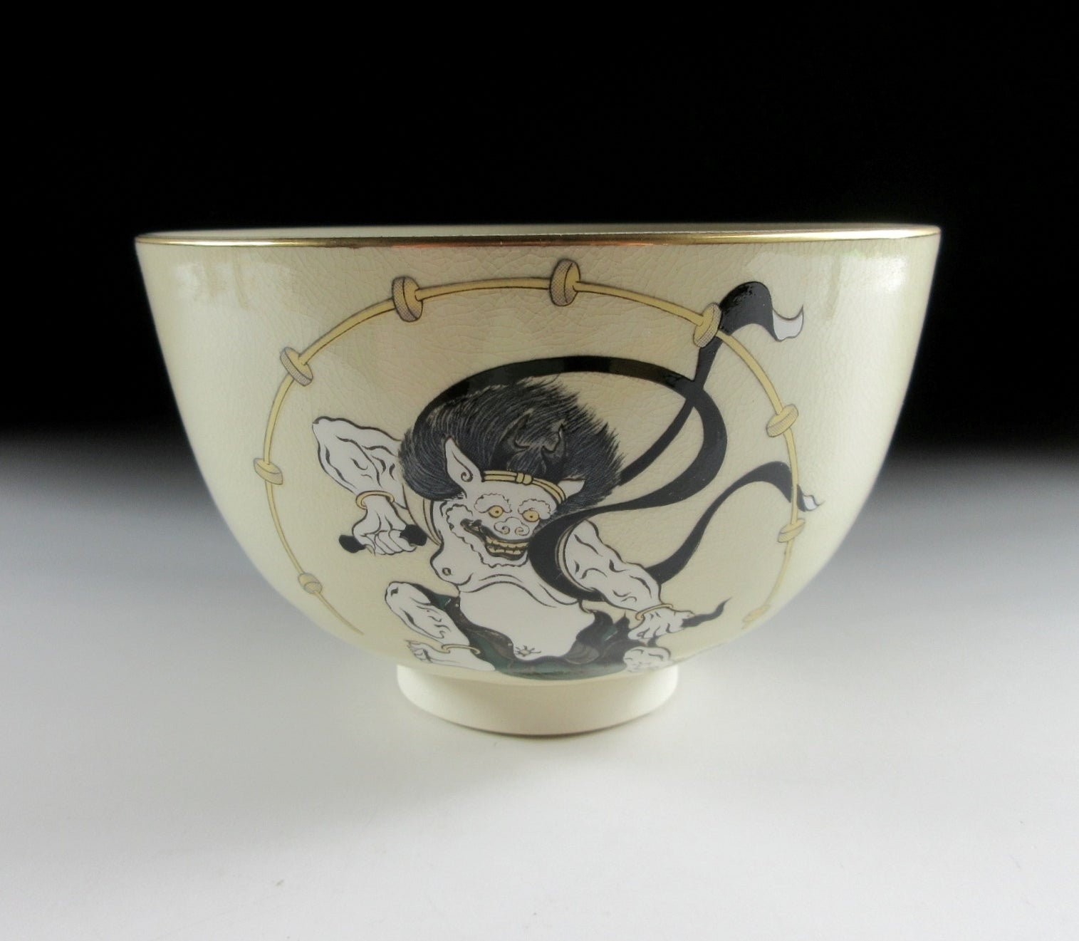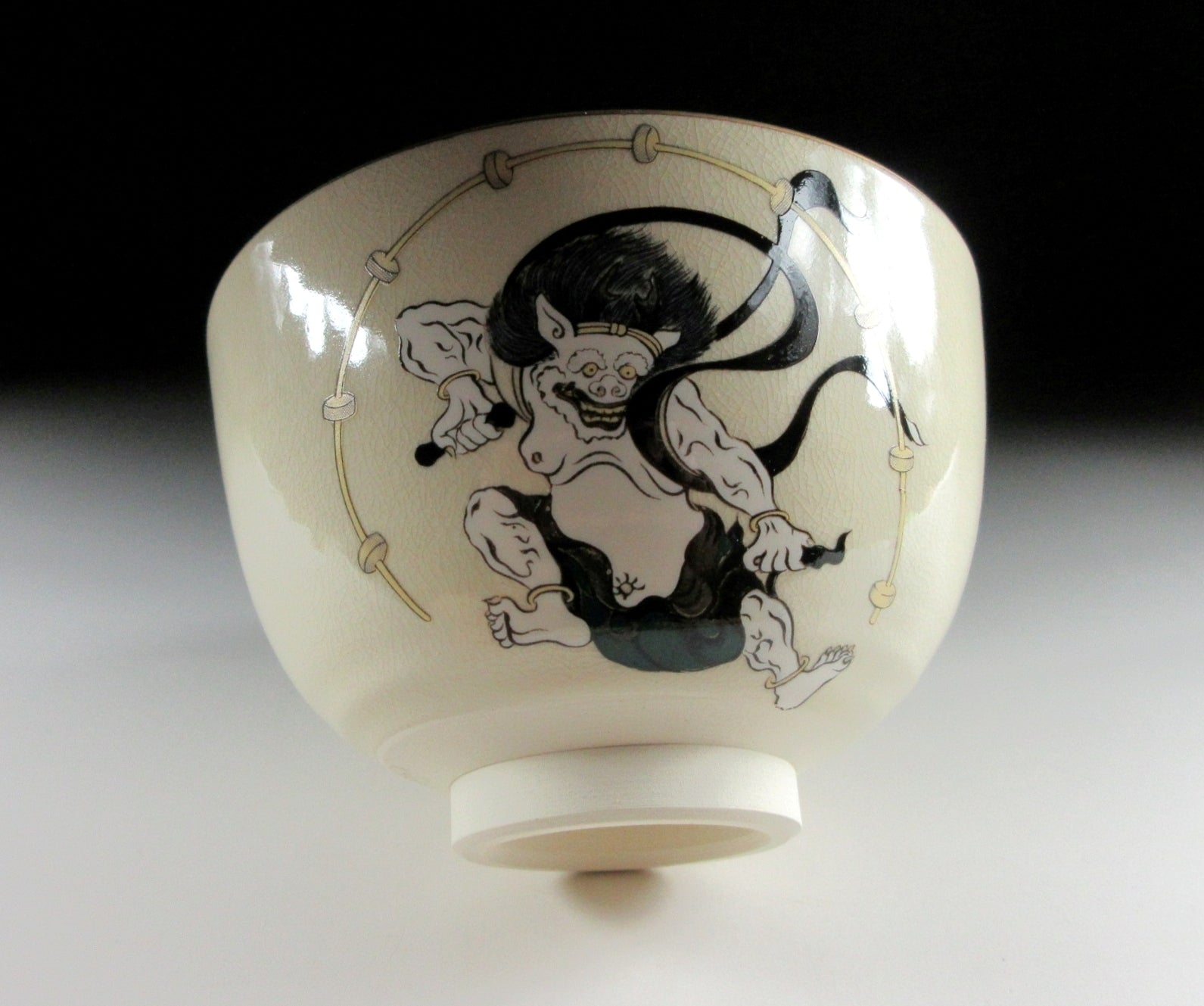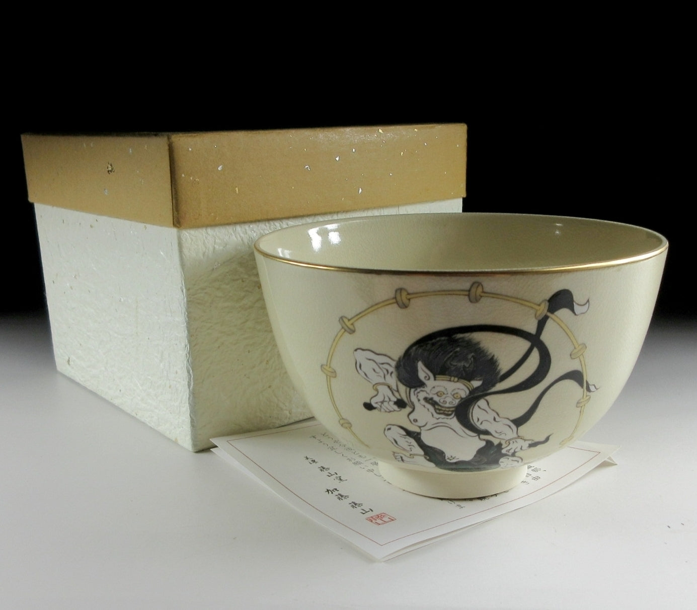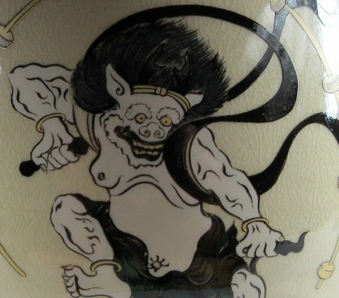 This listing is for a Mino-ware chawan made around 5 years by Kato Tohzan. It is wheel-thrown and the front is decorated with Raijin, the God of Thunder. This piece was made to commemorate the 400th anniversary of the birth of the Rimpa School, founded by Koetsu Hon’ami and Sotatsu Tawaraya, and developed by the brothers Ogata Korin and Kenzan. “Wind God and Thunder God” is one of Sotatsu’s most notable paintings, and this chawan pays homage to the masterpiece. Please note that the image of Raijin is NOT hand-painted, it was applied using a transfer. The stamp of the potter can be found on the bottom, and it comes with its original paper storage box.