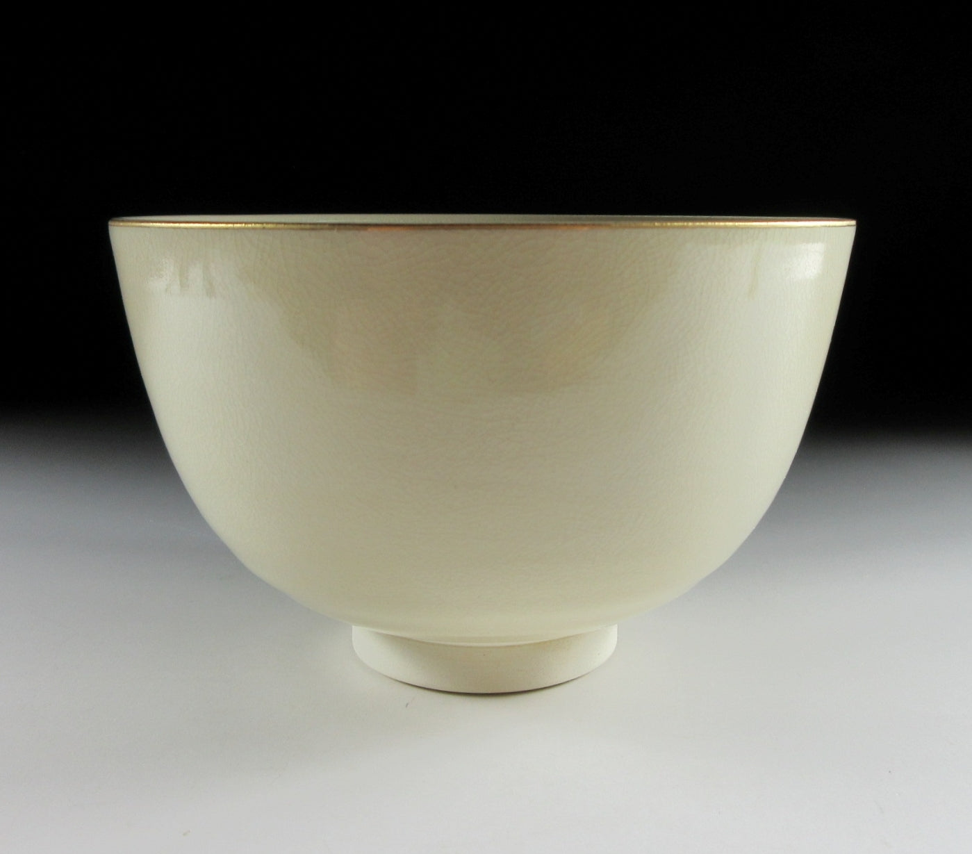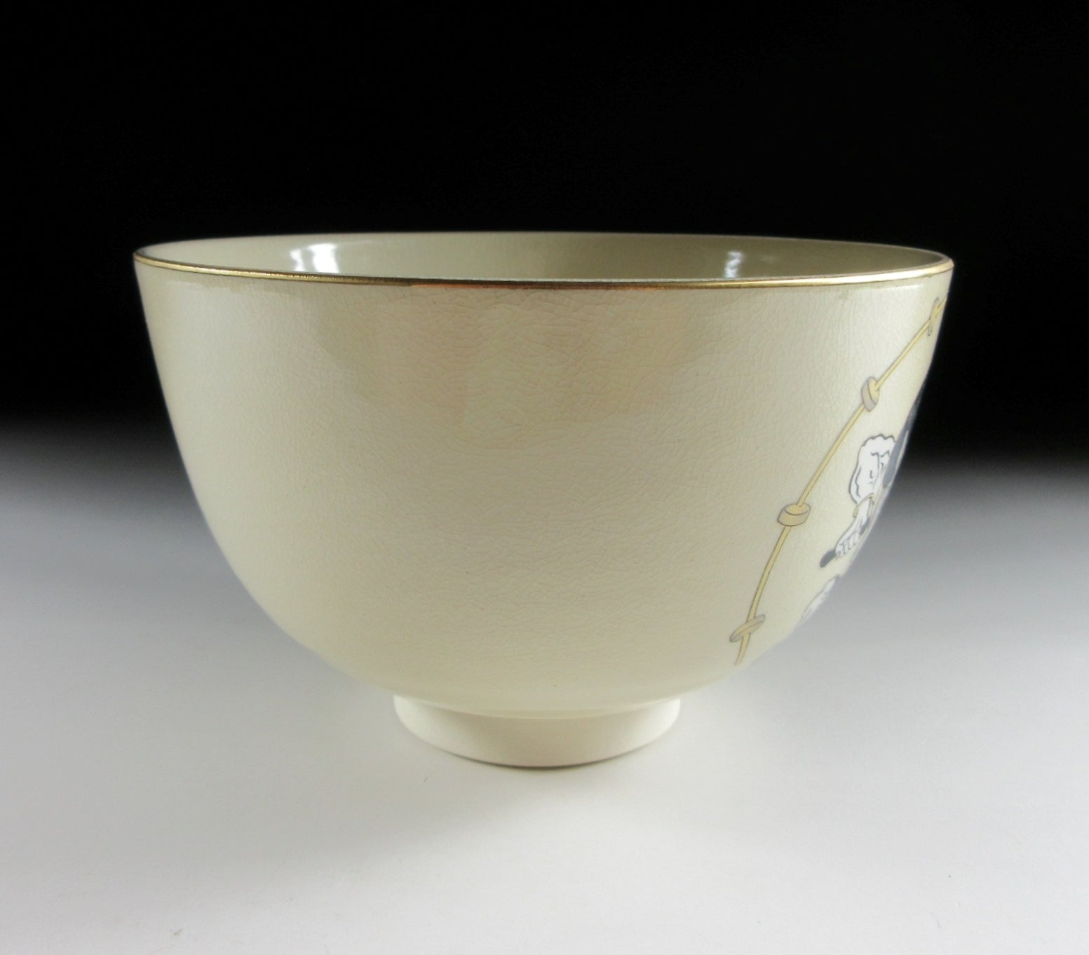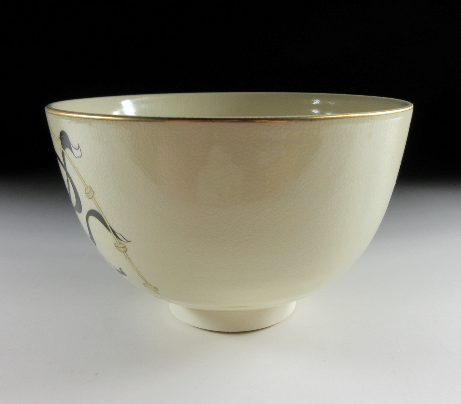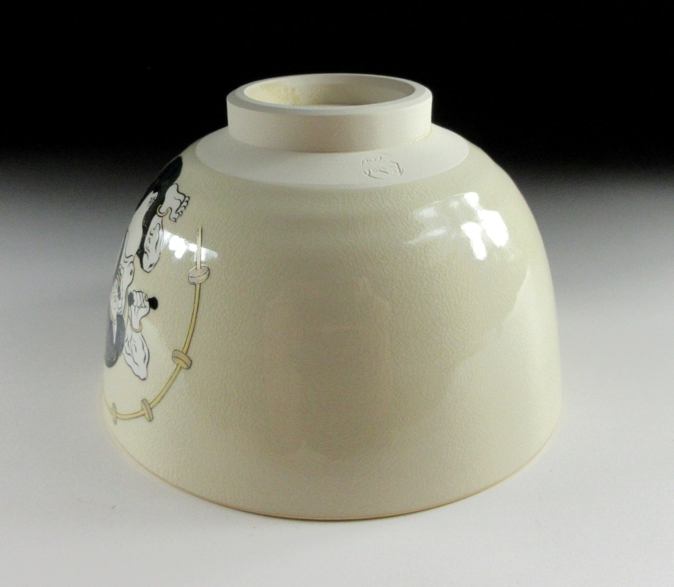 This listing is for a Mino-ware chawan made around 5 years by Kato Tohzan. It is wheel-thrown and the front is decorated with Raijin, the God of Thunder. This piece was made to commemorate the 400th anniversary of the birth of the Rimpa School, founded by Koetsu Hon’ami and Sotatsu Tawaraya, and developed by the brothers Ogata Korin and Kenzan. “Wind God and Thunder God” is one of Sotatsu’s most notable paintings, and this chawan pays homage to the masterpiece. Please note that the image of Raijin is NOT hand-painted, it was applied using a transfer. The stamp of the potter can be found on the bottom, and it comes with its original paper storage box.