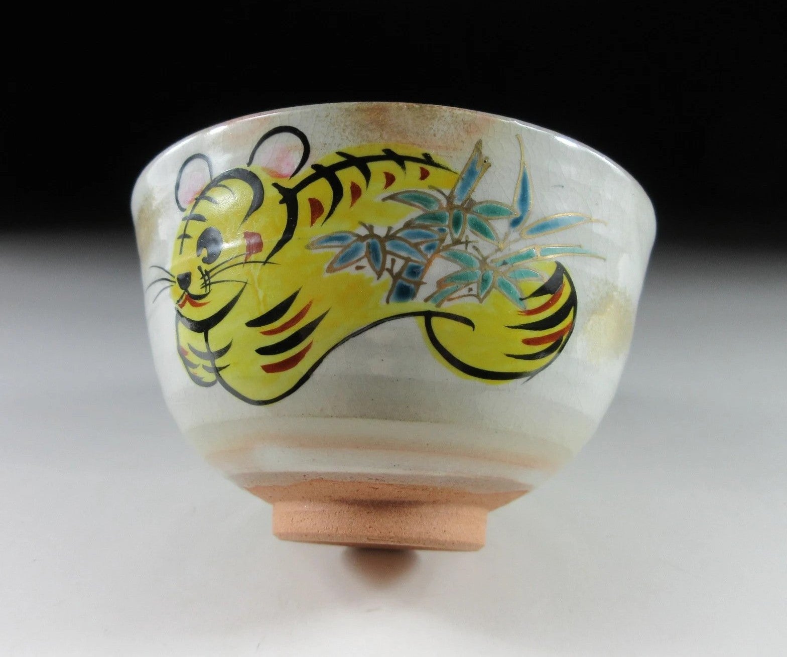 This listing is for a Mino-ware chawan tea bowl made around 20 years ago by Kato Tohzan. It is wheel-thrown and decorated with a yellow tiger and some bamboo over a high-fired stoneware base. This piece also features gohonte markings. Gohonte refers to the pale spots that appear on the pottery due to the natural reactions from the iron found in the clay when being fired in the kiln. This piece was most likely made to commemorate the Year of the Tiger back in 1998. The stamp of the potter can be found on the bottom, no box for this one sorry. *PLEASE NOTE THAT THE CHASHAKU TEA SCOOP IS NOT INCLUDED.